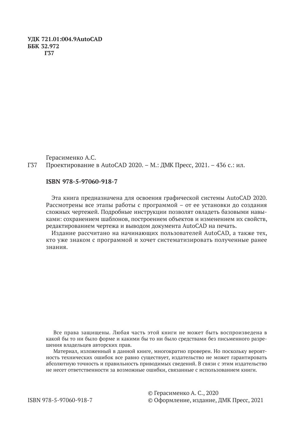 Данная книга рассчитана для начинающих пользователей AutoCAD 2020 и подойдет всем, кто хочет научиться чертить и проектировать на компьютере. В книге описаны все основные стадии создания чертежей – от создания и настройки шаблона чертежа до внесения текста и печати документа. Подробные пошаговые инструкции и четкое изложение помогут быстро и качественно освоить программу и научиться создавать чертежи любой сложности. А опытным пользователям эта книга позволит систематизировать полученные ранее знания и узнать неочевидные приемы создания чертежей.