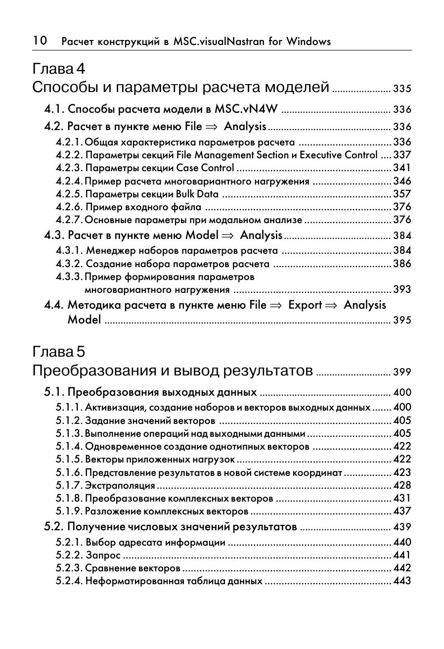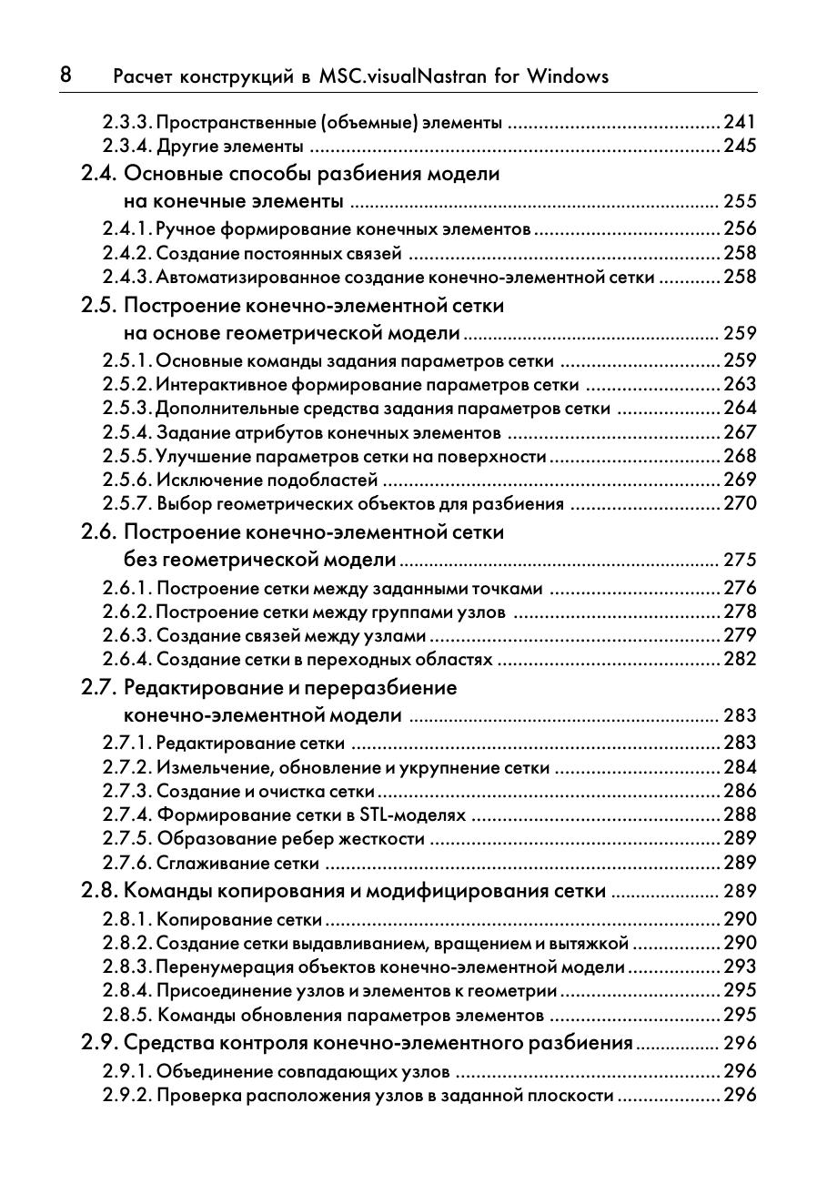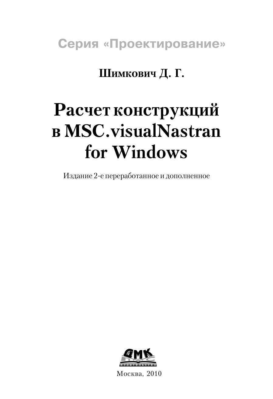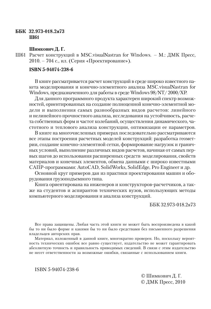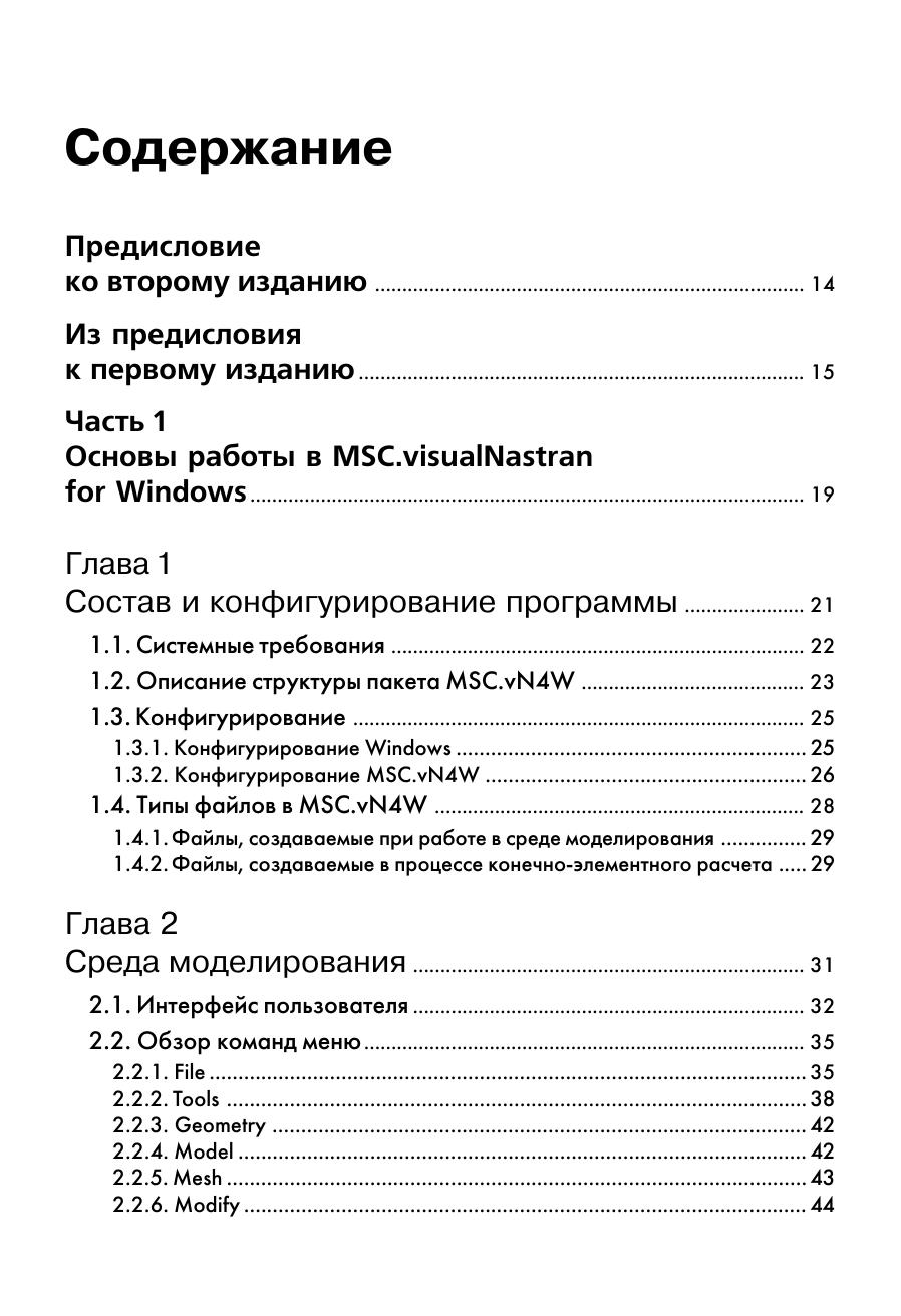 В книге рассматривается расчет конструкций в среде широко известного пакета моделирования и конечно-элементного анализа MSC.visualNastran for Windows, предназначенного для работы в среде Windows 98/NT/ 2000/XP. Для данного программного продукта характерен широкий спектр возможностей, ориентированных на создание полноценной конечно элементной модели и выполнения самых разнообразных видов расчетов: линейного и нелинейного прочностного анализа, исследования на устойчивость, расчета собственных форм и частот колебаний, осуществления динамического, частотного и теплового анализа конструкции, оптимизации ее параметров. В книге на многочисленных примерах последовательно рассматриваются все этапы построения расчетных моделей конструкций: разработка геометрии, создание конечно элементной сетки, формирование нагрузок и граничных условий, выполнение различных видов расчетов, начиная от самых первых шагов до использования расширенных средств моделирования, свойств материалов и конечных элементов, обмена данными с широко известными САПР программами: AutoCAD, SolidWorks, SolidEdge, Pro Engineer и др. Основной круг примеров дан из практики проектирования машин и оборудования грузоподъемного типа. Книга ориентирована на инженеров и конструкторов расчетчиков, а также на студентов и аспирантов технических вузов, использующих методы компьютерного моделирования и анализа конструкций.