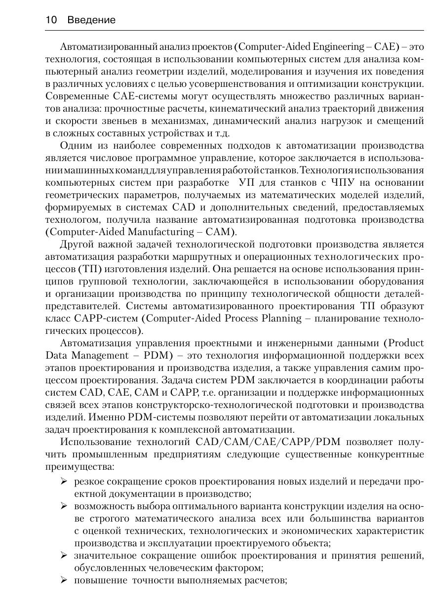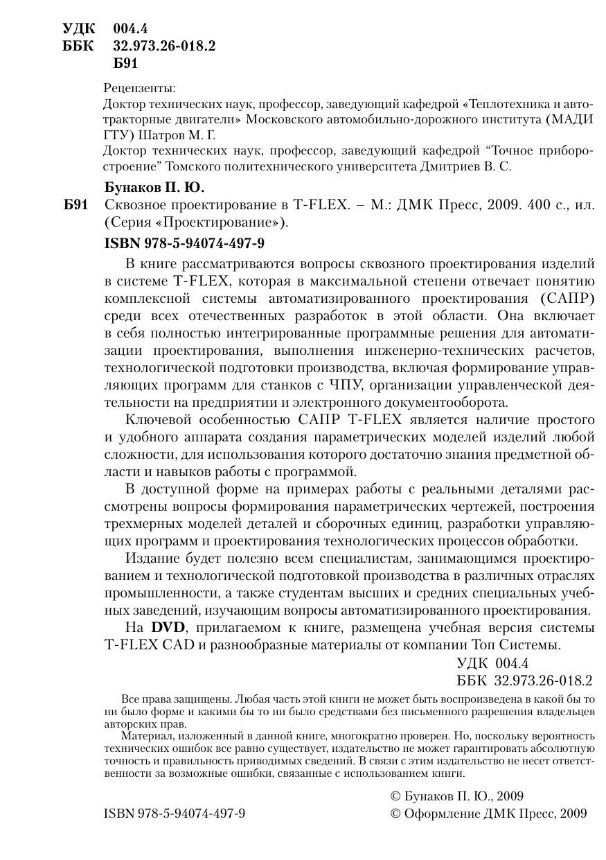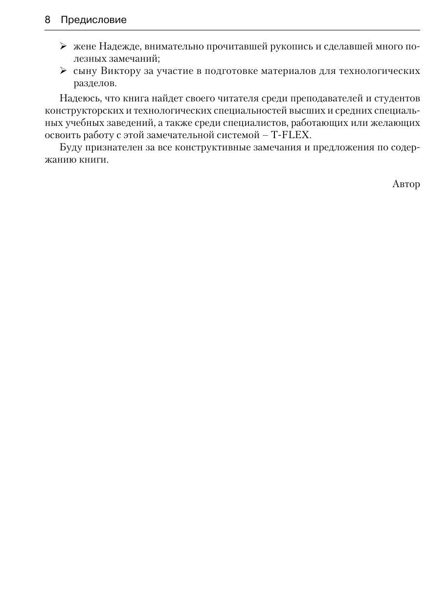 В книге рассматриваются вопросы сквозного проектирования изделий в системе T-FLEX, которая в максимальной степени отвечает понятию комплексной системы автоматизированного проектирования (САПР) среди всех отечественных разработок в этой области. Она включает в себя полностью интегрированные программные решения для автоматизации проектирования, выполнения инженерно-технических расчетов, технологической подготовки производства, включая формирование управляющих программ для станков с ЧПУ, организации управленческой деятельности на предприятии и электронного документооборота. Ключевой особенностью САПР T-FLEX является наличие простого и удобного аппарата создания параметрических моделей изделий любой сложности, для использования которого достаточно знания предметной области и навыков работы с программой. В доступной форме на примерах работы с реальными деталями рассмотрены вопросы формирования параметрических чертежей, построения трехмерных моделей деталей и сборочных единиц, разработки управляющих программ и проектирования технологических процессов обработки. Издание будет полезно всем специалистам, занимающимся проектированием и технологической подготовкой производства в различных отраслях промышленности, а также студентам высших и средних специальных учебных заведений, изучающим вопросы автоматизированного проектирования.