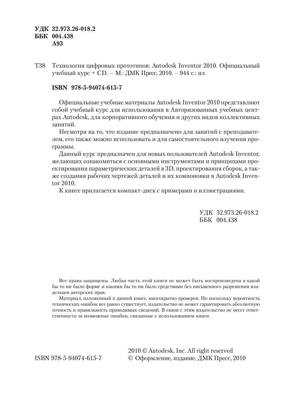 Официальные учебные материалы Autodesk Inventor 2010 представляют собой учебный курс для использования в Авторизованных учебных центрах Autodesk, для корпоративного обучения и других видов коллективных занятий. Несмотря на то, что издание предназначено для занятий с преподавателем, его также можно использовать и для самостоятельного изучения программы. Данный курс предназначен для новых пользователей Autodesk Inventor, желающих ознакомиться с основными инструментами и принципами проектирования параметрических деталей в 3D, проектирования сборок, а также создания рабочих чертежей деталей и их компоновки в Autodesk Inventor 2010.