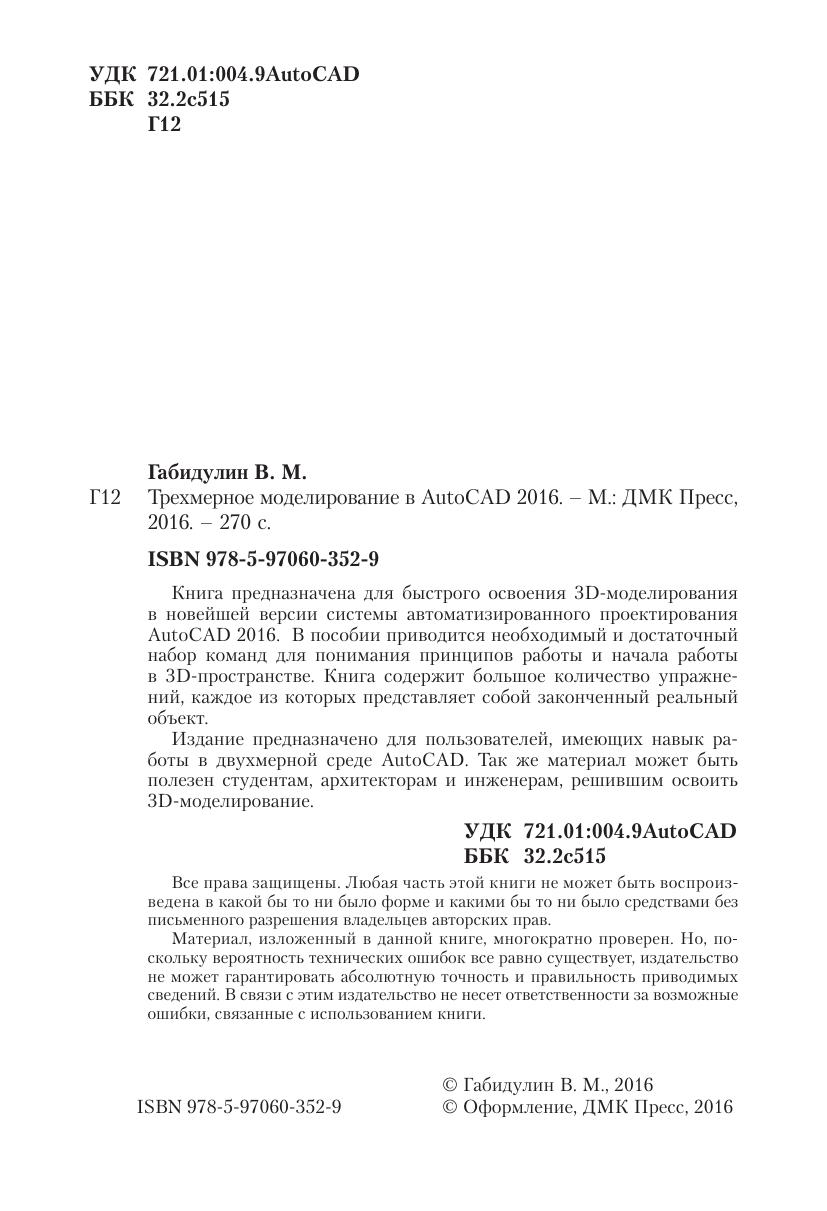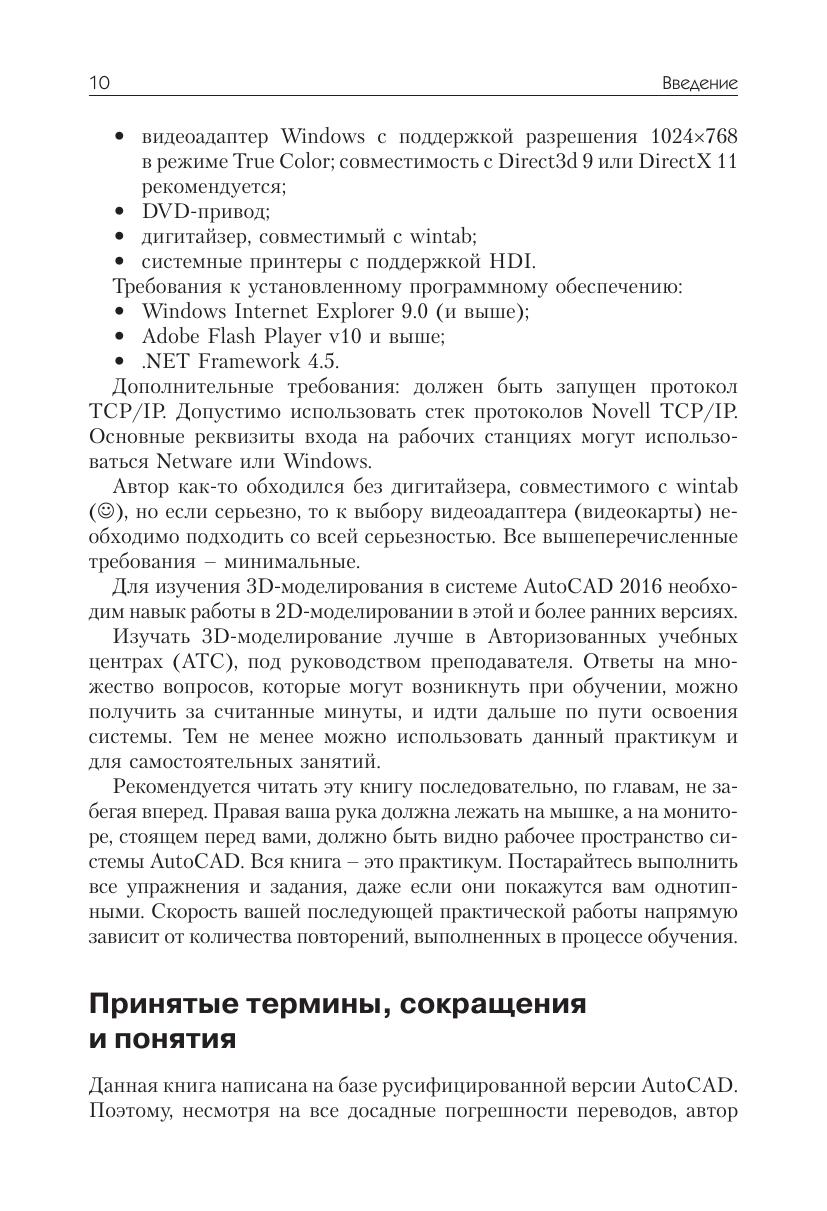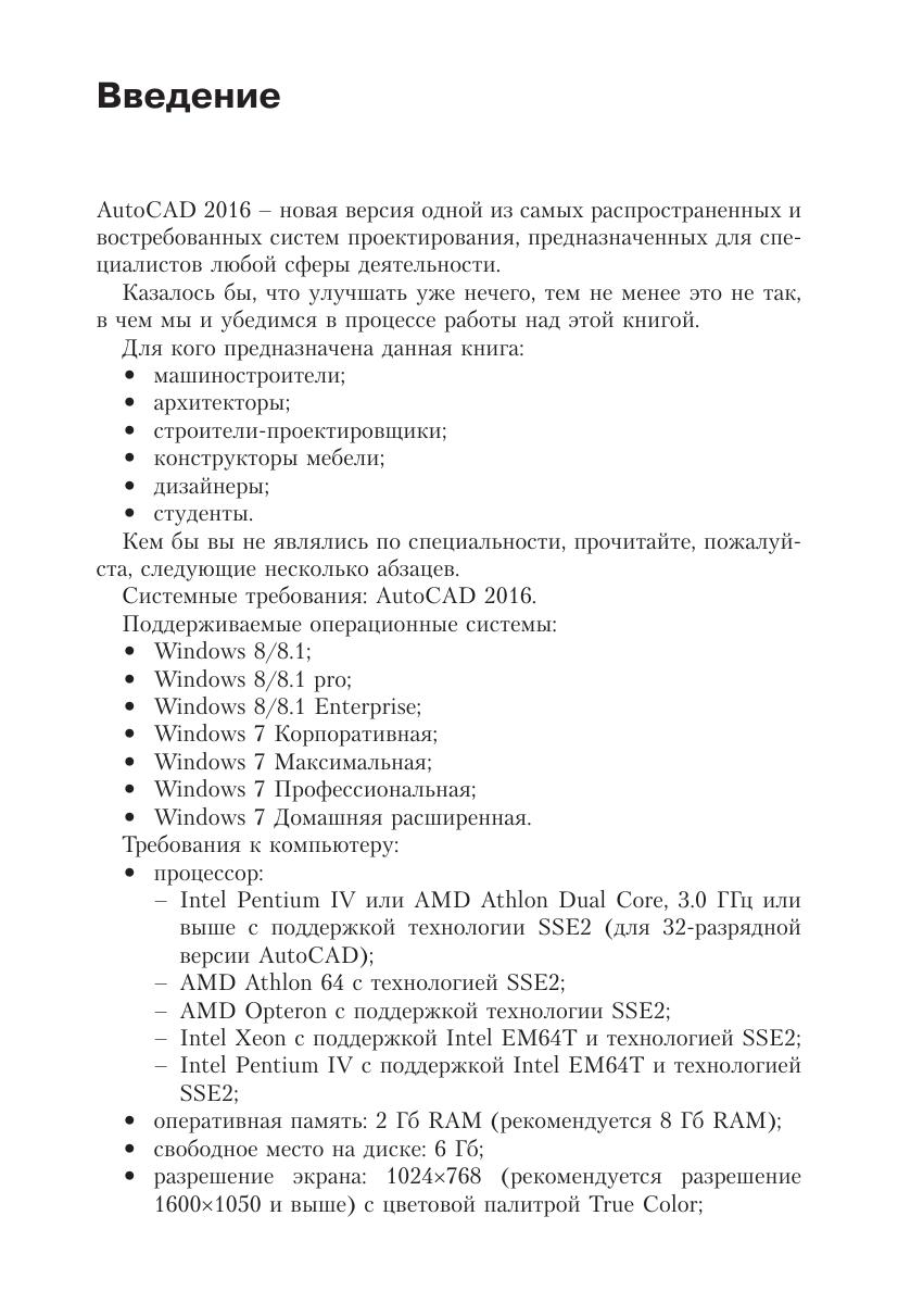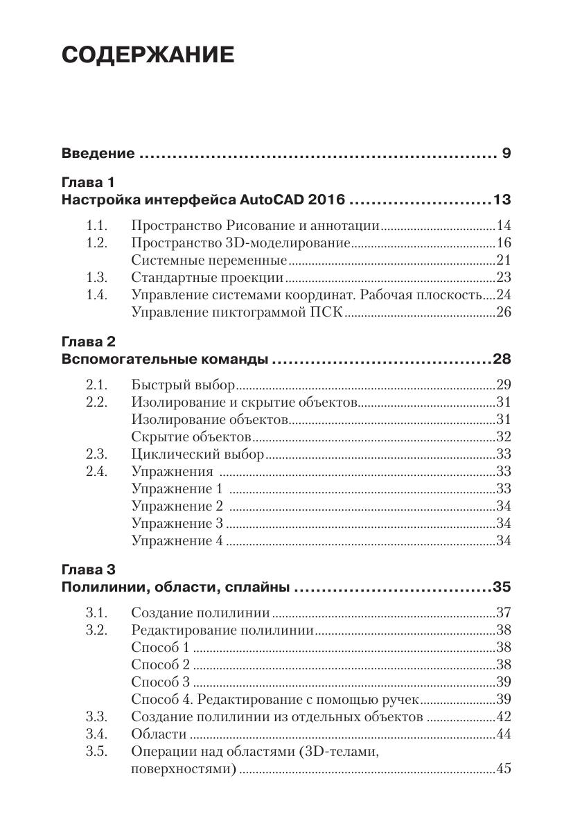 Книга предназначена для быстрого освоения 3D-моделирования в новейшей версии системы автоматизированного проектирования AutoCAD 2016. В пособии приводится необходимый и достаточный набор команд для понимания принципов работы и начала работы в 3D-пространстве. Книга содержит большое количество упражнений, каждое из которых представляет собой законченный реальный объект. Издание предназначено для пользователей, имеющих навык работы в двухмерной среде AutoCAD. Так же материал может быть полезен студентам, архитекторам и инженерам, решившим освоить 3D-мо делирование.