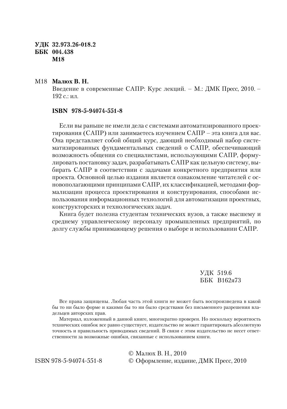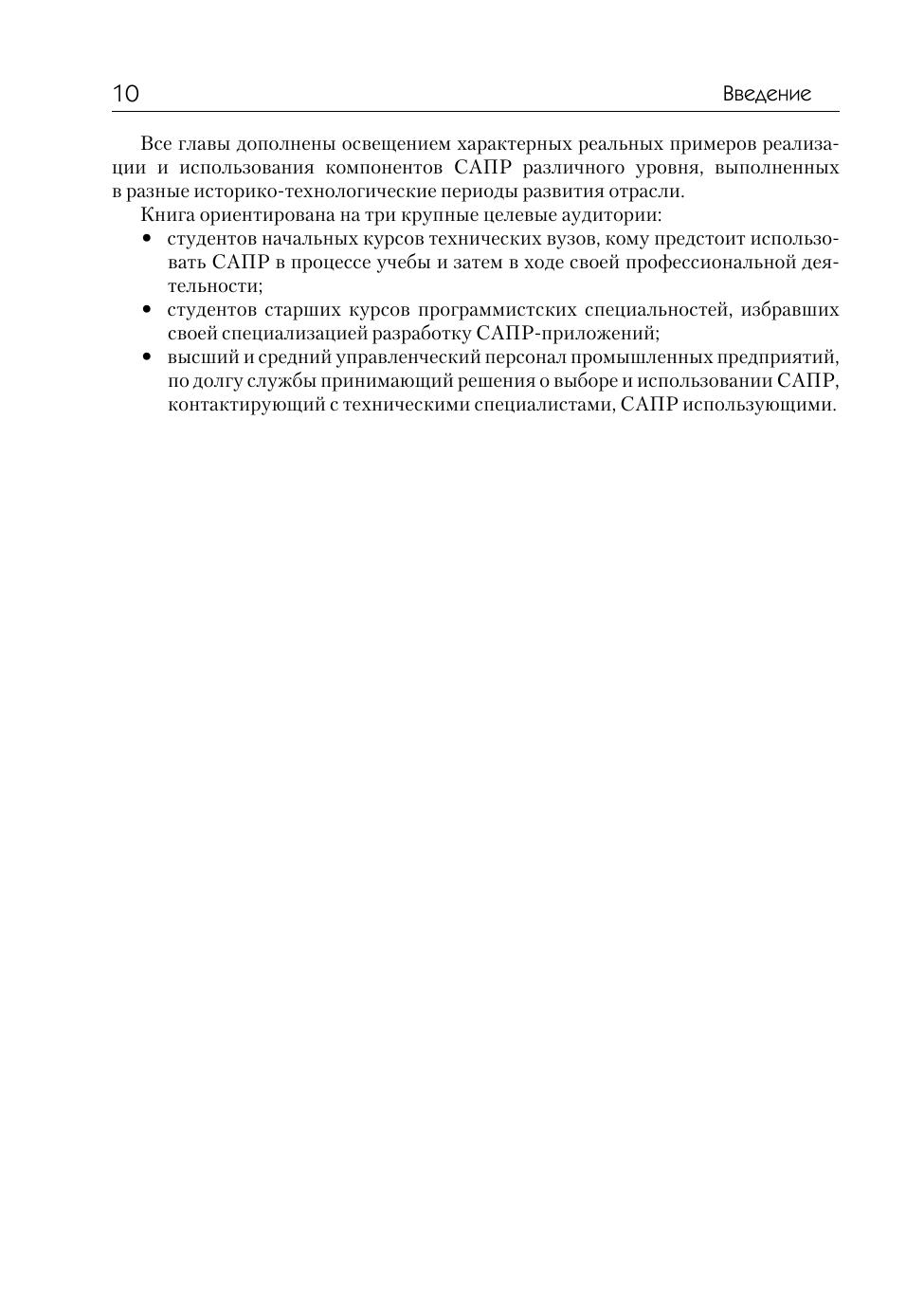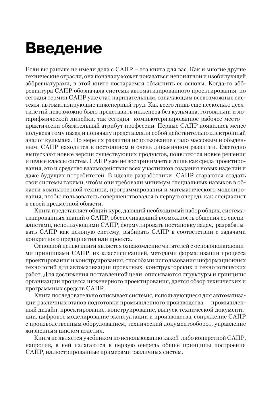 Если вы раньше не имели дела с системами автоматизированного проектирования (САПР) или занимаетесь изучением САПР – эта книга для вас. Она представляет собой общий курс, дающий необходимый набор систематизированных фундаментальных сведений о САПР, обеспечивающий возможность общения со специалистами, использующими САПР, формулировать постановку задач, разрабатывать САПР как цельную систему, выбирать САПР в соответствии с задачами конкретного предприятия или проекта. Основной целью издания является ознакомление читателей с основополагающими принципами САПР, их классификацией, методами формализации процесса проектирования и конструирования, способами использования информационных технологий для автоматизации проектных, конструкторских и технологических задач. Книга будет полезна студентам технических вузов, а также высшему и среднему управленческому персоналу промышленных предприятий, по долгу службы принимающему решения о выборе и использовании САПР.