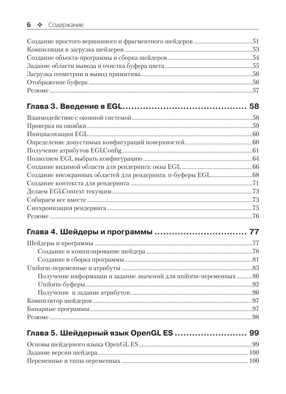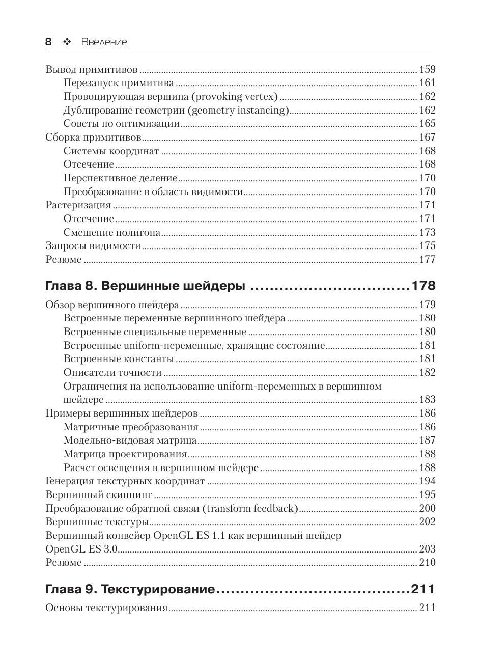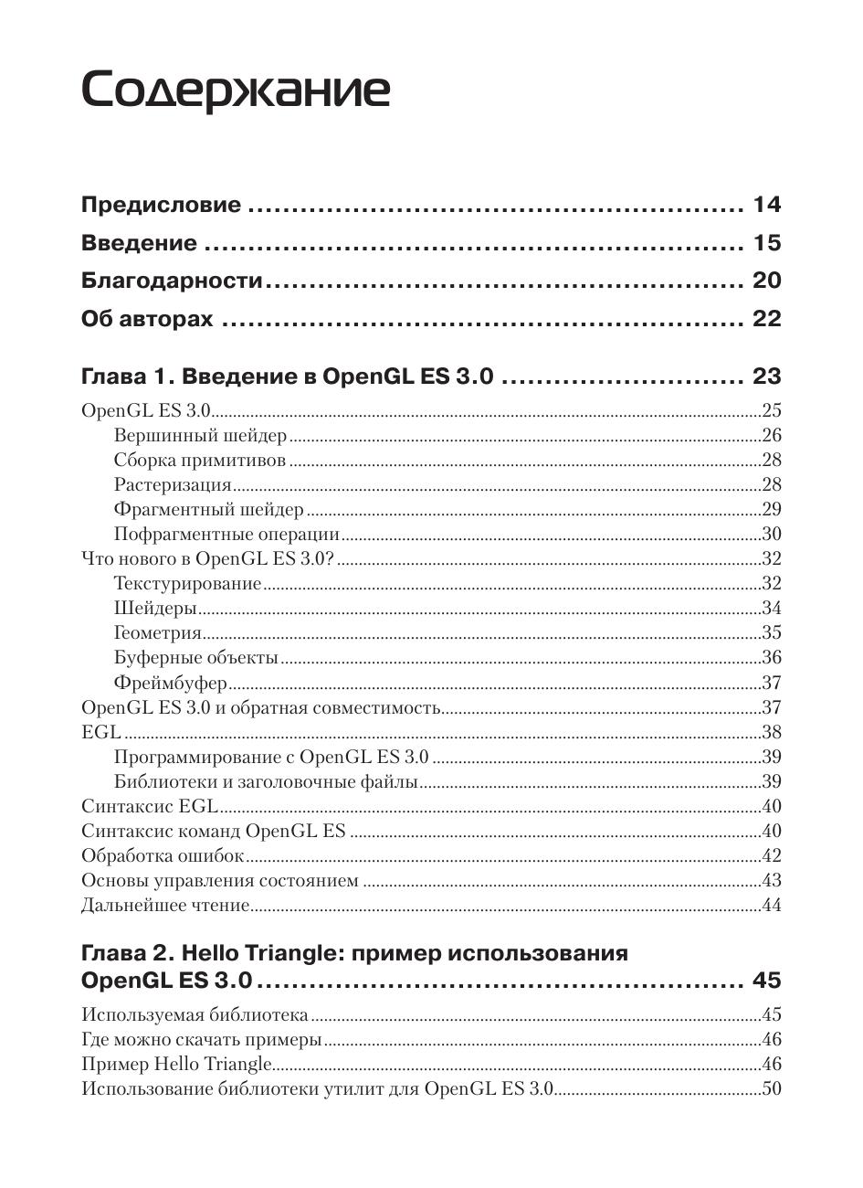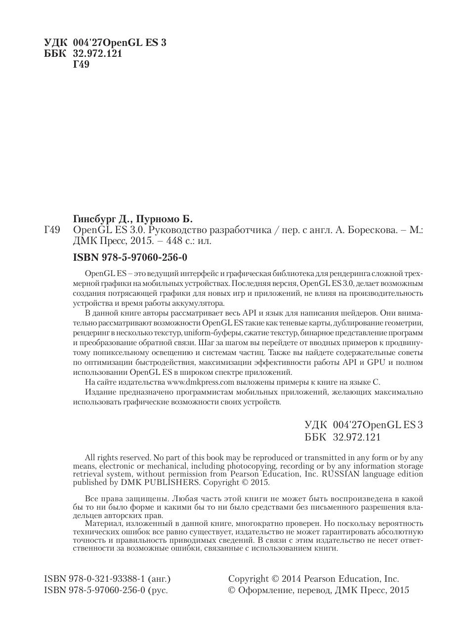 OpenGL ES – это ведущий интерфейс и графическая библиотека для рендеринга сложной трехмерной графики на мобильных устройствах. Последняя версия, OpenGL ES 3.0, делает возможным создания потрясающей графики для новых игр и приложений, не влияя на производительность устройства и время работы аккумулятора. В данной книге авторы рассматривает весь API и язык для написания шейдеров. Они внимательно рассматривают возможности OpenGL ES такие как теневые карты, дублирование геометрии, рендеринг в несколько текстур, uniform-буферы, сжатие текстур, бинарное представление программ и преобразование обратной связи. Шаг за шагом вы перейдете от вводных примеров к продвинутому попиксельному освещению и системам частиц. Также вы найдете содержательные советы по оптимизации быстродействия, максимизации эффективности работы API и GPU и полном использовании OpenGL ES в широком спектре приложений. На сайте издательства www.dmkpress.com выложены примеры к книге на языке С. Издание предназначено программистам мобильных приложений, желающих максимально использовать графические возможности своих устройств.