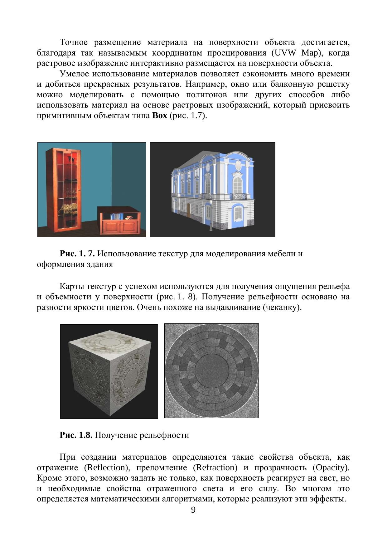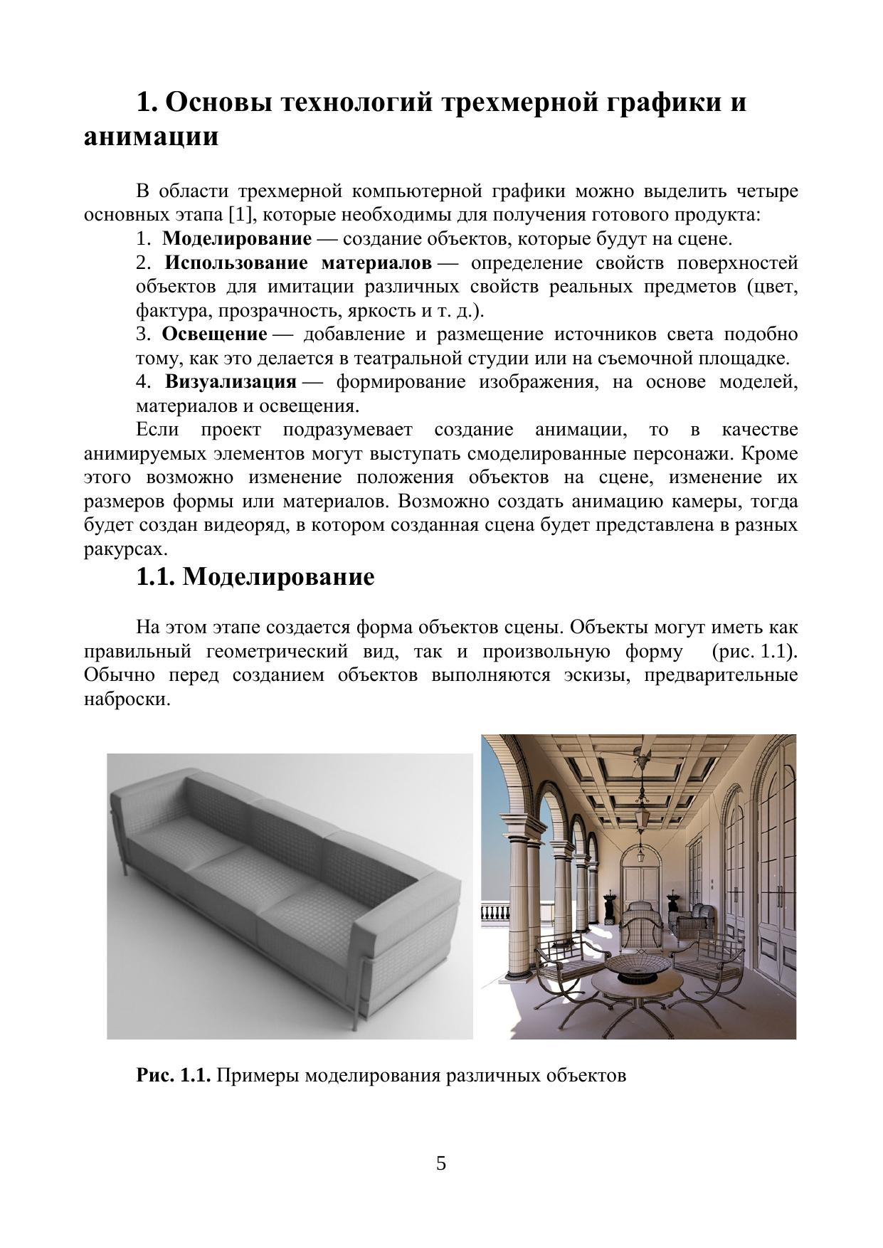 Учебное пособие дает читателю общие сведения об основах 3D моделирования и визуализации. В качестве среды разработки рассматривается наиболее распространенный и мощный пакет 3ds Max компании Autodesk. Описана система помощи, интерфейс и настройка рабочей среды программы. Рассматриваются базовые понятия 3D моделирования – примитивные параметрические объекты, глобальная и локальная системы координат, позиционирование объектов, создание групп объектов, изменение параметров. Отдельные главы посвящены процессу создания 3d моделей на основе плоских форм (модификаторы Extrude, Lathe, Loft), основам полигонального моделирования. Рассмотрены вопросы использования библиотек материалов, разработки своих материалов (органические поверхности, стекло, зеркало) и применения их поверхностям моделей. Даны сведения об использовании источников света и применении атмосферных эффектов.