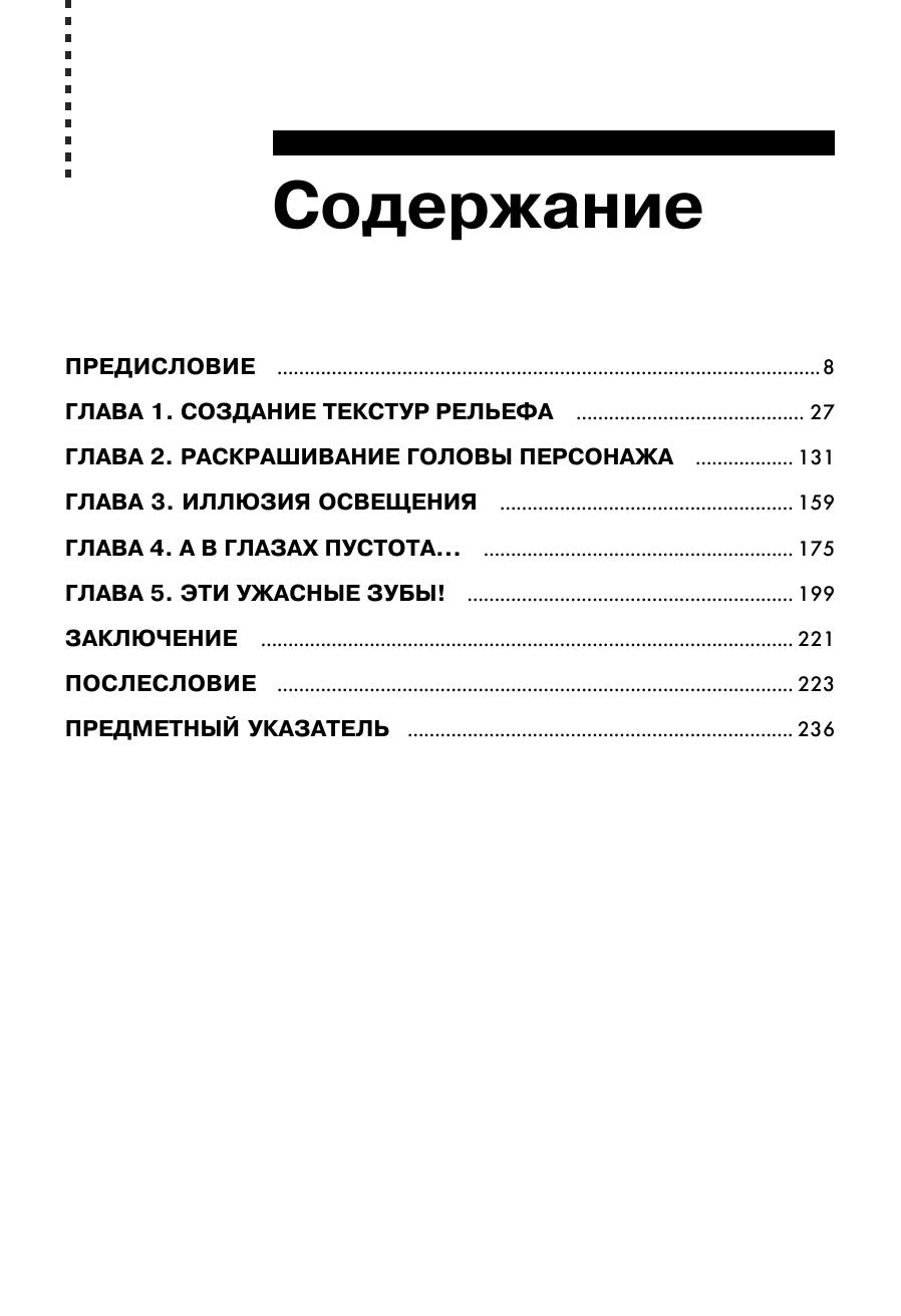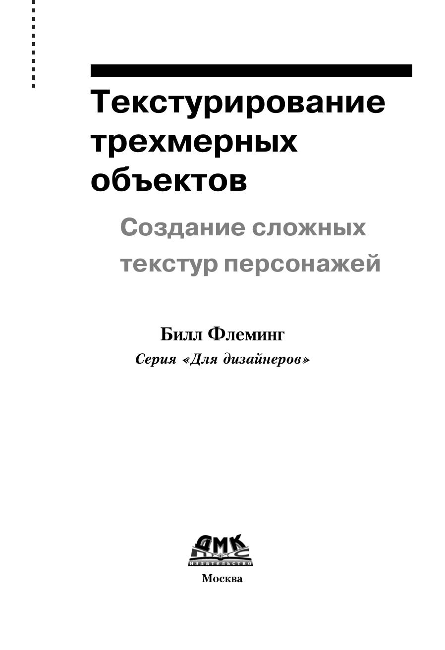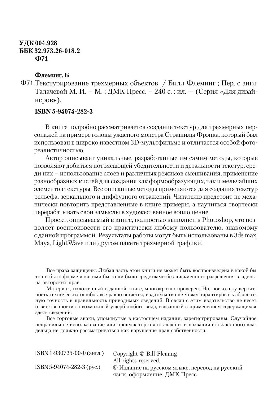 В книге подробно рассматривается создание текстур для трехмерных персонажей на примере головы ужасного монстра Страшилы Фрэнка, который был использован в широко известном 3D-мультфильме и отличается особой фотореалистичностью. Автор описывает уникальные, разработанные им самим методы, которые позволяют добиться потрясающей убедительности и детальности текстур, среди них – использование слоев и различных режимов смешивания, применение разнообразных кистей для создания как формообразующих, так и мельчайших элементов текстуры. Все описанные методы применяются для создания текстур рельефа, зеркального и диффузного отражений. Читателю предстоит не механически повторить представленные в книге примеры, а научиться творчески перерабатывать свои замыслы в художественное воплощение. Проект, описываемый в книге, полностью выполнен в Photoshop, что позволяет воспроизвести его практически любому пользователю, знакомому с данной программой. Результаты работы могут быть использованы в 3ds max, Maya, LightWave или другом пакете трехмерной графики.