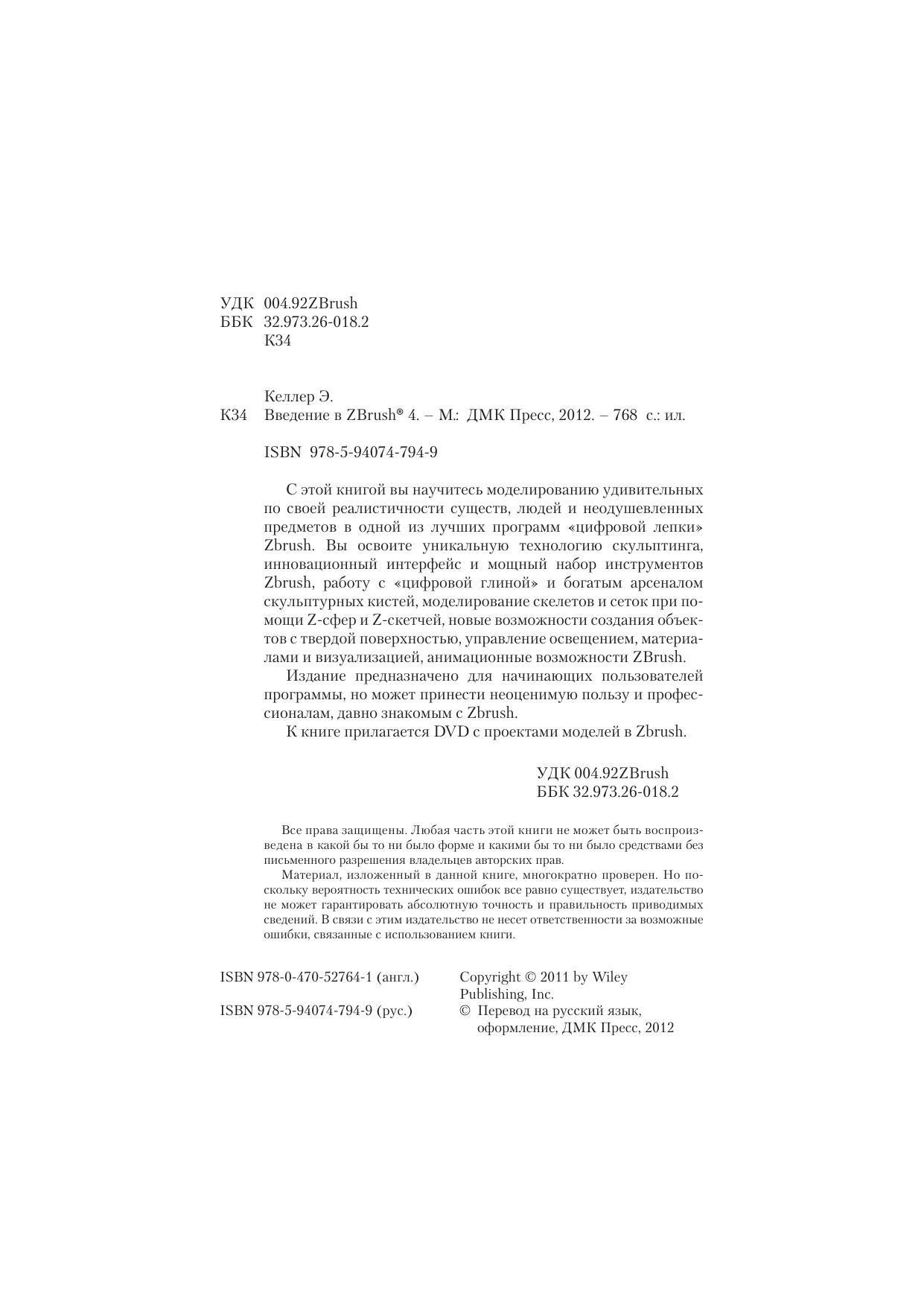 С этой книгой вы научитесь моделированию удивительных по своей реалистичности существ, людей и неодушевленных предметов в одной из лучших программ «цифровой лепки» Zbrush. Вы освоите уникальную технологию скульптинга, инновационный интерфейс и мощный набор инструментов Zbrush, работу с «цифровой глиной» и богатым арсеналом скульптурных кистей, моделирование скелетов и сеток при помощи Z-сфер и Z-скетчей, новые возможности создания объектов с твердой поверхностью, управление освещением, материалами и визуализацией, анимационные возможности ZBrush. Издание предназначено для начинающих пользователей программы, но может принести неоценимую пользу и профессионалам, давно знакомым с Zbrush. К книге прилагается DVD с проектами моделей в Zbrush.