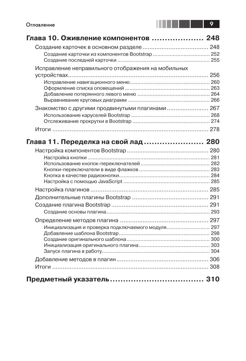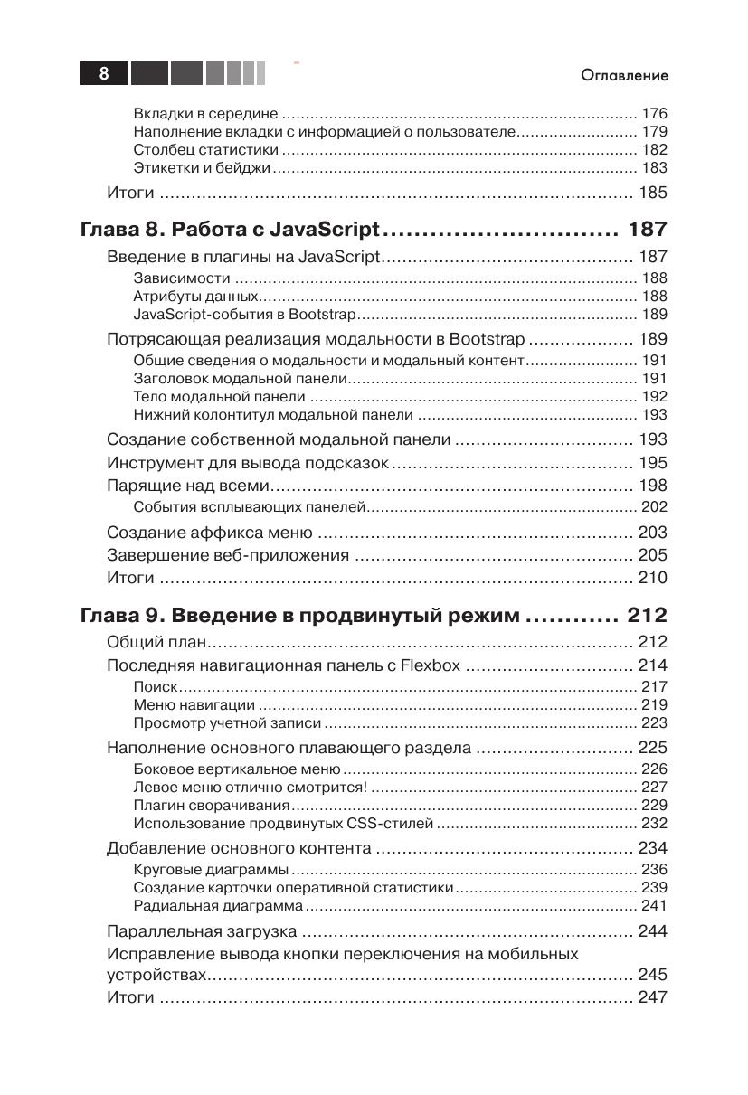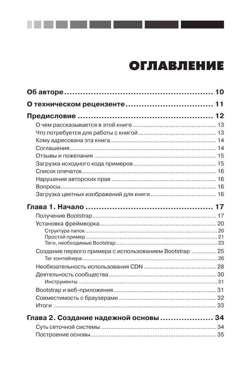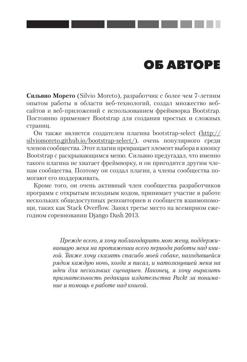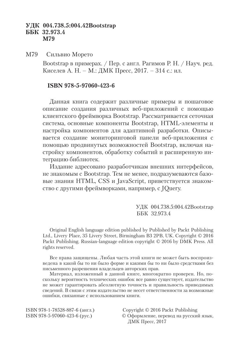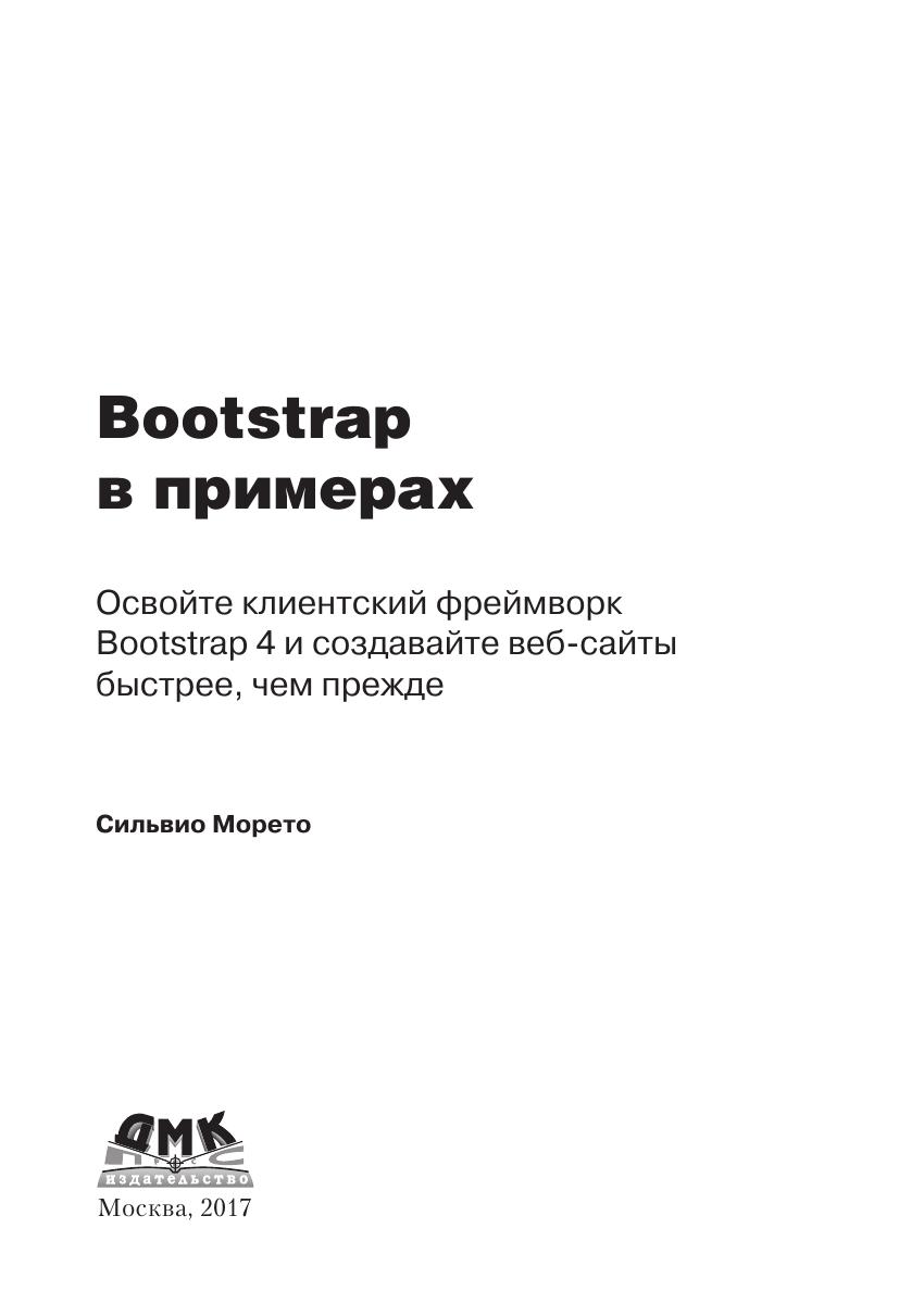Данная книга содержит различные примеры и пошаговое описание создания различных веб-приложений с помощью клиентского фреймворка Bootstrap. Рассматривается сеточная система, основные компоненты Bootstrap, HTML-элементы и настройка компонентов для адаптивной разработки. Описывается создание мониторинговой панели веб-приложения с помощью продвинутых возможностей Bootstrap, включая настройку компонентов, обработку событий и расширенную интеграцию библиотек. Издание адресовано разработчикам внешних интерфейсов, не знакомым с Bootstrap. Тем не менее, подразумеваются базовые знания HTML, CSS и JavaScript, приветствуется знакомство с другими фреймворками, например, с JQuery.