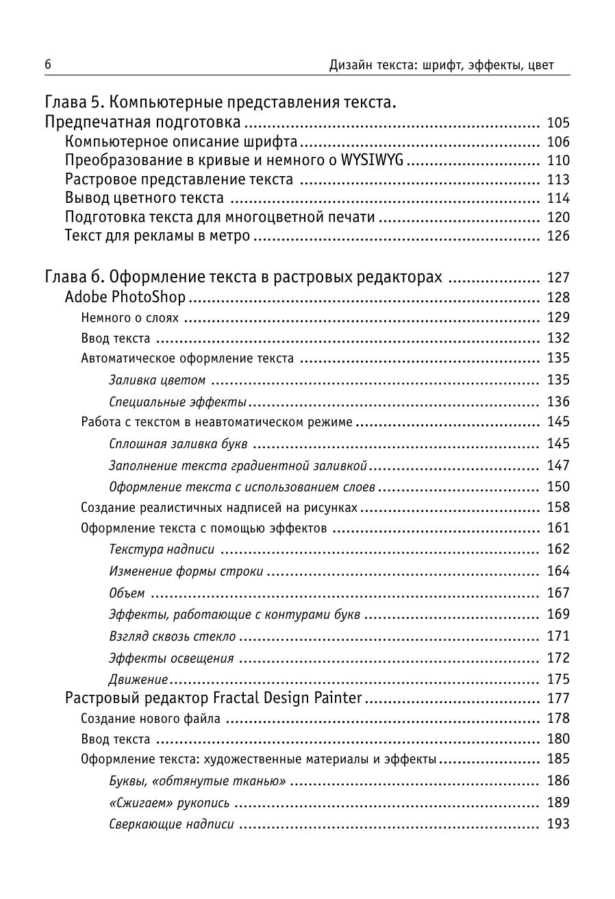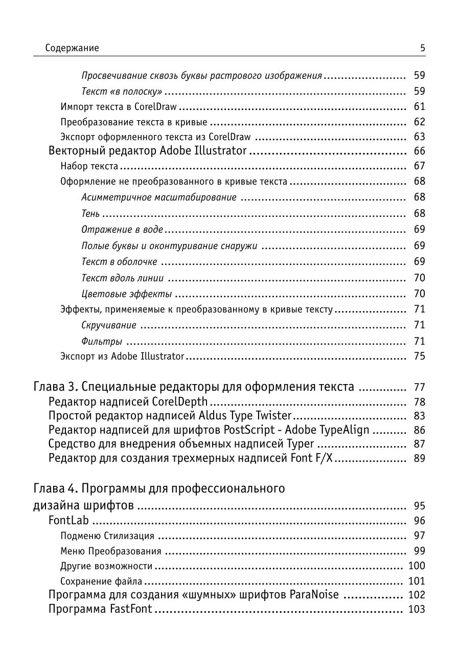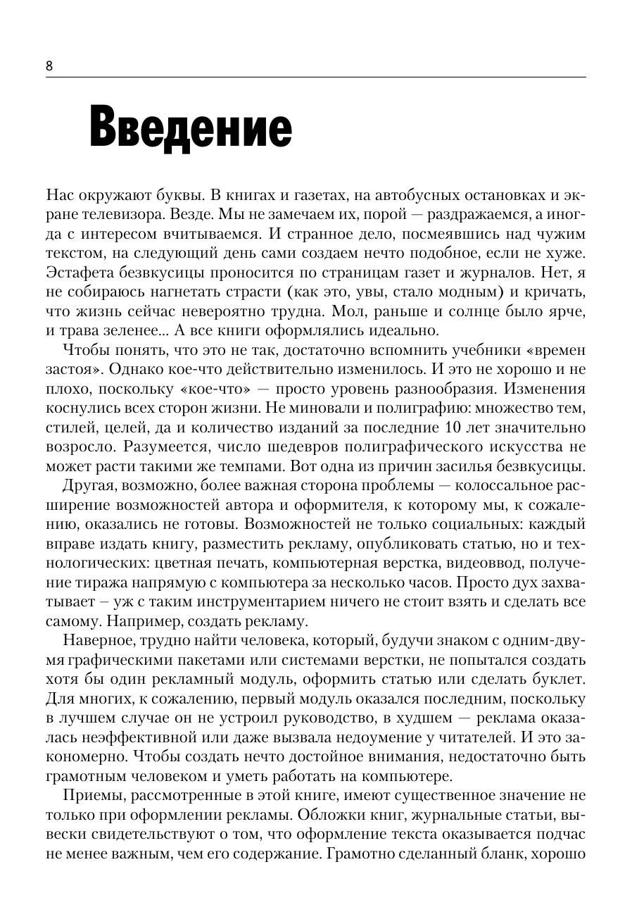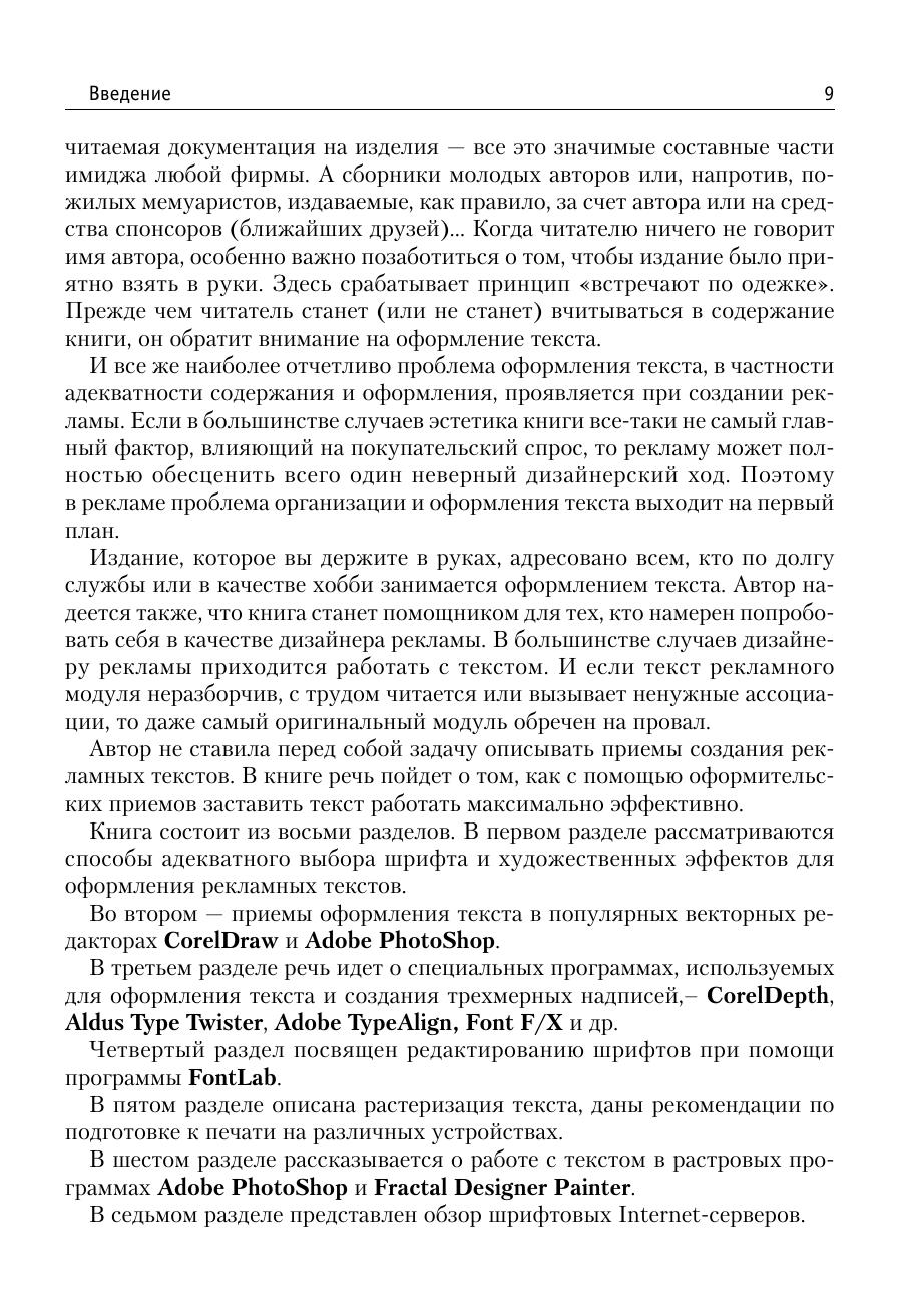 Книга посвящена оформлению текста, в том числе для рекламных целей. Ее задача – помочь дизайнеру, издателю, составителю рекламы в выборе шрифтов, художественных эффектов, приемов оформления, наиболее соответствующих его потребностям. Большинство советов проиллюстрировано конкретными примерами, в том чиле взятыми из печатных изданий последних лет. Подробно, с привлечением большого количества «готовых рецептов», описано создание художественно оформленного текста в десяти различных программах: векторных редакторах CorelDraw и Adobe Illustrator, специальных средствах для оформления текста Corel Depth, Adobe Type Twister и др., программах для создания 3D-надписей Font F/X и Typer, а также в растровых редакторах PhotoShop и Fractal Design Painter. Даются некоторые рекомендации по созданию шрифтов, содержащих художественные эффекты (в том числе и динамически изменяющихся шрифтов), при помощи программ ParaNoise и FontLab. Рассмотрены наиболее распространенные проблемы, в том числе связанные с несовпадением кодировок, растеризацией символов и выводом на печать. Отдельный раздел посвящен шрифтовым Internet серверам и фирмам производителям шрифтов. Приложение содержит краткий каталог существующих на сегодняшний день шрифтов для многоязычной верстки (содержащих шесть и более диапазонов Unicode). Книга представляет интерес как для начинающих, так и для опытных оформителей. Она будет полезна каждому, кто хотя бы изредка занимается версткой или оформлением текстов. Хотя материал некоторых глав рассчитан на достаточно подготовленного пользователя, не требуется обязательного знакомства с основами разработки типографики и глубокого владения графическим пакетами.