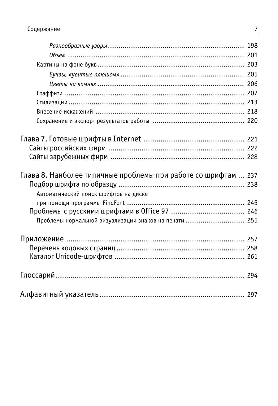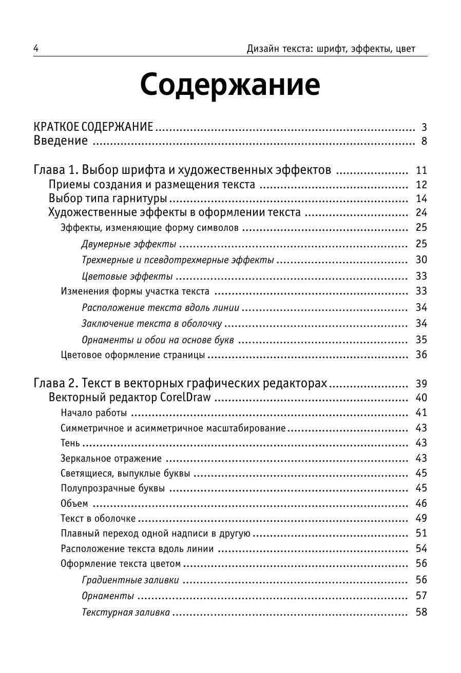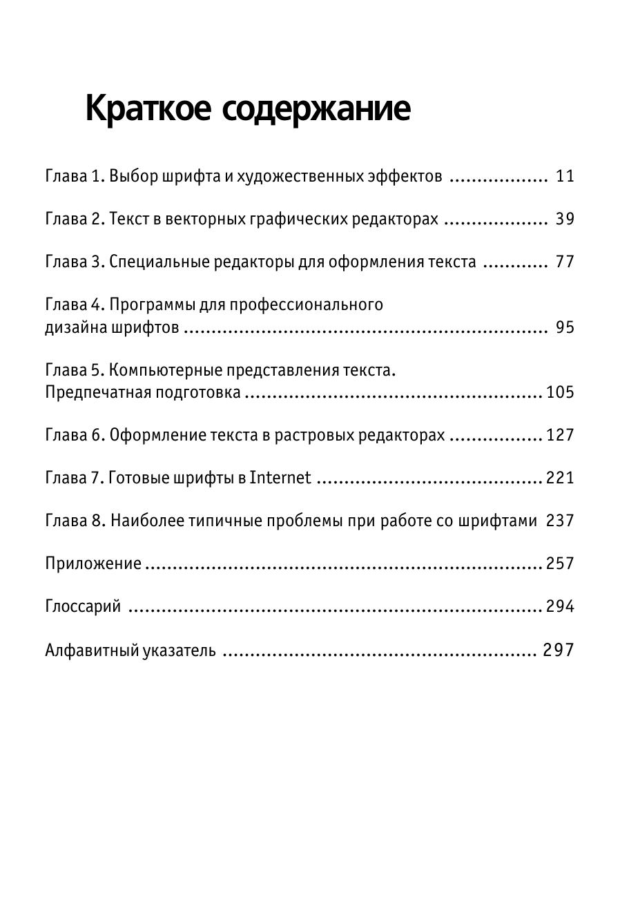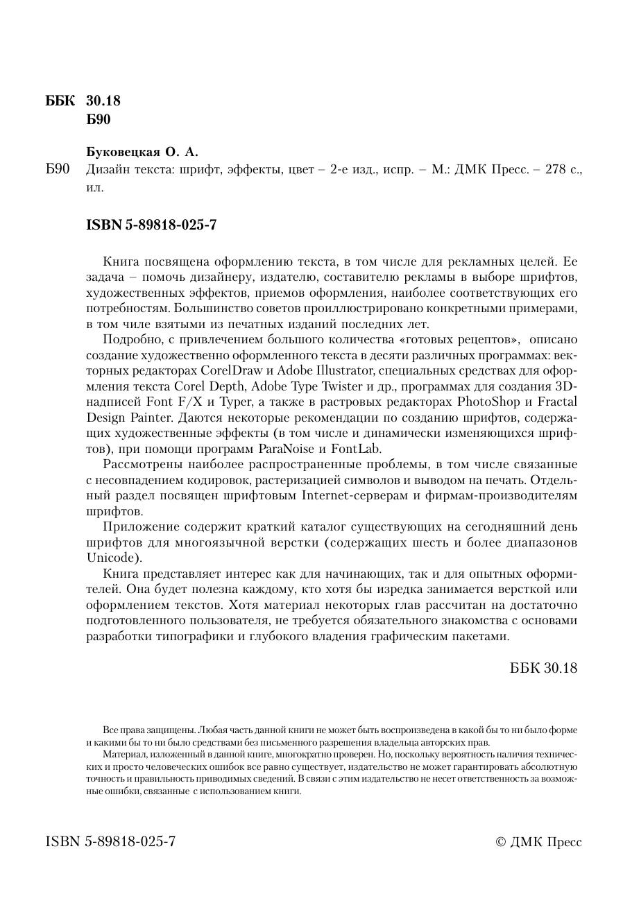 Книга посвящена оформлению текста, в том числе для рекламных целей. Ее задача – помочь дизайнеру, издателю, составителю рекламы в выборе шрифтов, художественных эффектов, приемов оформления, наиболее соответствующих его потребностям. Большинство советов проиллюстрировано конкретными примерами, в том чиле взятыми из печатных изданий последних лет. Подробно, с привлечением большого количества «готовых рецептов», описано создание художественно оформленного текста в десяти различных программах: векторных редакторах CorelDraw и Adobe Illustrator, специальных средствах для оформления текста Corel Depth, Adobe Type Twister и др., программах для создания 3D-надписей Font F/X и Typer, а также в растровых редакторах PhotoShop и Fractal Design Painter. Даются некоторые рекомендации по созданию шрифтов, содержащих художественные эффекты (в том числе и динамически изменяющихся шрифтов), при помощи программ ParaNoise и FontLab. Рассмотрены наиболее распространенные проблемы, в том числе связанные с несовпадением кодировок, растеризацией символов и выводом на печать. Отдельный раздел посвящен шрифтовым Internet серверам и фирмам производителям шрифтов. Приложение содержит краткий каталог существующих на сегодняшний день шрифтов для многоязычной верстки (содержащих шесть и более диапазонов Unicode). Книга представляет интерес как для начинающих, так и для опытных оформителей. Она будет полезна каждому, кто хотя бы изредка занимается версткой или оформлением текстов. Хотя материал некоторых глав рассчитан на достаточно подготовленного пользователя, не требуется обязательного знакомства с основами разработки типографики и глубокого владения графическим пакетами.