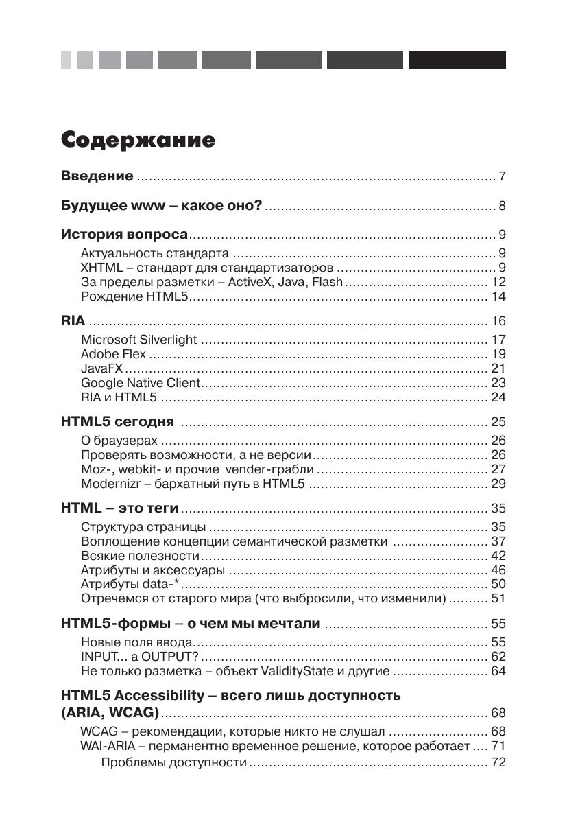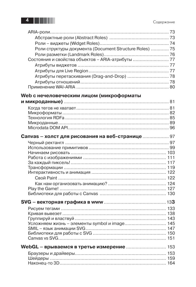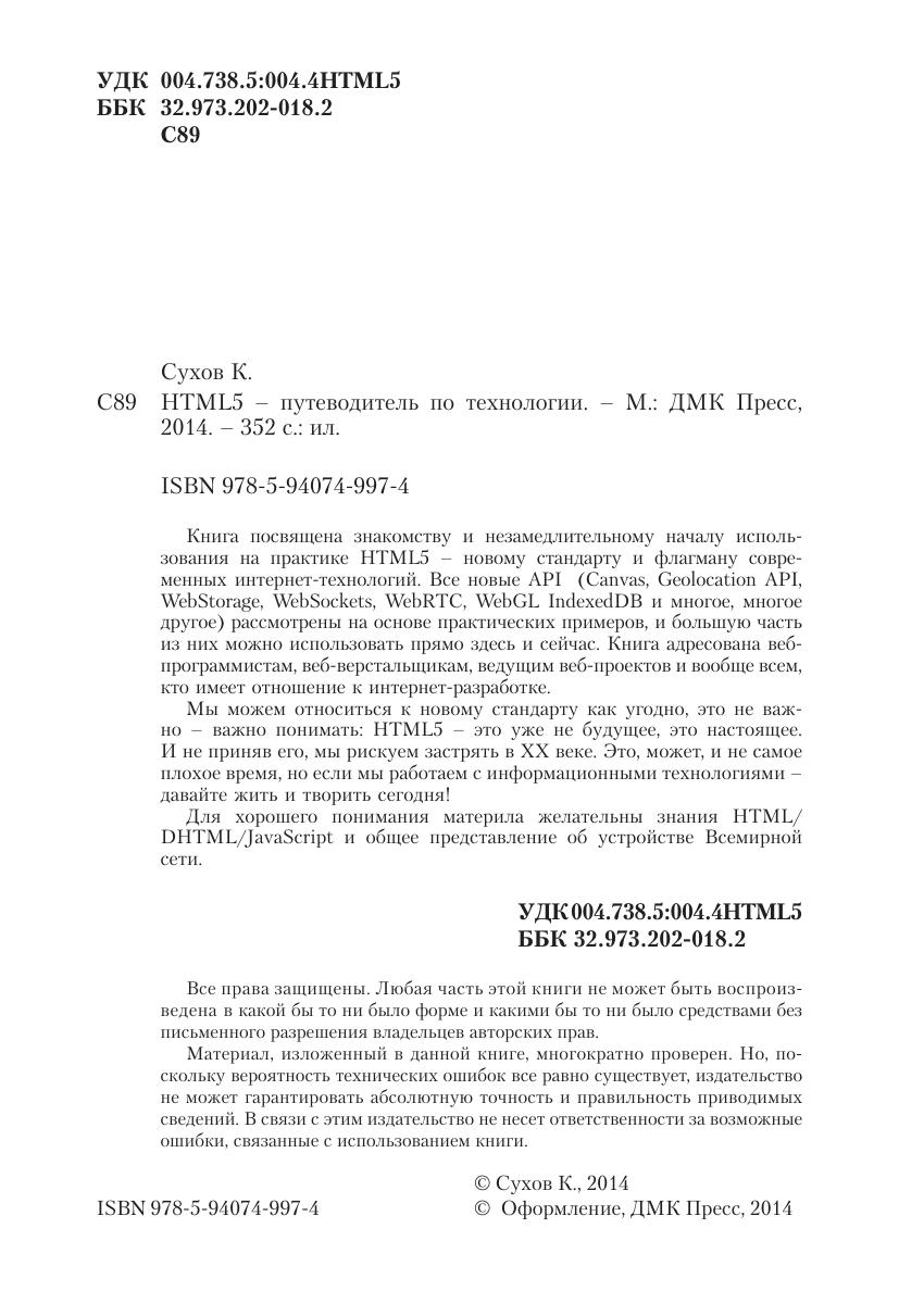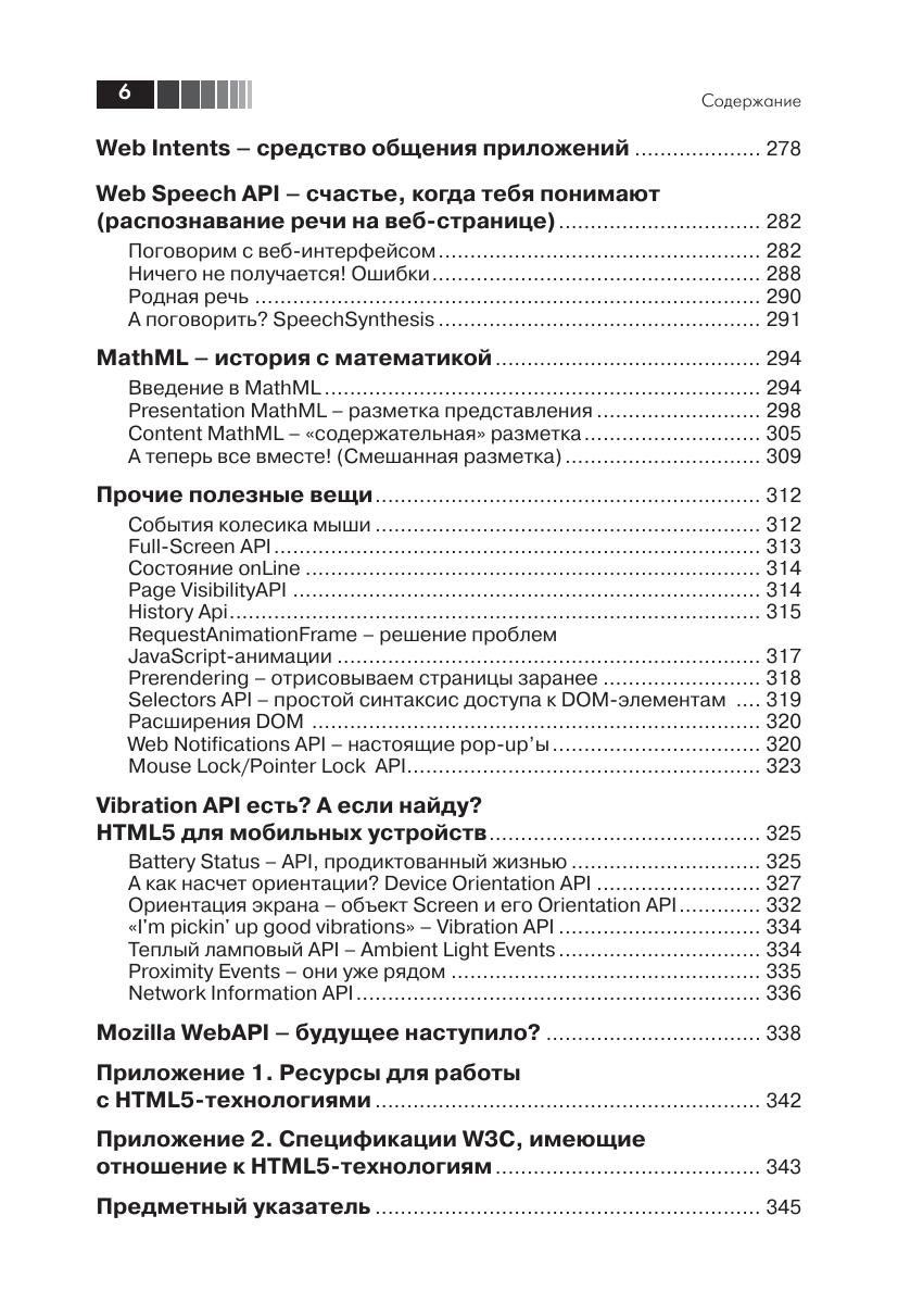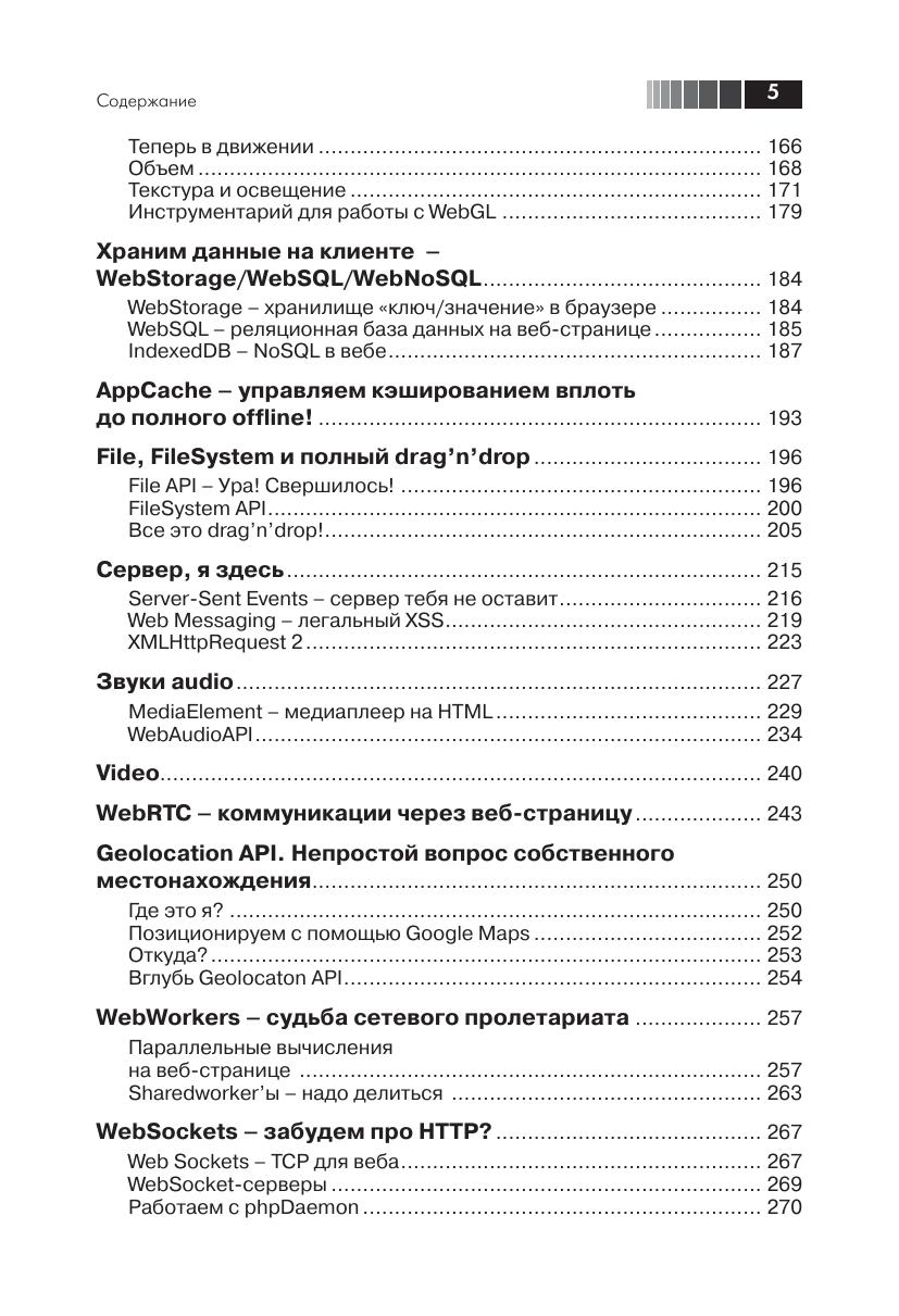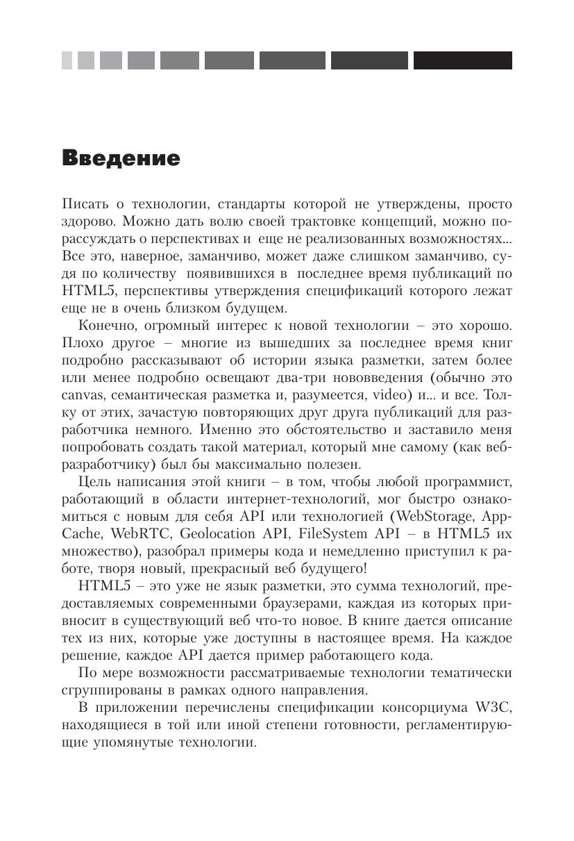 Книга посвящена знакомству и незамедлительному началу использования на практике HTML5 – новому стандарту и флагману современных интернет-технологий. Все новые API (Canvas, Geolocation API, WebStorage, WebSockets, WebRTC, WebGL IndexedDB и многое, многое другое) рассмотрены на основе практических примеров, и большую часть из них можно использовать прямо здесь и сейчас. Книга адресована веб-программистам, веб-верстальщикам, ведущим веб-проектов и вообще всем, кто имеет отношение к интернет-разработке. Мы можем относиться к новому стандарту как угодно, это не важно – важно понимать: HTML5 – это уже не будущее, это настоящее. И не приняв его, мы рискуем застрять в ХХ веке. Это, может, и не самое плохое время, но если мы работаем с информационными технологиями – давайте жить и творить сегодня! Для хорошего понимания материла желательны знания HTML/DHTML/JavaScript и общее представление об устройстве Всемирной сети.
