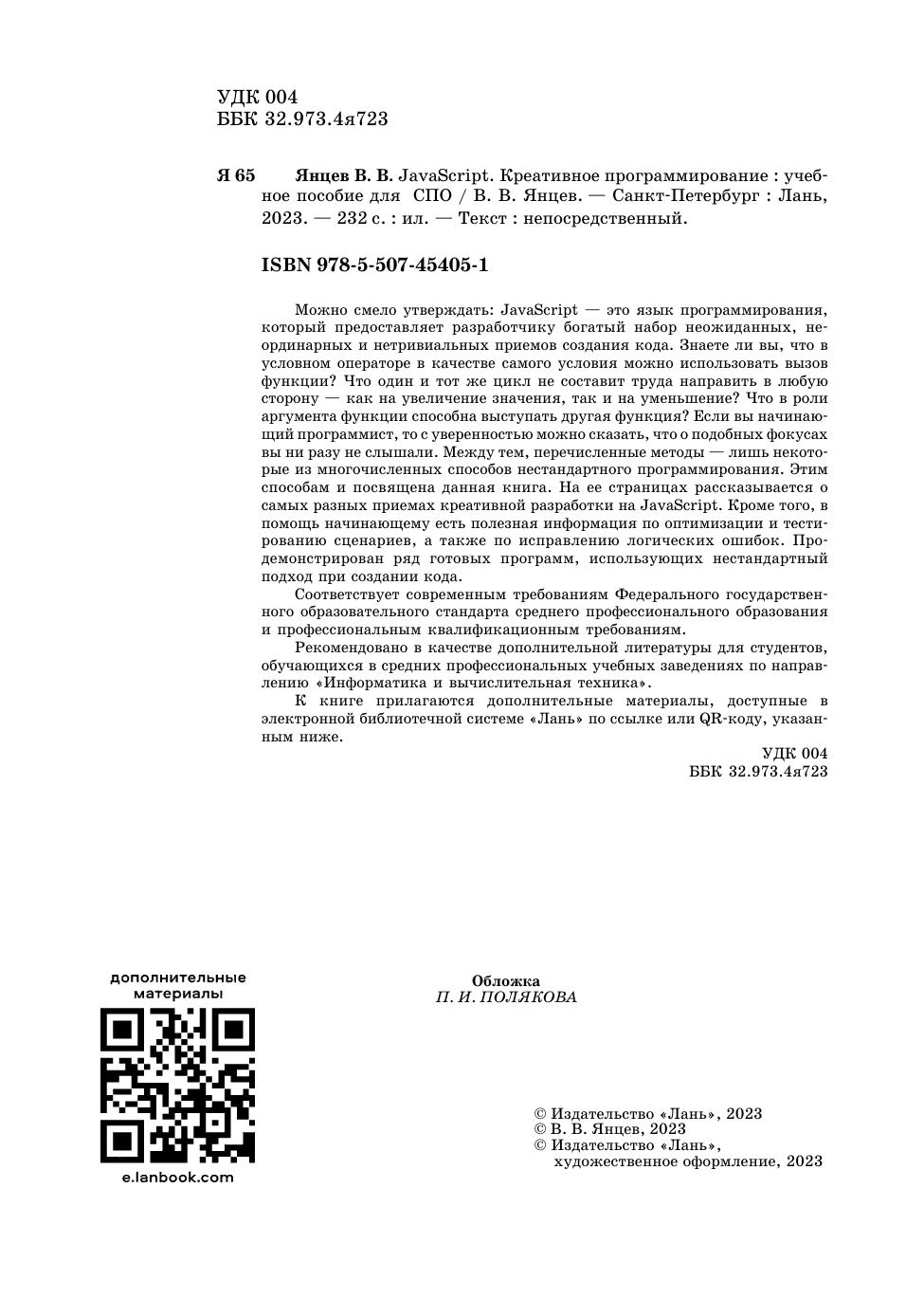 Можно смело утверждать: JavaScript — это язык программирования, который предоставляет разработчику богатый набор неожиданных, неординарных и нетривиальных приемов создания кода. Знаете ли вы, что в условном операторе в качестве самого условия можно использовать вызов функции? Что один и тот же цикл не составит труда направить в любую сторону — как на увеличение значения, так и на уменьшение? Что в роли аргумента функции способна выступать другая функция? Если вы начинающий программист, то с уверенностью можно сказать, что о подобных фокусах вы ни разу не слышали. Между тем, перечисленные методы — лишь некоторые из многочисленных способов нестандартного программирования. Этим способам и посвящена данная книга. На ее страницах рассказывается о самых разных приемах креативной разработки на JavaScript. Кроме того, в помощь начинающему есть полезная информация по оптимизации и тестированию сценариев, а также по исправлению логических ошибок. Продемонстрирован ряд готовых программ, использующих нестандартный подход при создании кода. Соответствует современным требованиям Федерального государственного образовательного стандарта среднего профессионального образования и профессиональным квалификационным требованиям. Рекомендовано в качестве дополнительной литературы для студентов, обучающихся в средних профессиональных учебных заведениях по направлению «Информатика и вычислительная техника». К книге прилагаются дополнительные материалы, доступные в электронной библиотечной системе «Лань» по ссылке или QR-коду, указанным ниже.