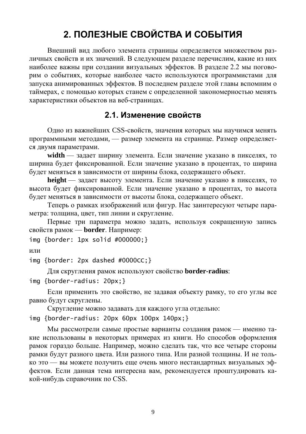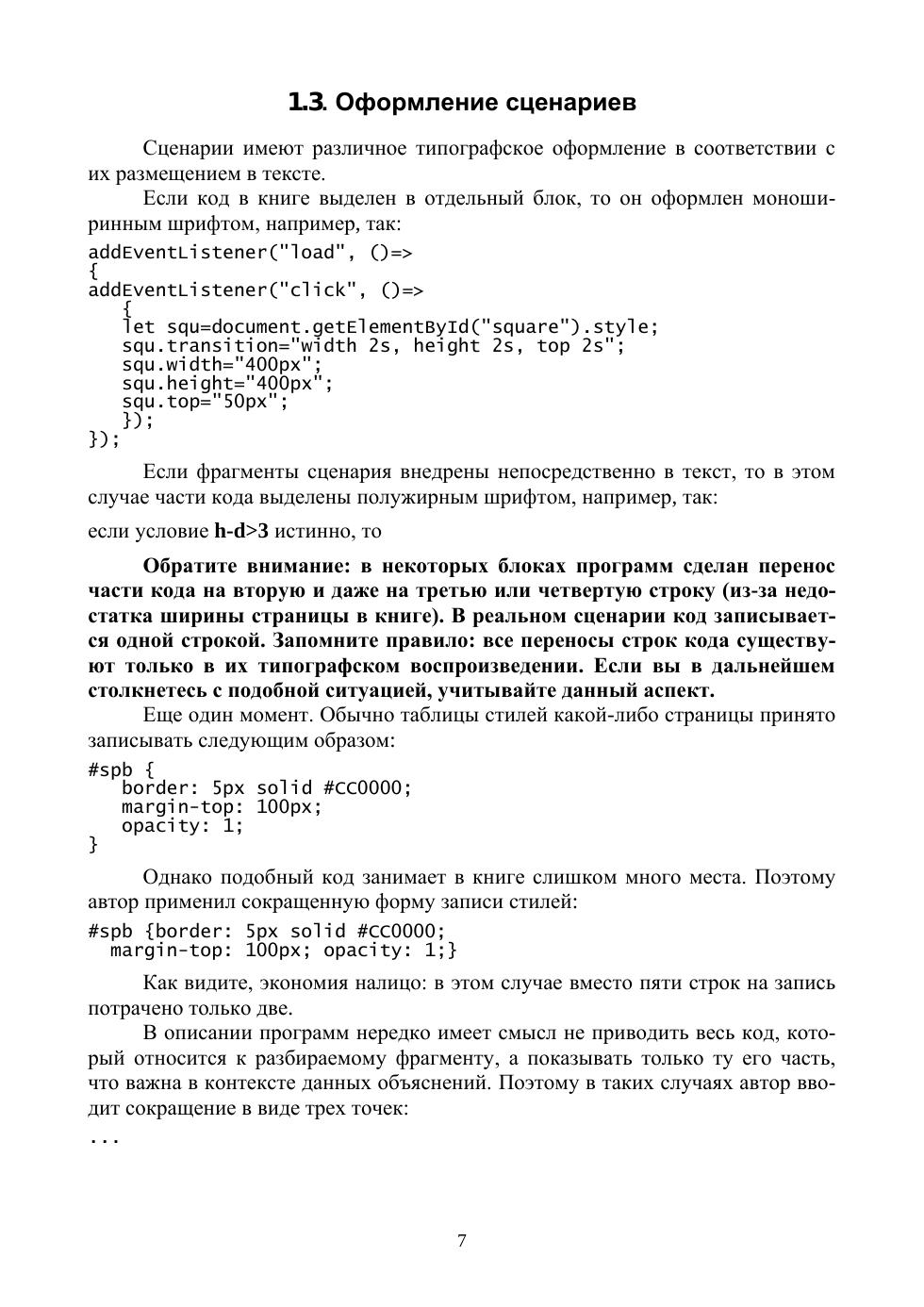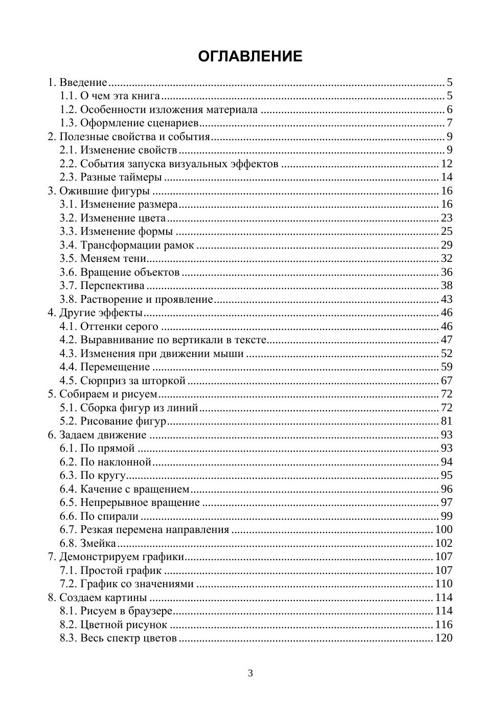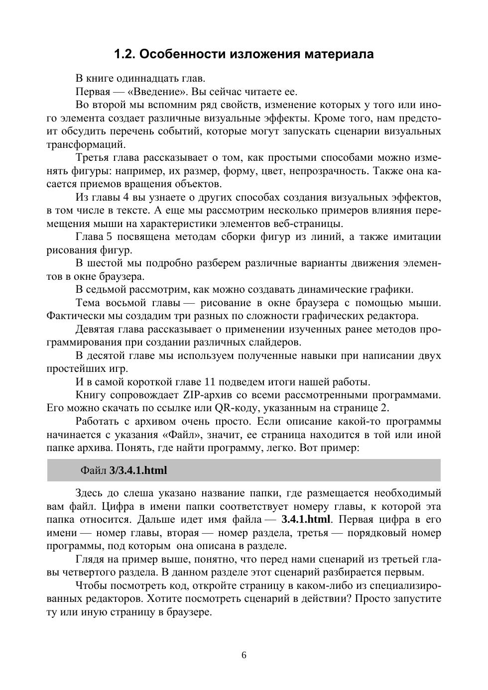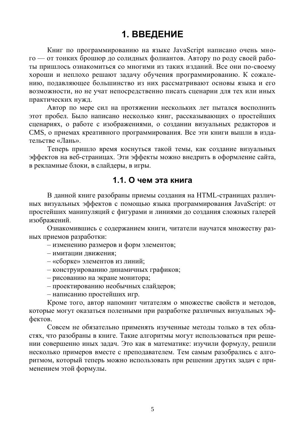 В данной книге разобраны приемы создания на HTML страницах различных визуальных эффектов с помощью языка программирования JavaScript: от простейших манипуляций с фигурами и линиями до создания сложных галерей изображений. Ознакомившись с содержанием учебника, читатели научатся множеству разных приемов разработки: изменению размеров и форм элементов, имитации движения, «сборке» элементов из линий, конструированию динамичных графиков, рисованию в окне браузера, проектированию необычных слайдеров, написанию простейших игр. Кроме того, автор напомнит читателям о множестве свойств и методов, которые могут оказаться полезными при разработке различных визуальных эффектов. Соответствует современным требованиям Федерального государственного образовательного стандарта среднего профессионального образования и профессиональным квалификационным требованиям. Рекомендовано в качестве дополнительной литературы для студентов, обучающихся в средних профессиональных учебных заведениях по направлению «Информатика и вычислительная техника». К книге прилагаются дополнительные материалы, доступные в электронной библиотечной системе «Лань» по ссылке или QR-коду, указанным ниже.