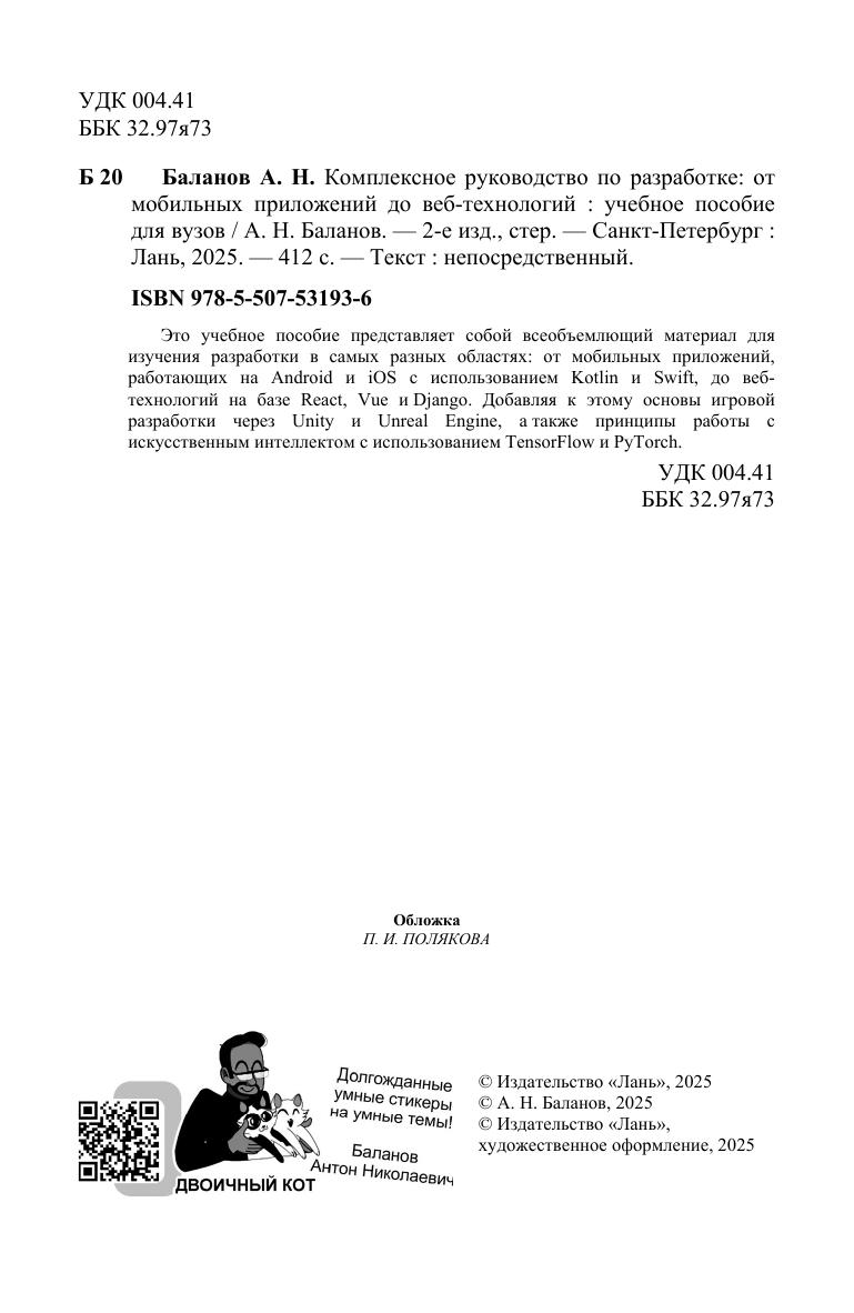 Это учебное пособие представляет собой всеобъемлющий материал для изучения разработки в самых разных областях: от мобильных приложений, работающих на Android и iOS с использованием Kotlin и Swift, до веб-технологий на базе React, Vue и Django. Добавляя к этому основы игровой разработки через Unity и Unreal Engine, а также принципы работы с искусственным интеллектом с использованием TensorFlow и PyTorch.