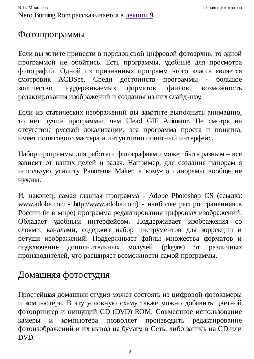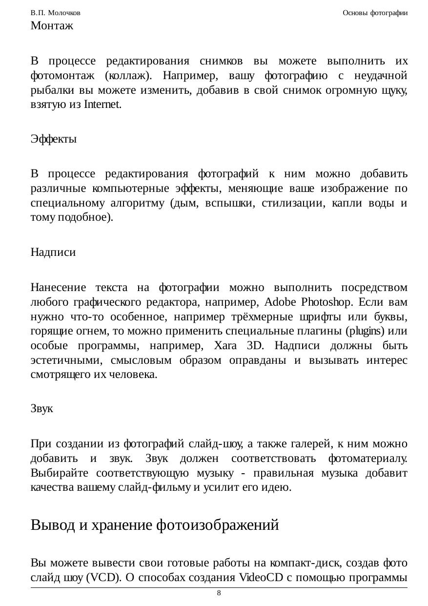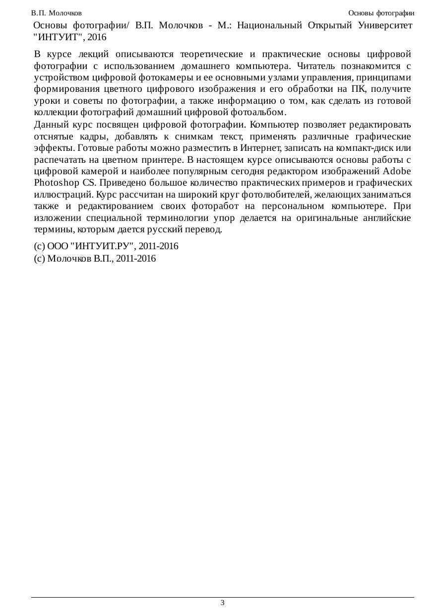 В курсе лекций описываются теоретические и практические основы цифровой фотографии с использованием домашнего компьютера. Читатель познакомится с устройством цифровой фотокамеры и ее основными узлами управления, принципами формирования цветного цифрового изображения и его обработки на ПК, получите уроки и советы по фотографии, а также информацию о том, как сделать из готовой коллекции фотографий домашний цифровой фотоальбом. Данный курс посвящен цифровой фотографии. Компьютер позволяет редактировать отснятые кадры, добавлять к снимкам текст, применять различные графические эффекты. Готовые работы можно разместить в Интернет, записать на компакт-диск или распечатать на цветном принтере. В настоящем курсе описываются основы работы с цифровой камерой и наиболее популярным сегодня редактором изображений Adobe Photoshop CS. Приведено большое количество практических примеров и графических иллюстраций. Курс рассчитан на широкий круг фотолюбителей, желающих заниматься также и редактированием своих фоторабот на персональном компьютере. При изложении специальной терминологии упор делается на оригинальные английские термины, которым дается русский перевод.