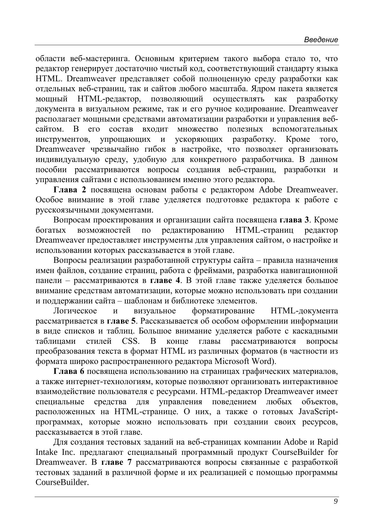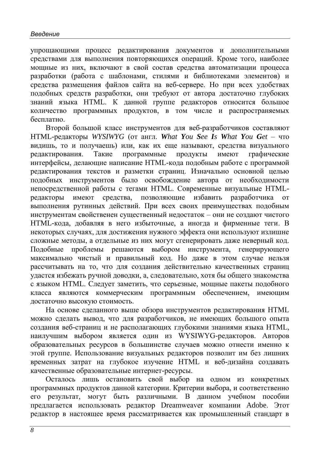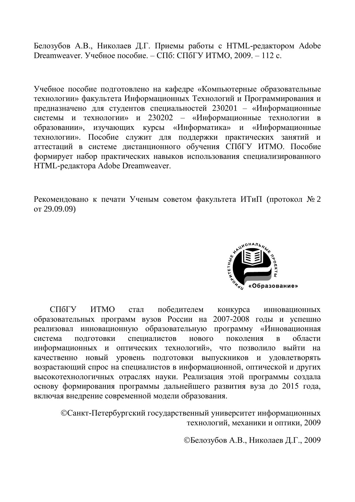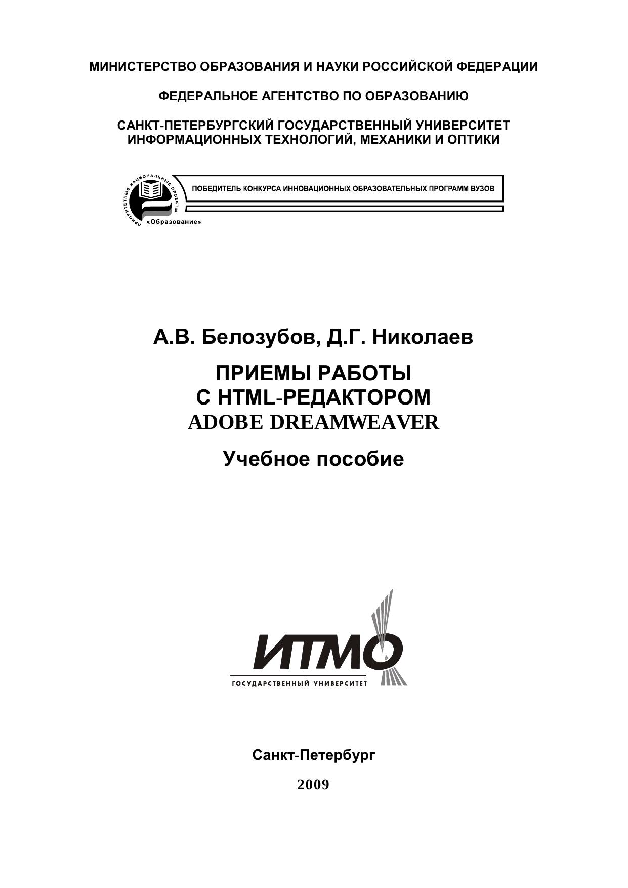 Учебное пособие подготовлено на кафедре «Компьютерные образовательные технологии» факультета Информационных Технологий и Программирования и предназначено для студентов специальностей 230201 – «Информационные системы и технологии» и 230202 – «Информационные технологии в образовании», изучающих курсы «Информатика» и «Информационные технологии». Пособие служит для поддержки практических занятий и аттестаций в системе дистанционного обучения СПбГУ ИТМО. Пособие формирует набор практических навыков использования специализированного HTML-редактора Adobe Dreamweaver.