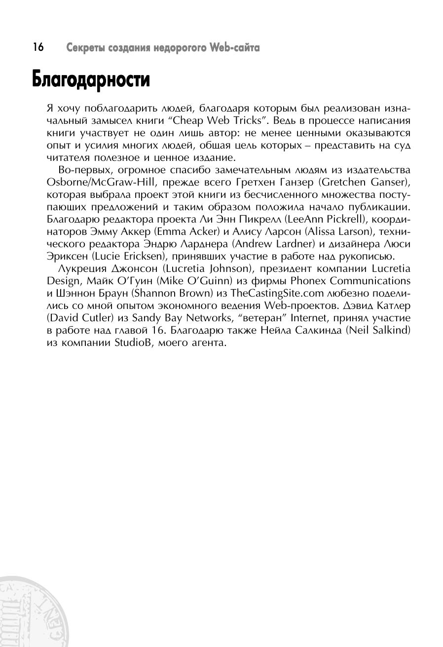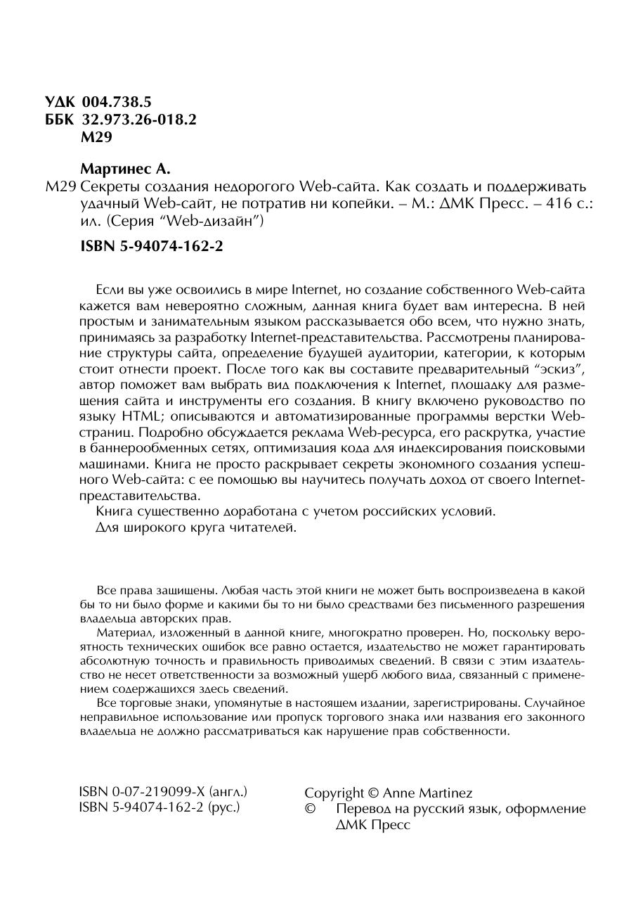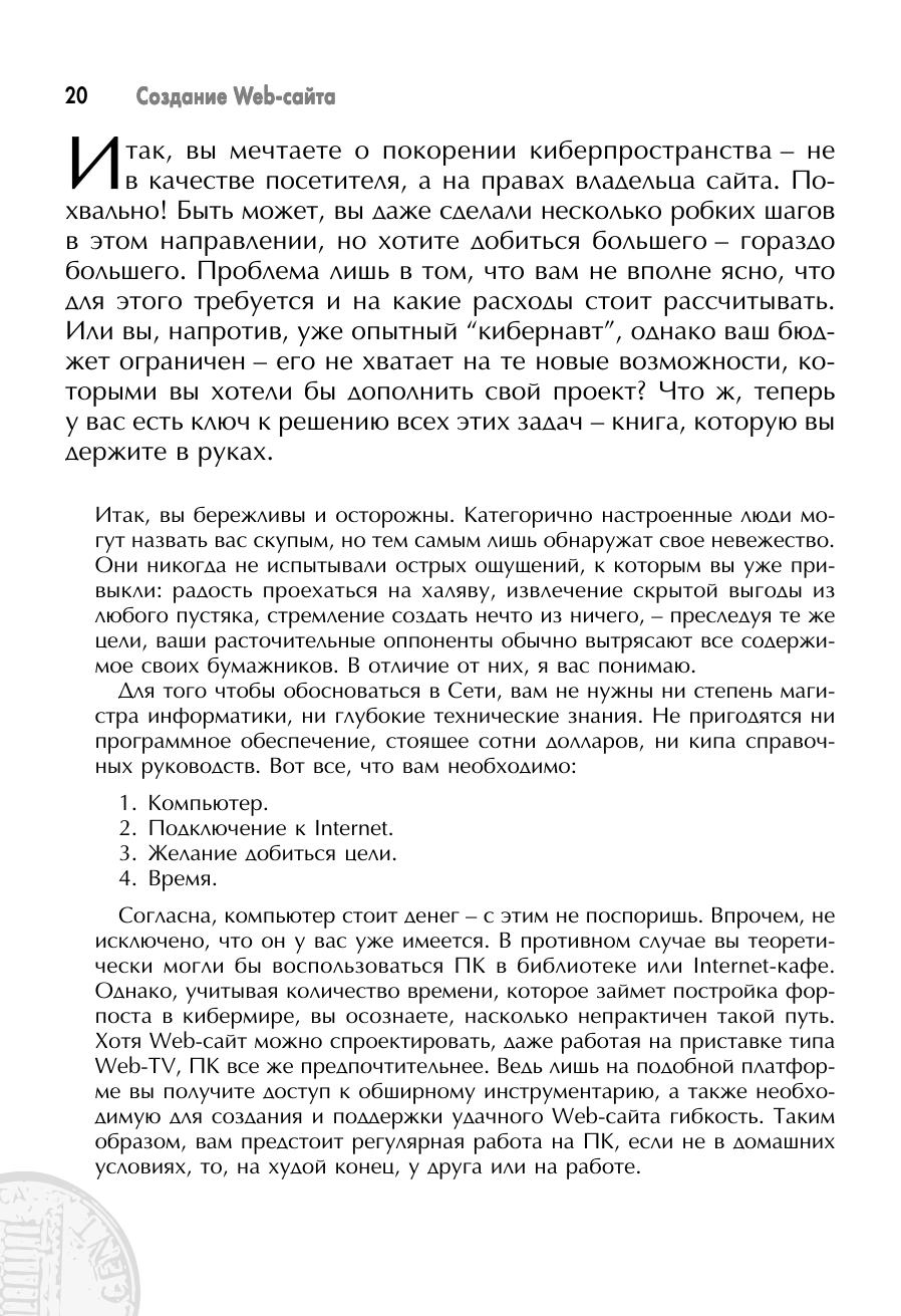 Вы уже освоились в мире Internet, но люди, создающие Web-сайты, все еще кажутся вам компьютерными волшебниками? Прочтите эту книгу – и вы убедитесь, что построение красивого информативного Web-сайта по плечу и вам. Автор простым и занимательным языком рассказывает обо всех основных аспектах подготовки Internet-представительства и о его дальнейшей публикации, подробно рассматривается реклама Web-сайта. Хотя для многих фирм создание сайта оказывается разорительным, вам не придется тратить на него ни копейки: эта книга научит вас такому подходу. Более того, вы узнаете, как заставить Web-сайт приносить прибыль! Для экономного Web-мастера подобное руководство будет лучшим подспорьем в освоении Internet-строительства.