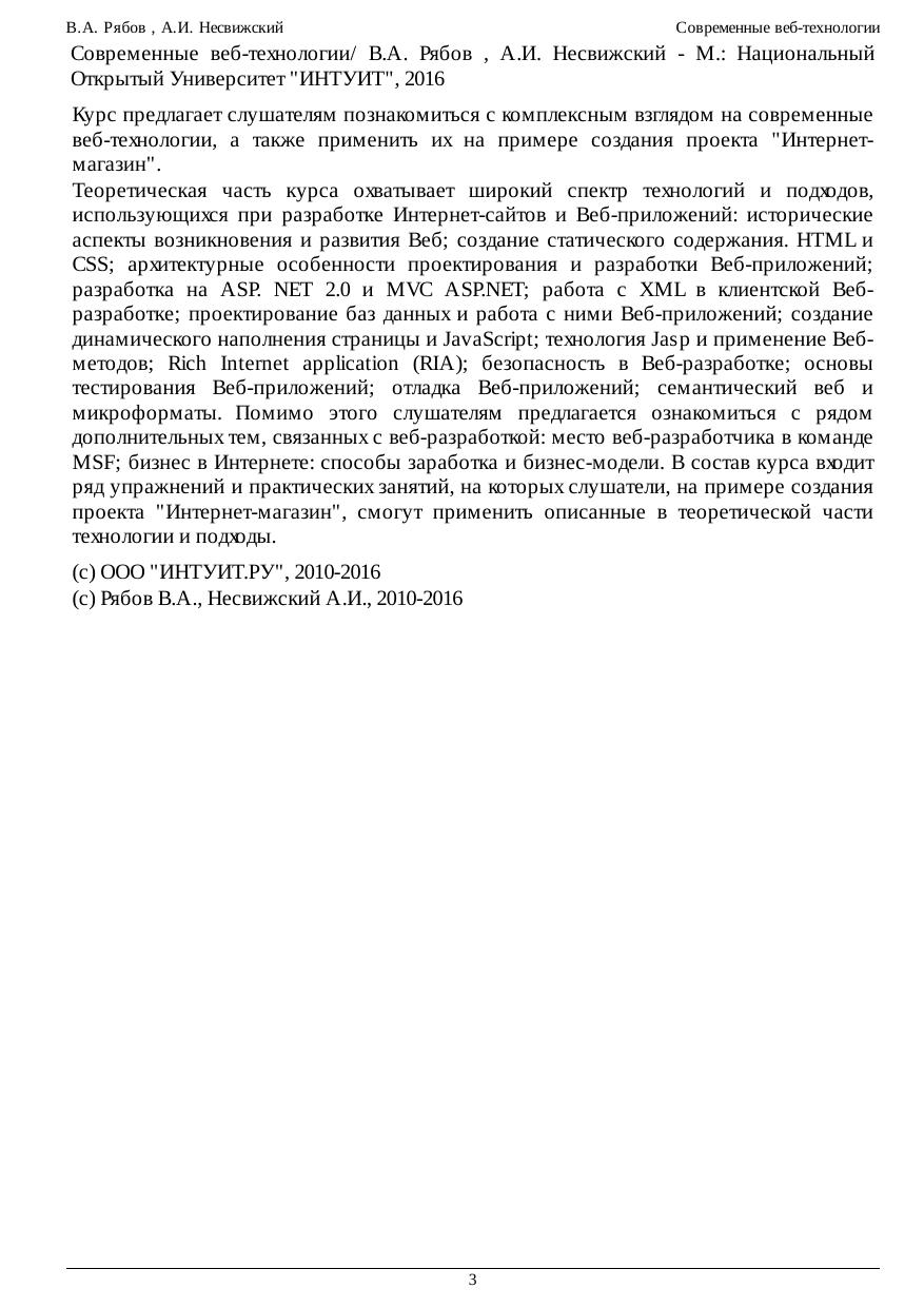 Курс предлагает слушателям познакомиться с комплексным взглядом на современные веб-технологии, а также применить их на примере создания проекта "Интернет-магазин". Теоретическая часть курса охватывает широкий спектр технологий и подходов, использующихся при разработке Интернет-сайтов и Веб-приложений: исторические аспекты возникновения и развития Веб; создание статического содержания. HTML и CSS; архитектурные особенности проектирования и разработки Веб-приложений; разработка на ASP. NET 2.0 и MVC ASP.NET; работа с XML в клиентской Веб-разработке; проектирование баз данных и работа с ними Веб-приложений; создание динамического наполнения страницы и JavaScript; технология Jasp и применение Веб-методов; Rich Internet application (RIA); безопасность в Веб-разработке; основы тестирования Веб-приложений; отладка Веб-приложений; семантический веб и микроформаты. Помимо этого слушателям предлагается ознакомиться с рядом дополнительных тем, связанных с веб-разработкой: место веб-разработчика в команде MSF; бизнес в Интернете: способы заработка и бизнес-модели. В состав курса входит ряд упражнений и практических занятий, на которых слушатели, на примере создания проекта "Интернет-магазин", смогут применить описанные в теоретической части технологии и подходы.