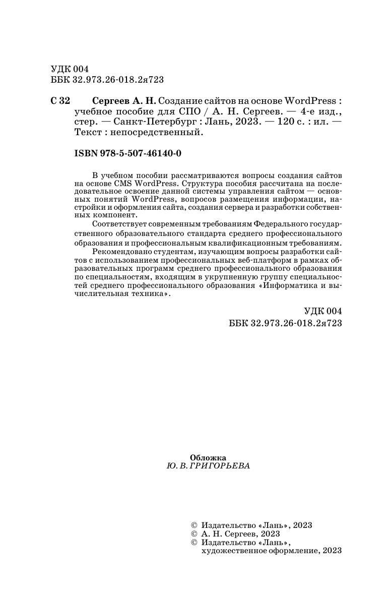 В учебном пособии рассматриваются вопросы создания сайтов на основе CMS WordPress. Структура пособия рассчитана на последовательное освоение данной системы управления сайтом – основных понятий WordPress, вопросов размещения информации, настройки и оформления сайта, создания сервера и разработки собственных компонент. Рекомендовано студентам, изучающим вопросы разработки сайтов с использованием профессиональных веб-платформ в рамках образовательных программ среднего профессионального образования по специальностям, входящим в укрупненную группу специальностей среднего профессионального образования «Информатика и вычислительная техника». Соответствует современным требованиям Федерального государственного образовательного стандарта среднего профессионального образования и профессиональным квалификационным требованиям.