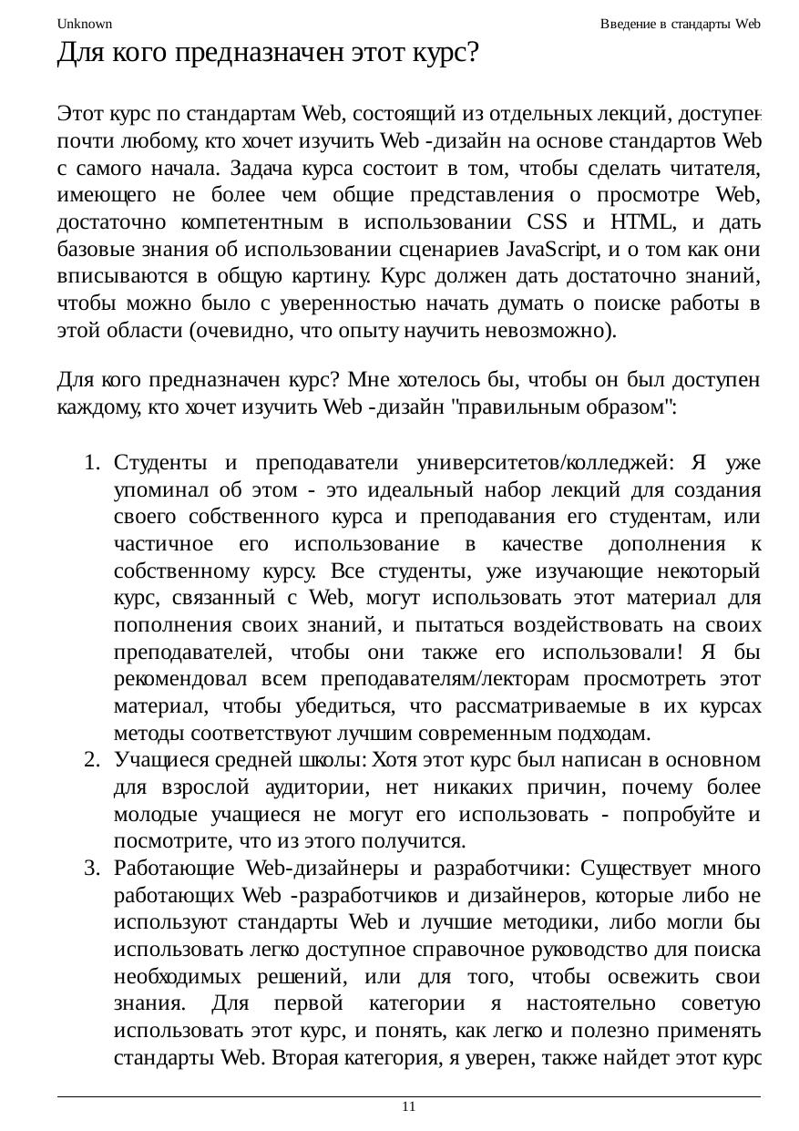 любому, кто хочет изучить Web-дизайн на основе стандартов Web с самого начала. Задача курса состоит в том, чтобы сделать читателя, имеющего не более чем общие представления о просмотре Web, достаточно компетентным в использовании CSS и HTML, и дать базовые знания об использовании сценариев JavaScript, и о том как они вписываются в общую картину. Курс должен дать достаточно знаний, чтобы можно было с уверенностью начать думать о поиске работы в этой области.