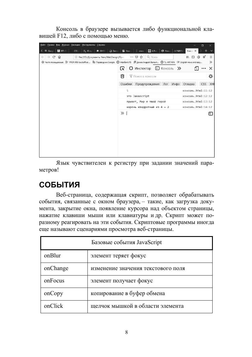 Язык JavaScript является самым популярным и развивающимся языком разработки сценариев для веб-браузера. В книге делается акцент на актуальную версию стандарта ES2015 (ES6) и не рассматриваются устаревшие возможности. Технология DOM выделена в отдельную часть книги, так как является самостоятельной, но может быть реализована посредством JavaScript. Потенциал DOM, выражающийся в возможности любого динамического изменения контента веб-страницы, позволяет создавать не просто веб-страницы, а веб-приложения. Учебное пособие предназначено и для освоения основ современного объектного программирования и для знакомства с технологией расширения функционала веб-страниц и придания им динамичности и интерактивности на уровне клиента. В последнем случае требуется наличие знаний технологий HTML и CSS. Соответствует современным требованиям Федерального государственного образовательного стандарта среднего профессионального образования и профессиональным квалификационным требованиям. Учебное пособие рекомендуется студентам, обучающимся по образовательной программе среднего профессионального образования по специальностям, входящим в укрупненные группы специальностей среднего профессионального образования «Информатика и вычислительная техника» в рамках изучаемых технологий и для самостоятельного изучения технологий JavaScript и DOM.