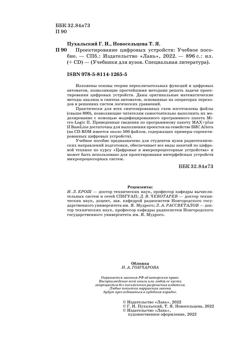 Изложены основы теории переключательных функций и цифровых автоматов, позволяющие простейшими методами решать задачи проектирования цифровых устройств. Даны оригинальные математические методы анализа и синтеза автоматов, основанные на операторах переходов и решениях систем логических уравнений. Практически для всех синтезированных схем изготовлены файлы (свыше 800), позволяющие читателям самостоятельно выполнить их моделирование с помощью модифицированного программного пакета Micro-Logic II. Приведенные сведения по программному пакету MAX+plus II BaseLine достаточны для выполнения проектов на семействе БИС Altera (на CD-ROM имеется около 500 файлов, содержащих примеры спроектированных цифровых устройств). Учебное пособие предназначено для студентов вузов радитехнических направлений подготовки, обеспечивает все виды занятий по цифровой технике по курсу «Цифровые и микропроцессорные устройства» и может быть использовано для проектирования интерфейсных устройств микропроцессорных систем.