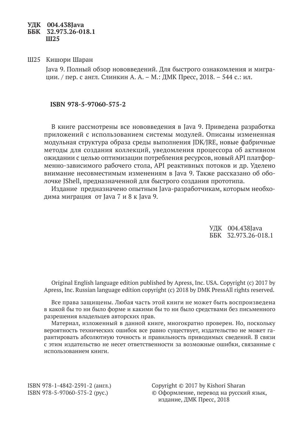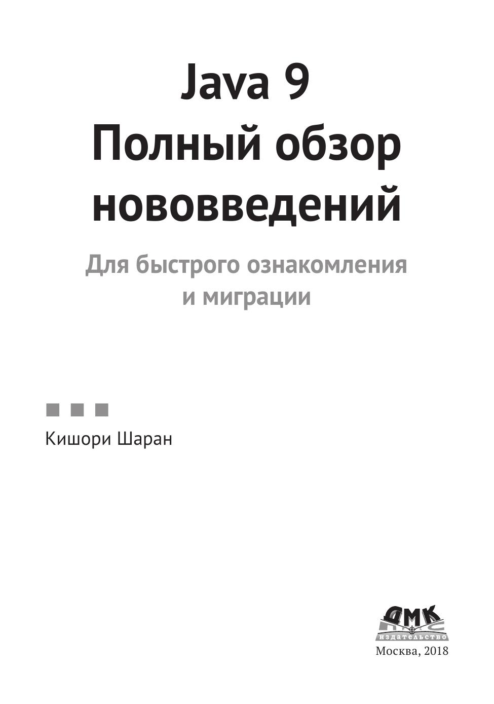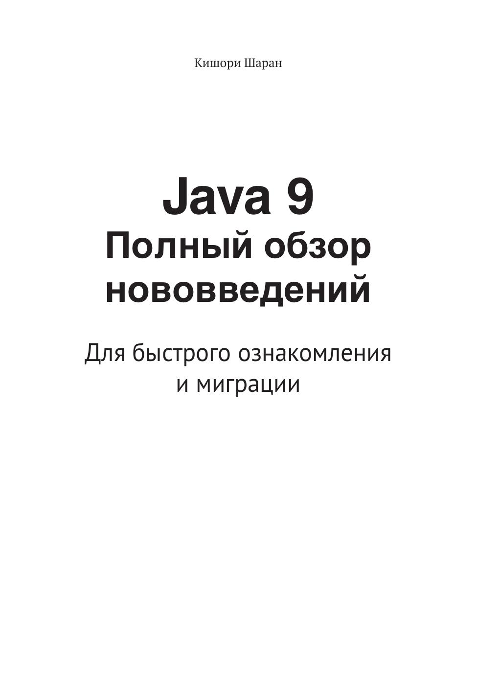 В книге рассмотрены все нововведения в Java 9. Приведена разработка приложений с использованием системы модулей. Описаны измененная модульная структура образа среды выполнения JDK/JRE, новые фабричные методы для создания коллекций, уведомления процессора об активном ожидании с целью оптимизации потребления ресурсов, новый API платформенно-зависимого рабочего стола, API реактивных потоков и др. Уделено внимание несовместимым изменениям в Java 9. Также рассказано об оболочке JShell, предназначенной для быстрого создания прототипа. Издание предназначено опытным Java-разработчикам, которым необходима миграция от Java 7 и 8 к Java 9.
