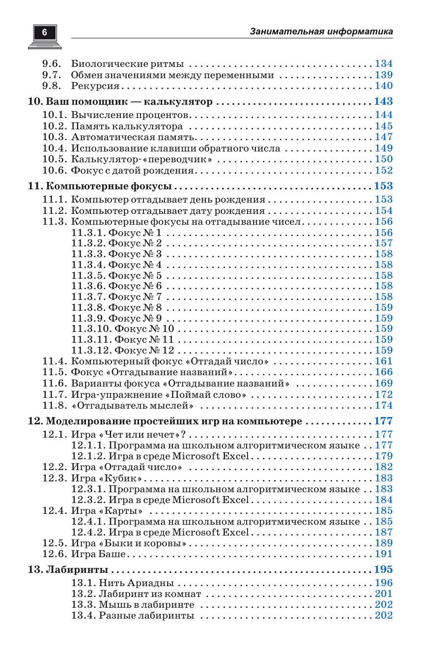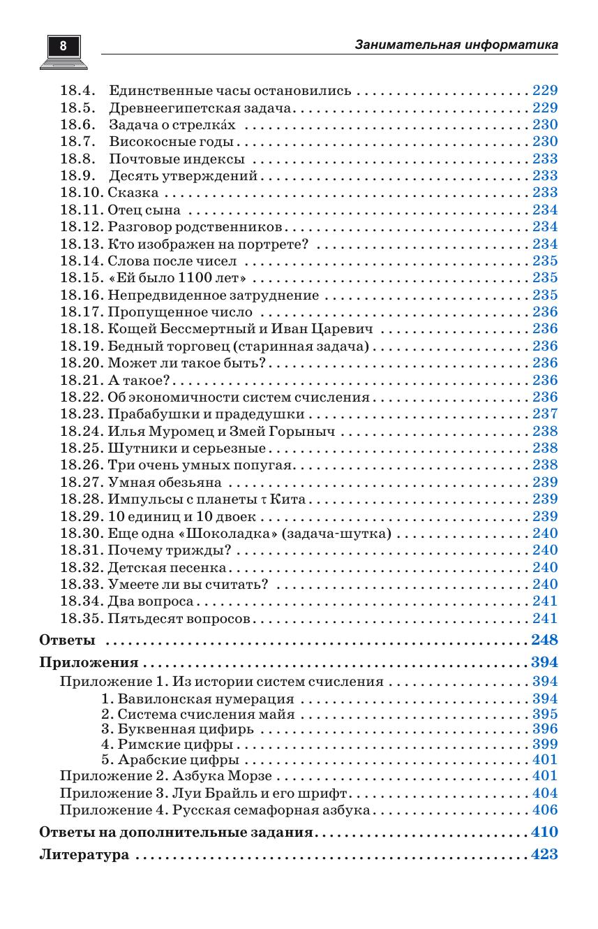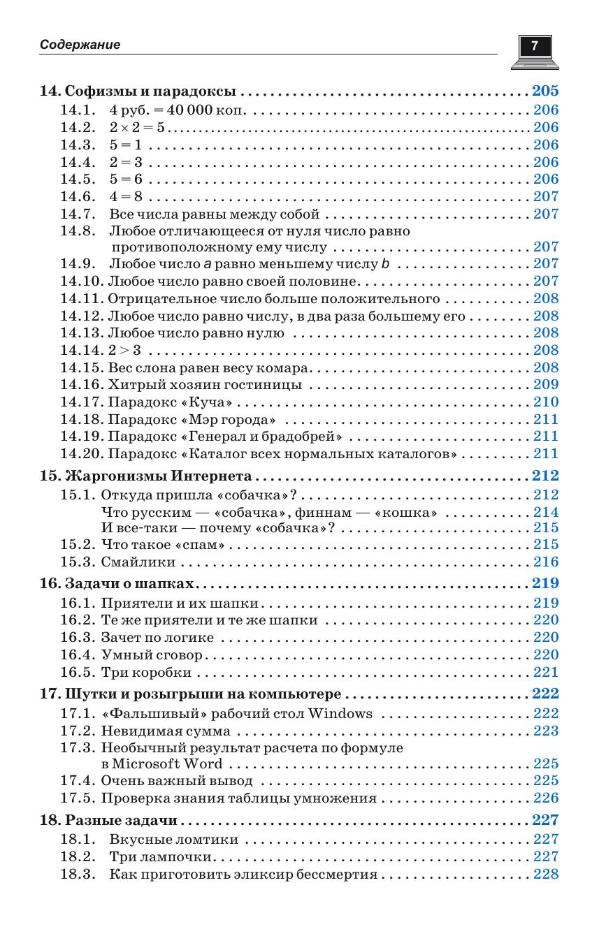 Книга во многом аналогична популярным книгам «Занимательная физика» Я. И. Перельмана, «Математические чудеса и тайны» М. Гарднера, «В царстве смекалки» Е. И. Игнатьева, «Математическая смекалка» Б. А. Кордемского и др. Она содержит большое количество разнообразных занимательных логических задач и головоломок, интересных фактов и полезных программ, простейших компьютерных игр, фокусов и др. Материалы книги охватывают широкий круг вопросов информатики, вычислительной техники и информационных и коммуникационных технологий (системы счисления, кодирование информации, логика, основы программирования, Интернет и др.). Эти материалы можно использовать как в учебном процессе, так и для внеклассной работы с учащимися. Для всех, кто интересуется информатикой.