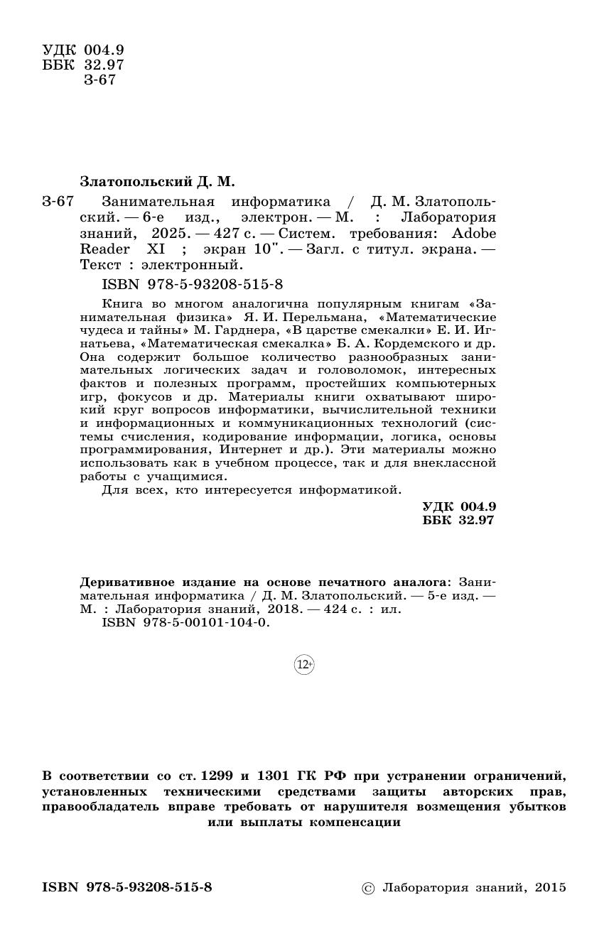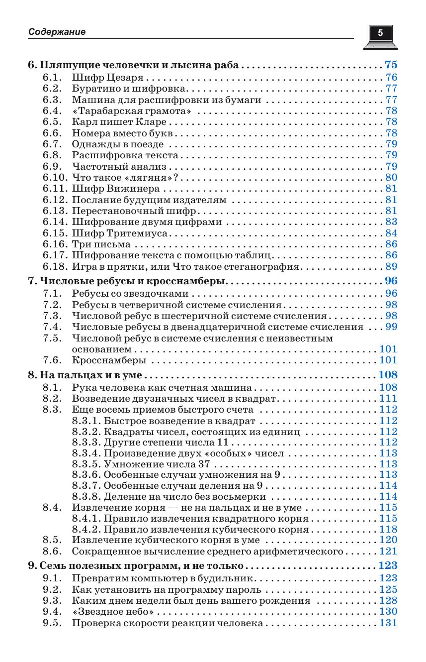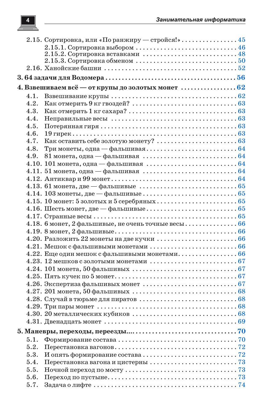 Книга во многом аналогична популярным книгам «Занимательная физика» Я. И. Перельмана, «Математические чудеса и тайны» М. Гарднера, «В царстве смекалки» Е. И. Игнатьева, «Математическая смекалка» Б. А. Кордемского и др. Она содержит большое количество разнообразных занимательных логических задач и головоломок, интересных фактов и полезных программ, простейших компьютерных игр, фокусов и др. Материалы книги охватывают широкий круг вопросов информатики, вычислительной техники и информационных и коммуникационных технологий (системы счисления, кодирование информации, логика, основы программирования, Интернет и др.). Эти материалы можно использовать как в учебном процессе, так и для внеклассной работы с учащимися. Для всех, кто интересуется информатикой.
