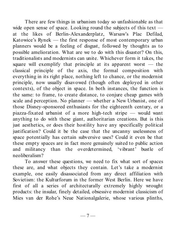 The vast, proverbially windswept plazas built under «really existing socialism» from the 1920s to the 1980s are widely considered to be useless spaces, designed to intimidate or at least impress. Yet if they are only of use to those in power, why is it they have been used so successfully in protest? From Petrograd in 1917 to Independence Square in Kiev during the Orange Revolution, these spaces have become focuses for mass protest. Beginning in Berlin's Alexanderplatz, and taking in Warsaw, Ljubljana, Kharkov and Moscow, Owen Hatherley heads in search of revolt, architectural glory and horror. Along the way he encounters the more civic squares that replaced their authoritarian predecessors and finds that, paradoxically, the old centres of power are more conducive to dissent than these new, ostensibly democratic plazas.