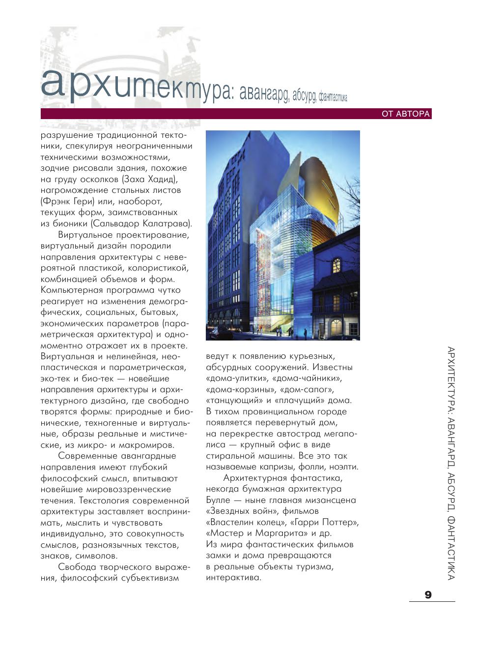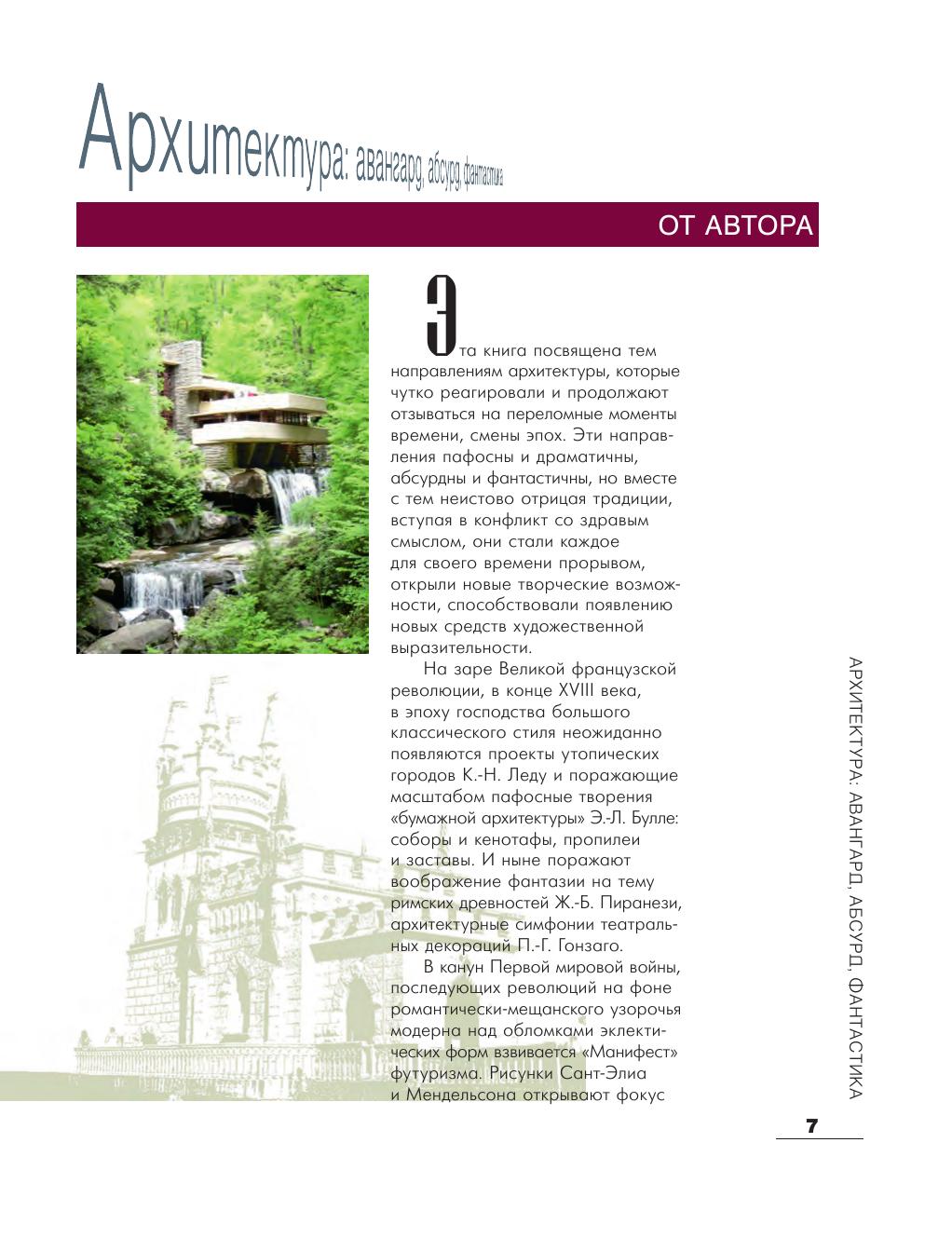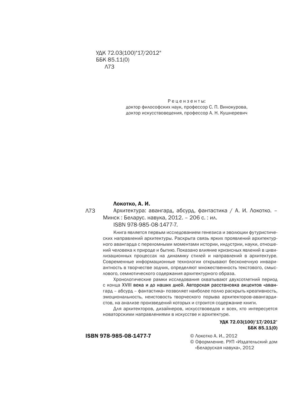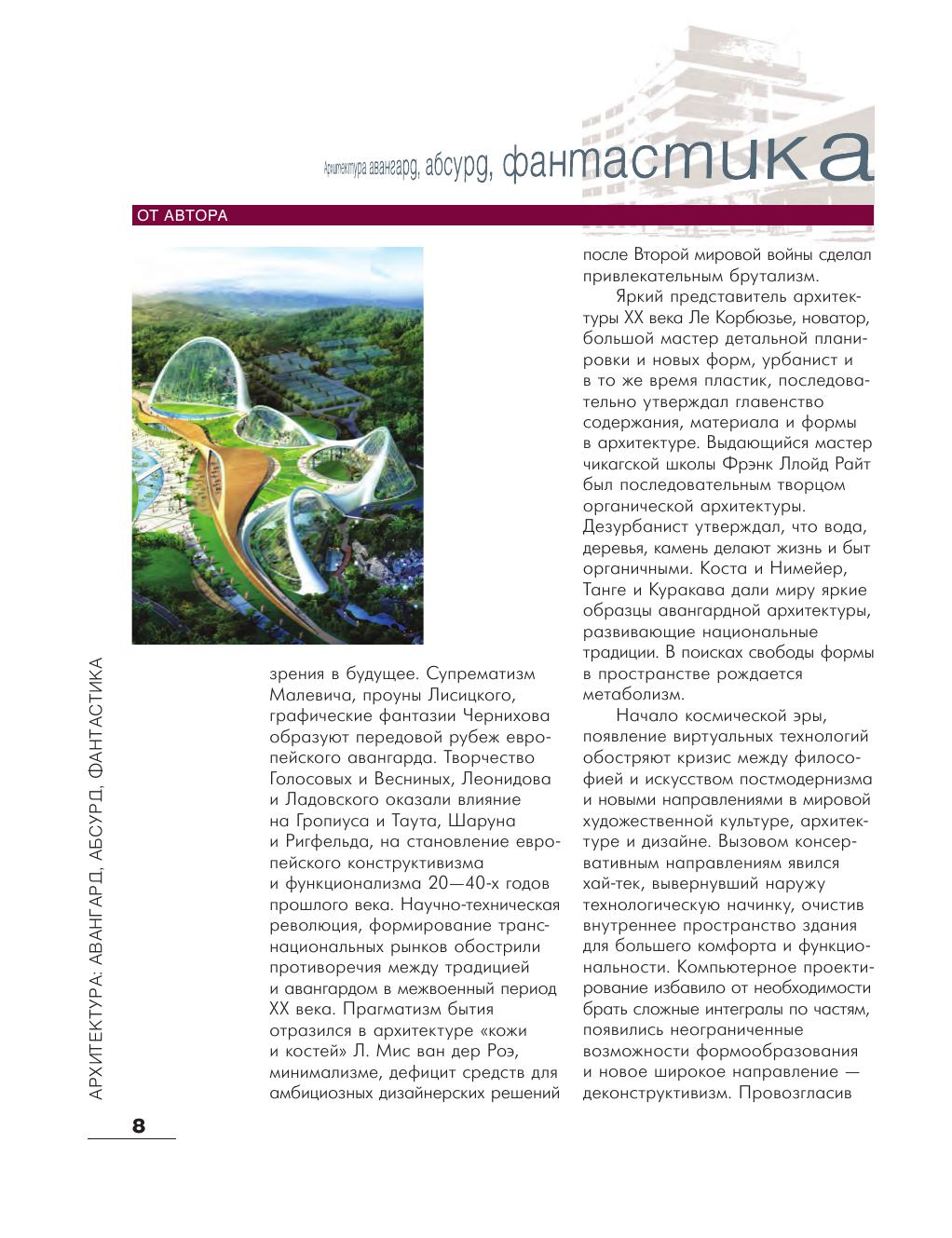 Книга является первым исследованием генезиса и эволюции футуристических направлений архитектуры. Раскрыта связь ярких проявлений архитектурного авангарда с переломными моментами истории, индустрии, науки, отношений человека к природе и бытию. Показано влияние кризисных явлений в цивилизационных процессах на динамику стилей и направлений в архитектуре. Современные информационные технологии открывают бесконечную инвариантность в творчестве зодчих, определяют множественность текстового, смыслового, семиотического содержания архитектурного образа. Хронологические рамки исследования охватывают двухсотлетний период с конца XVIII века и до наших дней. Авторская расстановка акцентов "авангард – абсурд – фантастика" позволяет наиболее полно раскрыть креативность, эмоциональность, неистовость творческого порыва архитекторов-авангардистов, на анализе произведений которых и строится содержание книги. Для архитекторов, дизайнеров, искусствоведов и всех, кто интересуется новаторскими направлениями в искусстве и архитектуре.