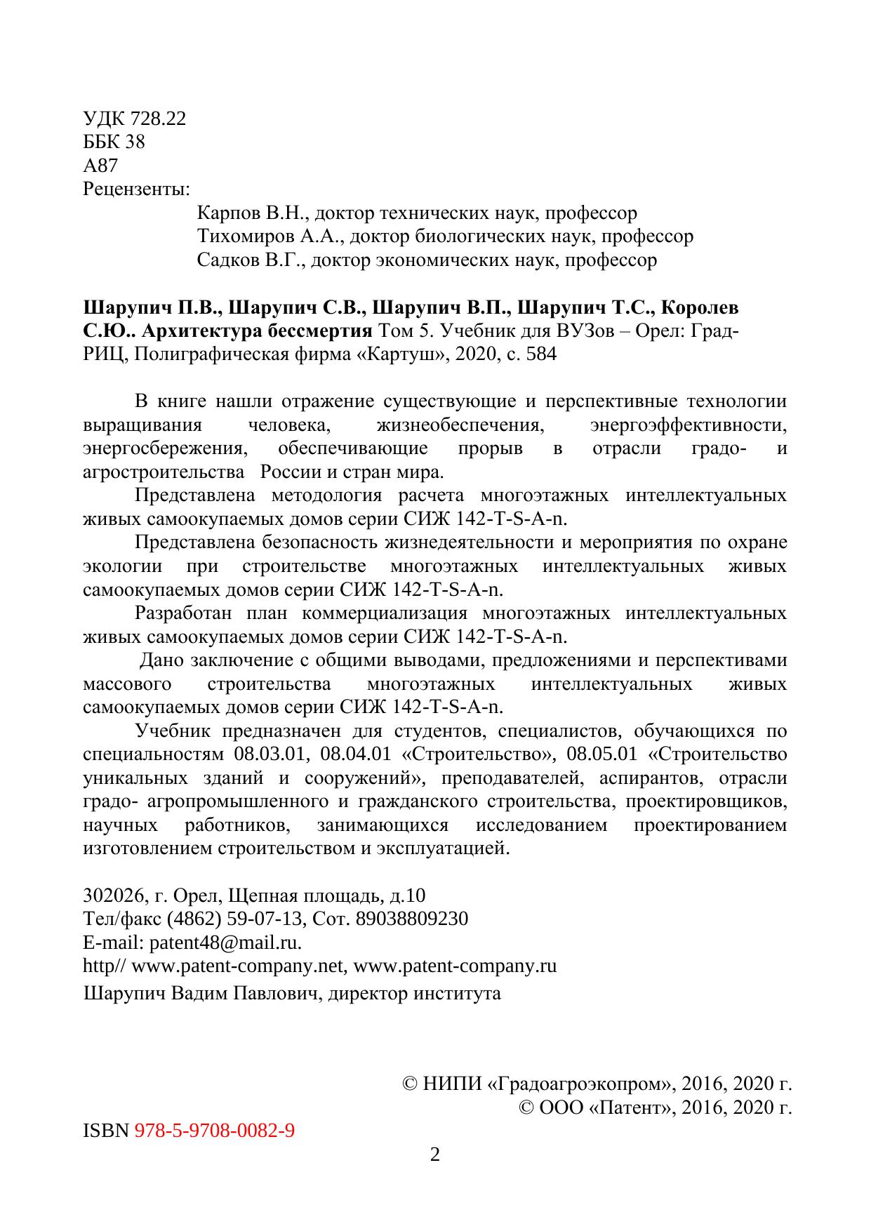 Архитектура бессмертия. Теоретические основы исследований, проектирования, изготовления, строительства и эксплуатации многоэтажных интеллектуальных живых самоокупаемых домов серии СИЖ 142-Т-S-А-n. В 8 томах. Том 5