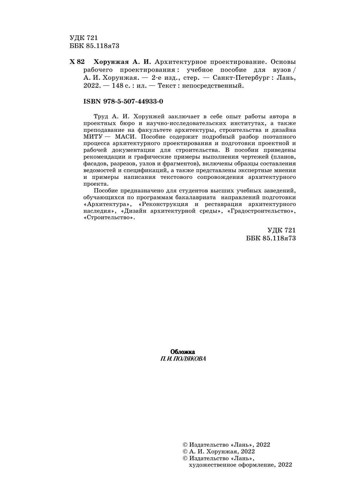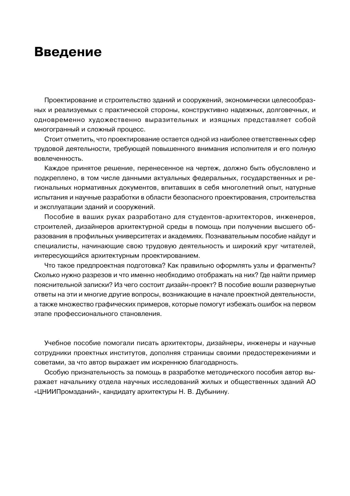 Труд А. И. Хорунжей заключает в себе опыт работы автора в проектных бюро и научно-исследовательских институтах, а также преподавание на факультете архитектуры, строительства и дизайна МИТУ— МАСИ. Пособие содержит подробный разбор поэтапного процесса архитектурного проектирования и подготовки проектной и рабочей документации для строительства. В пособии приведены рекомендации и графические примеры выполнения чертежей (планов, фасадов, разрезов, узлов и фрагментов), включены образцы составления ведомостей и спецификаций, а также представлены экспертные мнения и примеры написания текстового сопровождения архитектурного проекта. Пособие предназначено для студентов высших учебных заведений, обучающихся по программам бакалавриата направлений подготовки «Архитектура», «Реконструкция и реставрация архитектурного наследия», «Дизайн архитектурной среды», «Градостроительство», «Строительство».