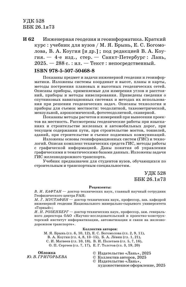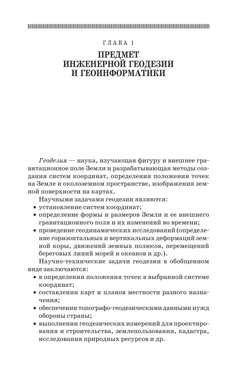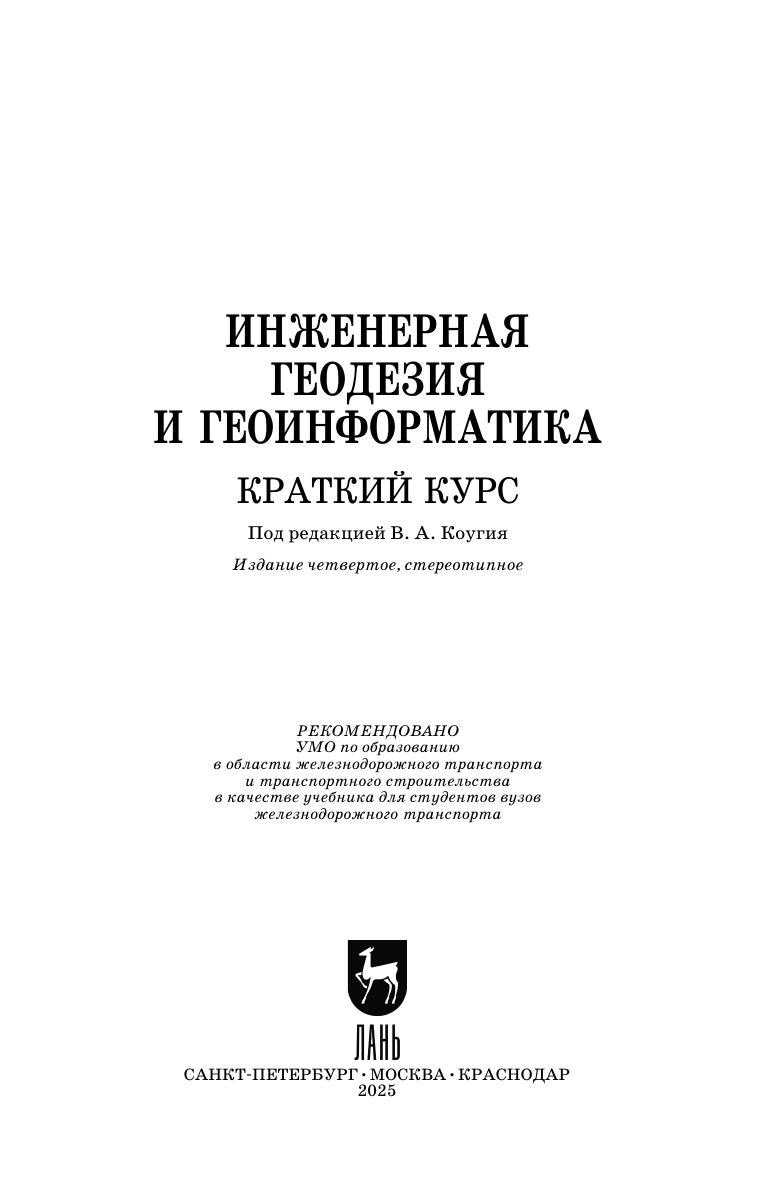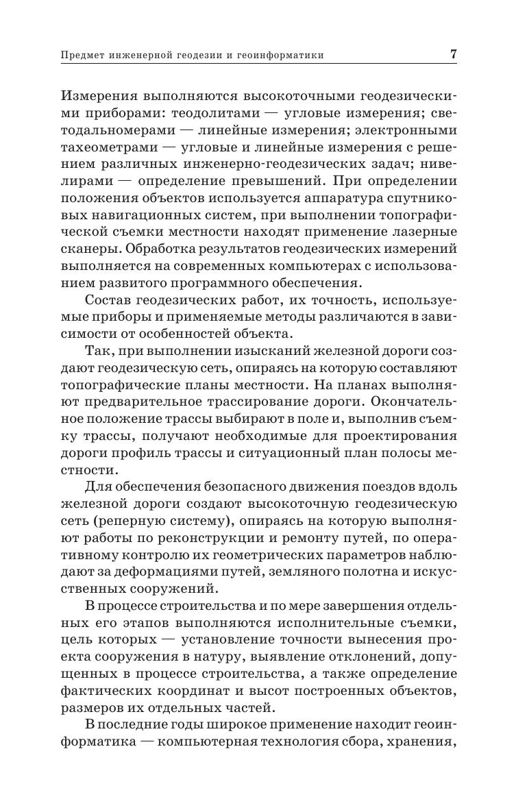 Показаны предмет и задачи инженерной геодезии и геоинформатики. Изложены системы координат и высот, планы и карты, методы построения плановых и высотных геодезических сетей. Описаны приборы, применяемые для измерения углов и расстояний, приборы и методы нивелирования. Приведены сведения о спутниковых навигационных системах и методах их использования при решении геодезических задач. Описаны технология и приборы для съемок местности: теодолитной, тахеометрической, мензульной, аэрокосмической, фототеодолитной, сканерной. Показаны методы расчетов и измерений при вынесении проектов на местность. Рассмотрены геодезические работы при изысканиях и строительстве железных и автомобильных дорог, при текущем содержании пути, при строительстве мостов, тоннелей, зданий, при строительстве и съемке подземных коммуникаций. Изложены основы геоинформационных систем (ГИС) и технологий. Описан комплекс технических средств ГИС, методы работы с графической информацией. Даны понятия об управлении графическими и тематическими базами данных. Изложены задачи ГИС железнодорожного транспорта. Учебник предназначен для студентов вузов, обучающихся по строительным и транспортным специальностям.