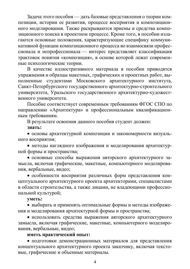 Изложены базовые представления о композиции в архитектуре: история развития, основные термины, виды композиции, композиционные средства. Даны примеры композиционного моделирования и макетирования при разработке архитектурных проектов. Изложена методика композиционного подхода к учебному архитектурному проектированию несложных объектов. Соответствует современным требованиям ФГОС СПО и профессиональным квалификационным требованиям. Адресовано студентам направления СПО «Архитектура», осваивающих МДК 01.02 «Объемно-пространственная композиция с элементами макетирования».