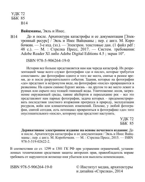 История все больше представляется нам как череда катастроф. Их репрезентацией чаще всего служат фотографии «до и после», которые требуется сопоставить: две фотографии одного и того же места, снятые в разное время, до и после разрушительного события. Здания, которые на фотографии «до» предстают в нетронутом виде, на фотографии «после» превращаются в развалины. На одном снимке бурлит жизнь — на другом то же место лежит в руинах или скрыто под толщей гниющей воды. Уничтожение лесов, загрязнение окружающей среды, таяние айсбергов и пересыхание рек — все это представляют нам парные фотографии, задача которых — продемонстрировать последствия злостного вторжения прогресса в природу, эксплуатации ресурсов, войн или климатических изменений. Похоже, у любой фотографии, снятой сегодня, есть потенциал превратиться в фотографию «до» того опустошительного «после», которому еще предстоит наступить.