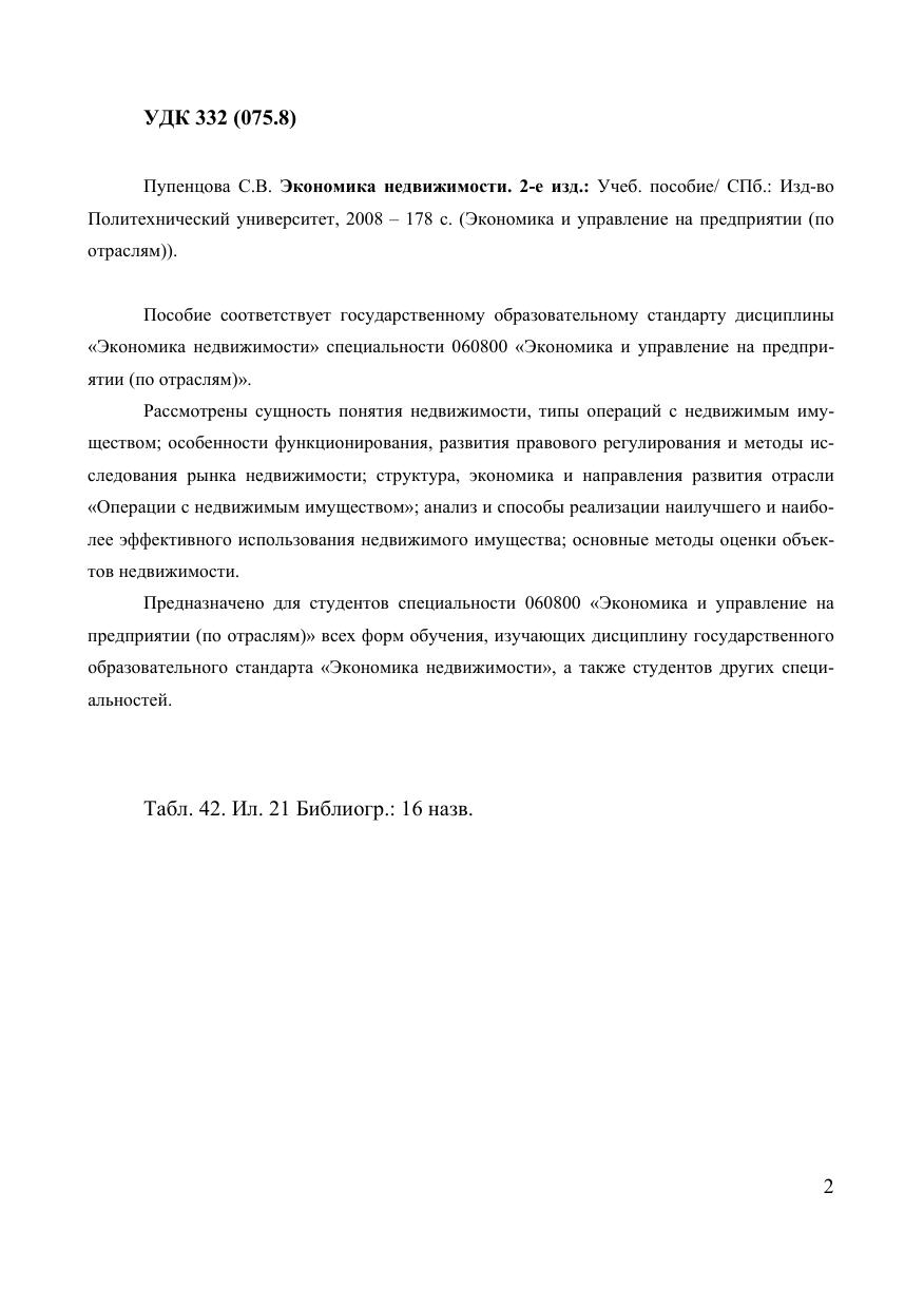 Пособие соответствует государственному образовательному стандарту дисциплины «Экономика недвижимости» специальности 060800 «Экономика и управление на предприятии (по отраслям)». Рассмотрены сущность понятия недвижимости, типы операций с недвижимым имуществом особенности функционирования, развития правового регулирования и методы исследования рынка недвижимости структура, экономика и направления развития отрасли «Операции с недвижимым имуществом» анализ и способы реализации наилучшего и наиболее эффективного использования недвижимого имущества основные методы оценки объектов недвижимости
