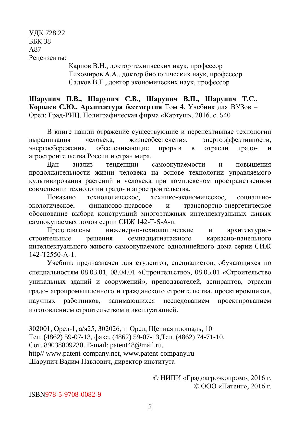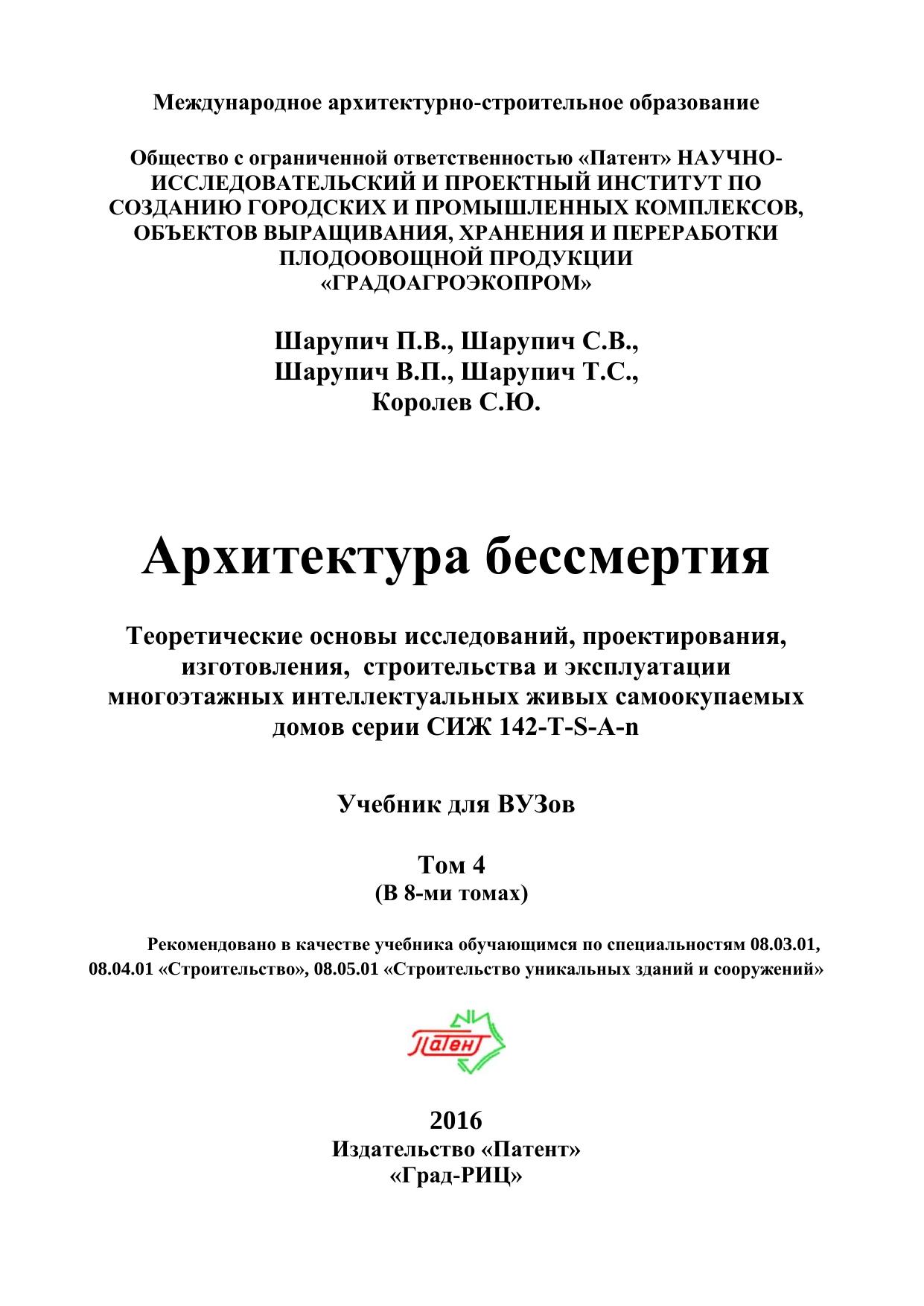 Архитектура бессмертия. Теоретические основы исследований, проектирования, изготовления, строительства и эксплуатации многоэтажных интеллектуальных живых самоокупаемых домов серии СИЖ 142-Т-S-А-n. Т. 4