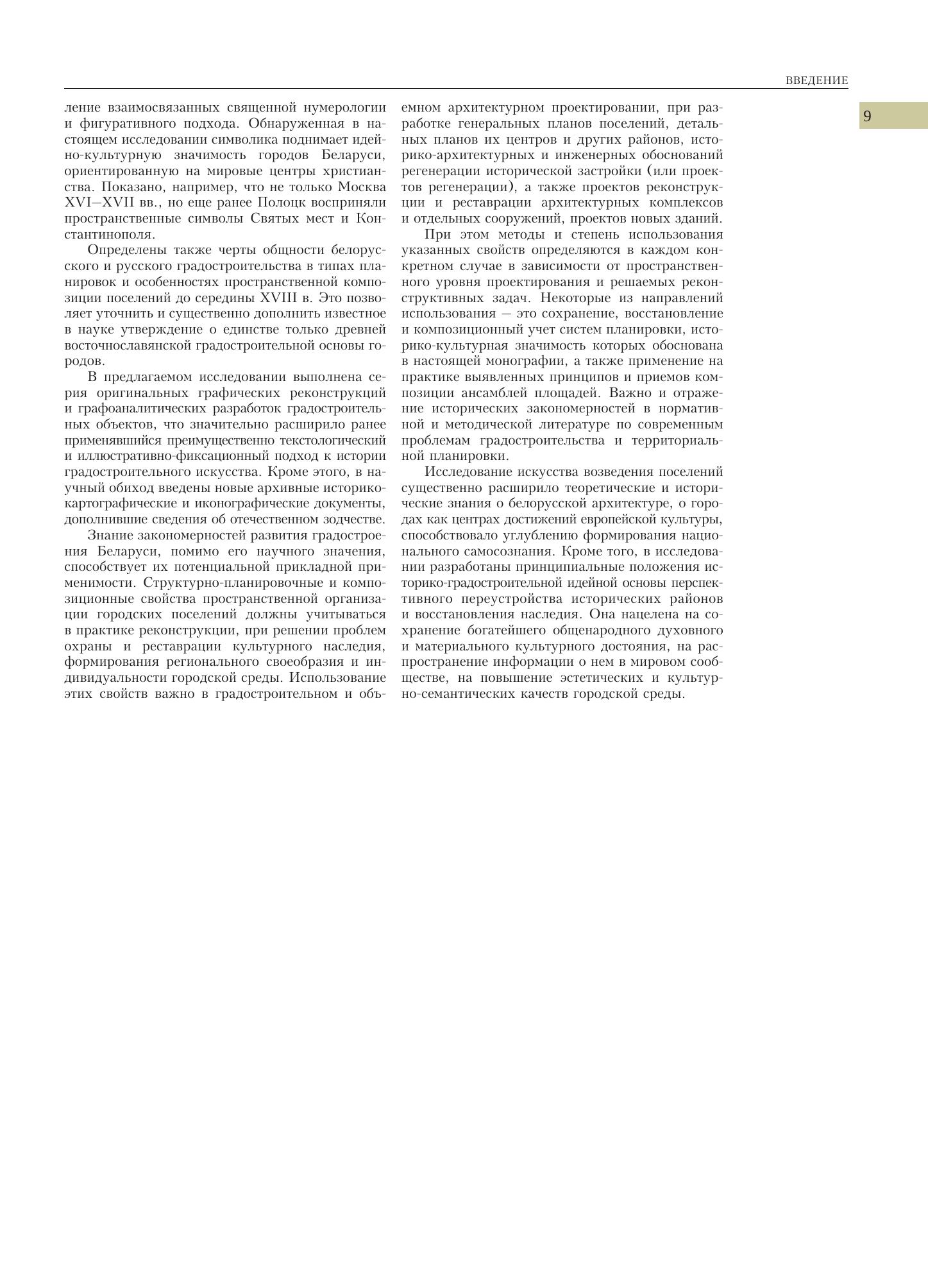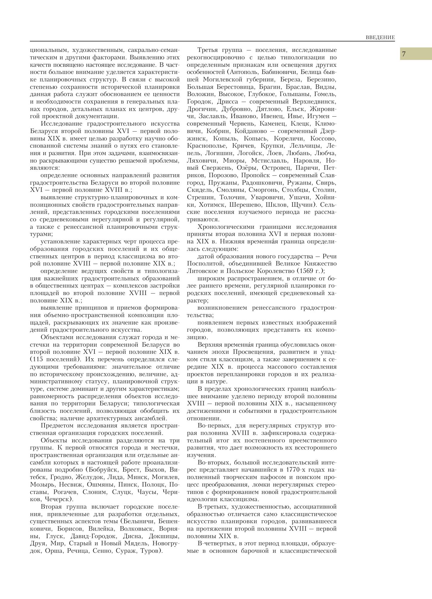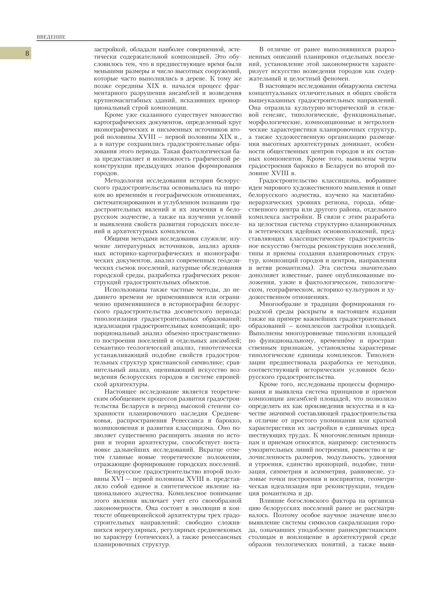 В монографии представлено решение научной проблемы – разработка теории развития градостроительства Беларуси эпох Возрождения и Просвещения (вторая половина XVI – первая половина XIX в.). Впервые проанализировано и обобщено богатейшее и национально специфичное градостроитель ное ис кус ство Средневековья, Ренессанса, барокко и классицизма в его взаимодействии с зодчеством Западной Европы и России. На основе исследования 115 городских поселений Беларуси, анализа около 650 архивных историко-картографических и других изобразительных документов, выполнения более 200 графических реконструкций и графоаналитических построе ний обнаружены закономерности организации поселений: генетические, стилевые, функциональные, морфологические, композиционные, метрологические. Одно из открытий работы – выявление особенностей городов как возведенных наподобие раннехристианских столиц и библейских образов. Монография, итог почти 50-летней научной деятельности автора, нацелена на сохранение общенародного культурного достояния, распространение информации о нем в мировом сообществе, укреп ление связей с другими странами. Предназначена для ученых, архитекторов-проектировщиков, управляющих органов в сфере градостроительства и реставрации памятников, историков, студентов вузов, для всех, интересующихся зодчеством.