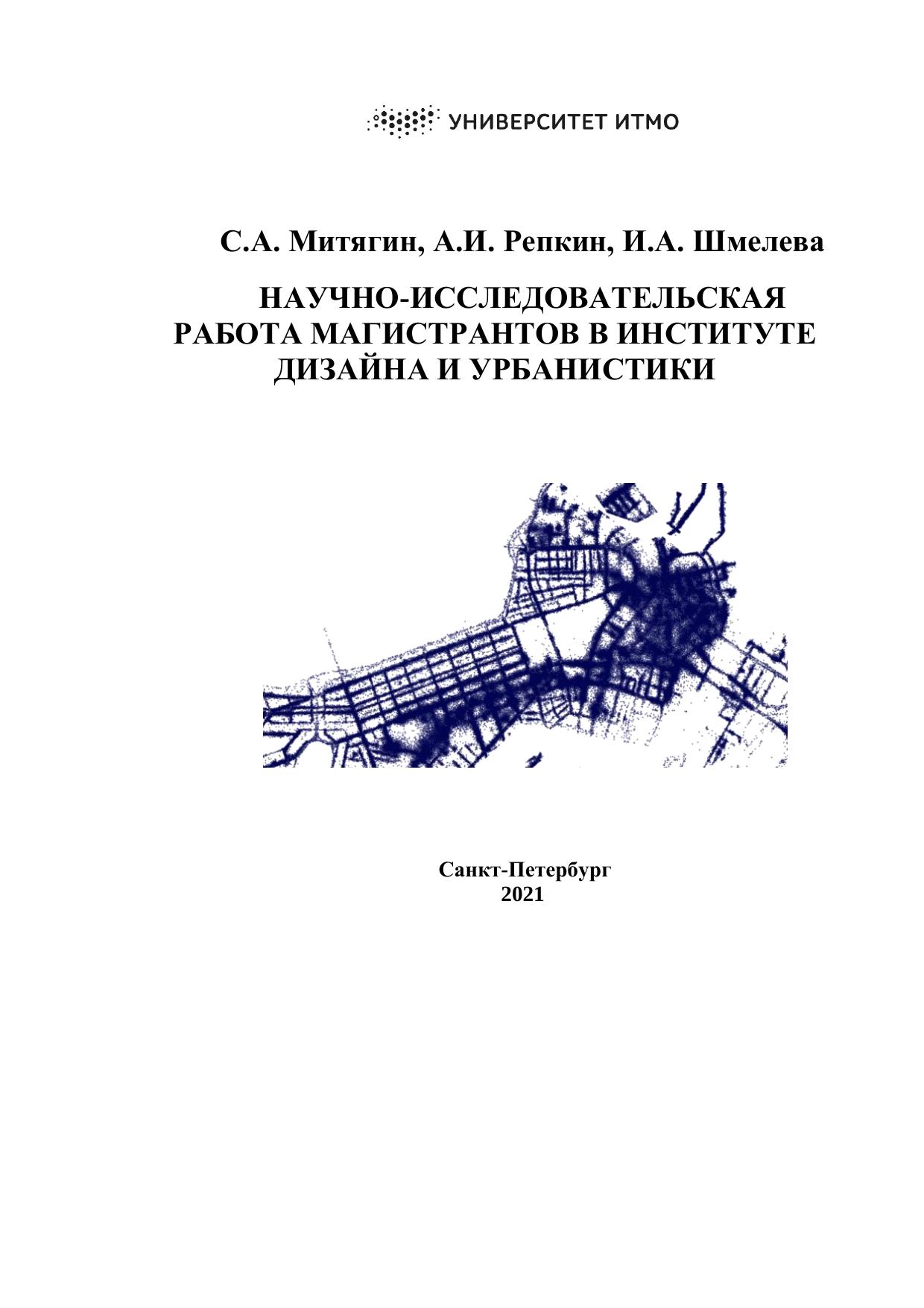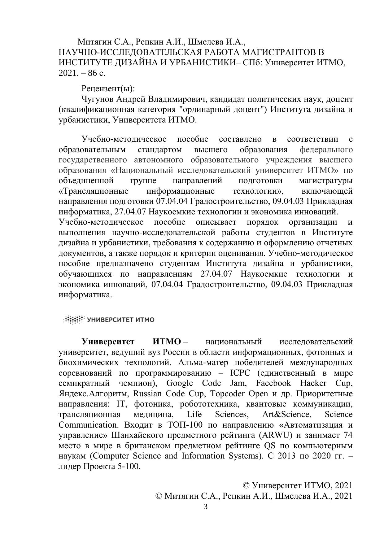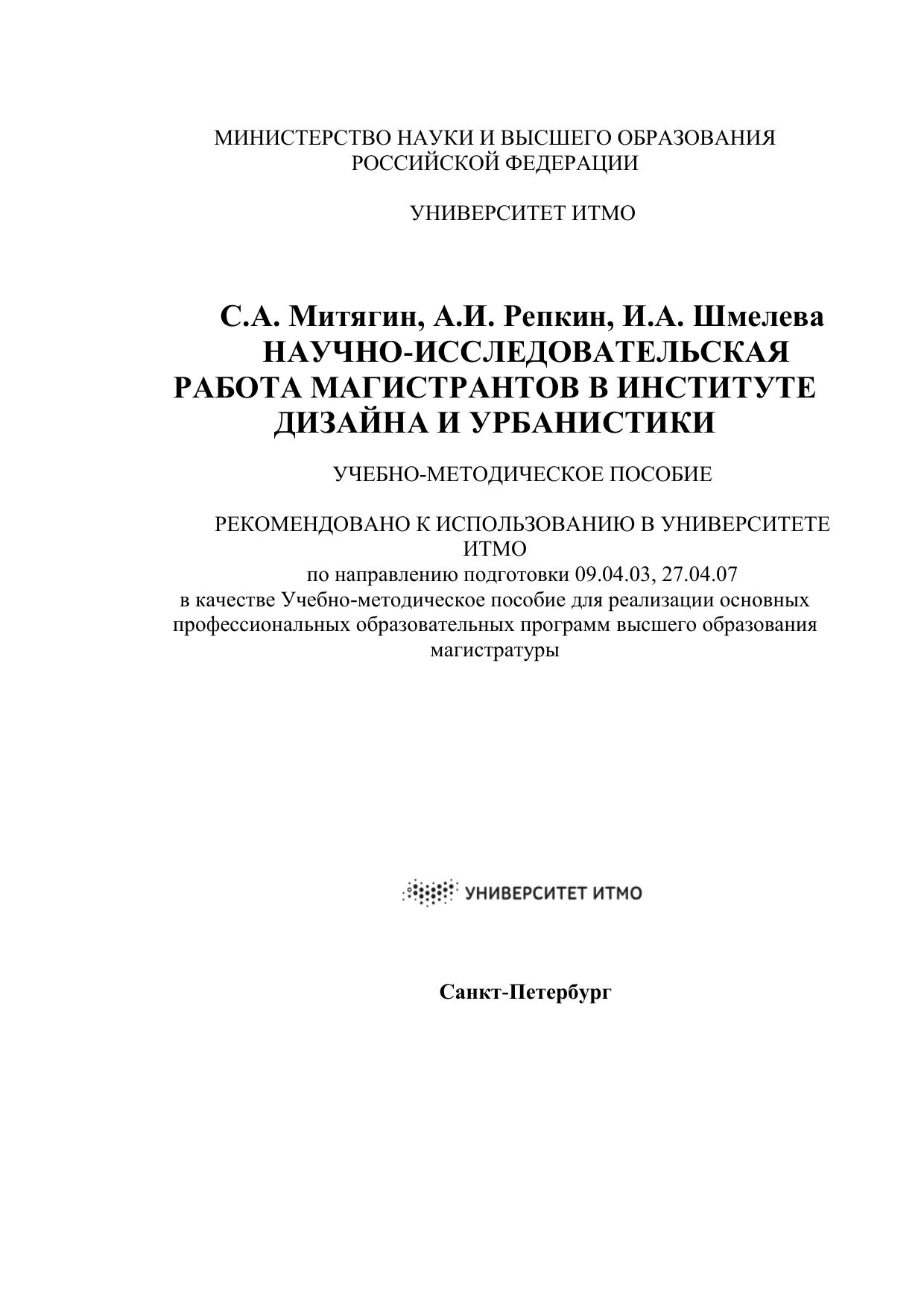 Учебно-методическое пособие составлено в соответствии с образовательным стандартом высшего образования федерального государственного автономного образовательного учреждения высшего образования «Национальный исследовательский университет ИТМО» по объединенной группе направлений подготовки магистратуры «Трансляционные информационные технологии», включающей направления подготовки 07.04.04 Градостроительство, 09.04.03 Прикладная информатика, 27.04.07 Наукоемкие технологии и экономика инноваций. Учебно-методическое пособие описывает порядок организации и выполнения научно-исследовательской работы студентов в Институте дизайна и урбанистики, требования к содержанию и оформлению отчетных документов, а также порядок и критерии оценивания. Учебно-методическое пособие предназначено студентам Института дизайна и урбанистики, обучающихся по направлениям 27.04.07 Наукоемкие технологии и экономика инноваций, 07.04.04 Градостроительство, 09.04.03 Прикладная информатика.