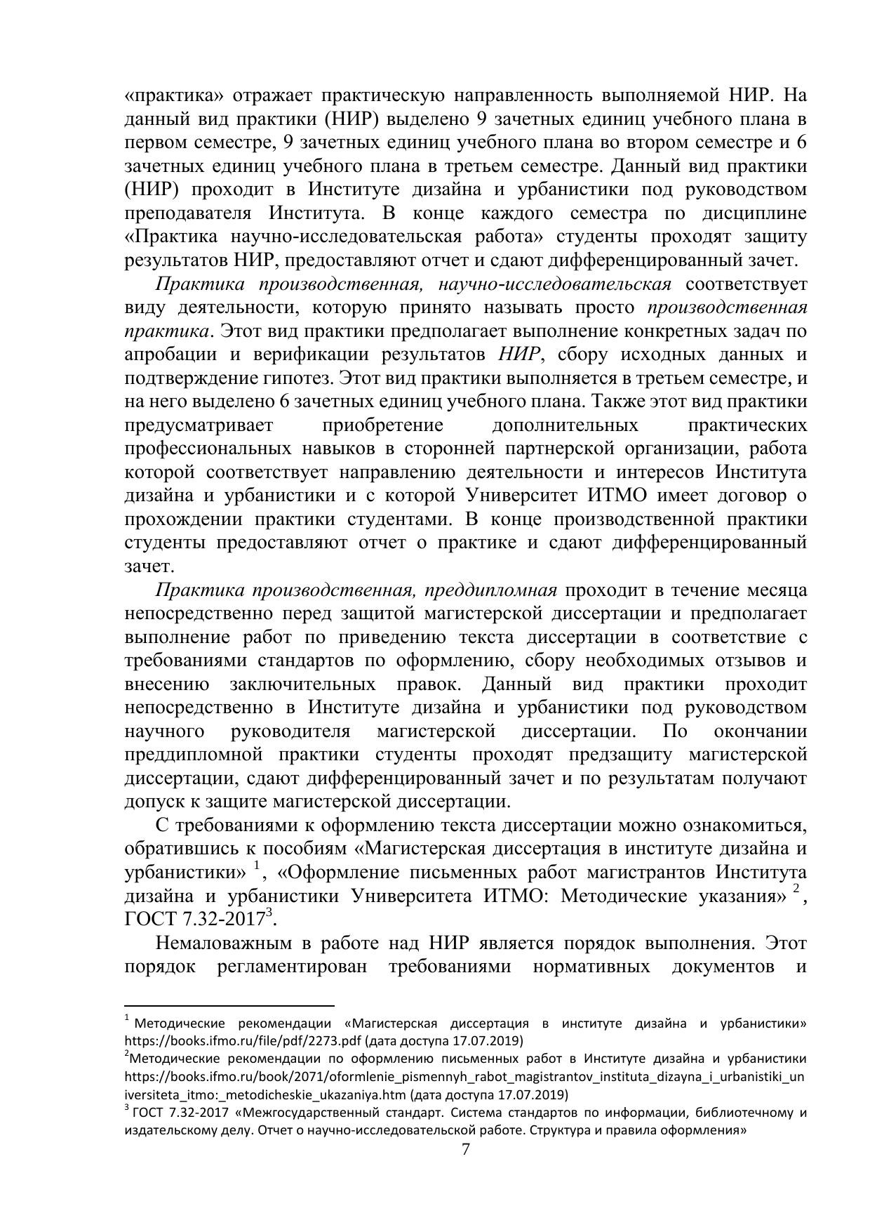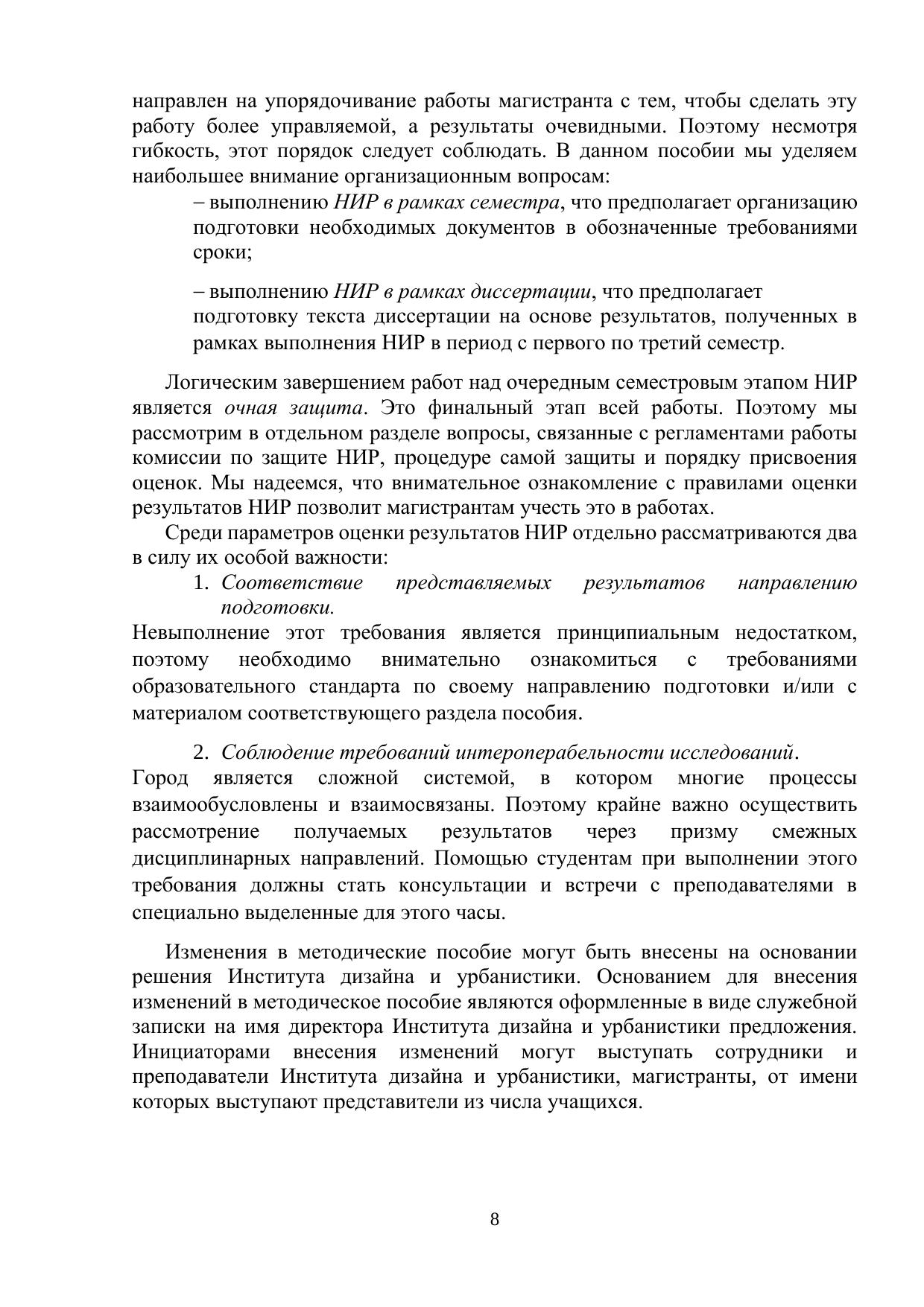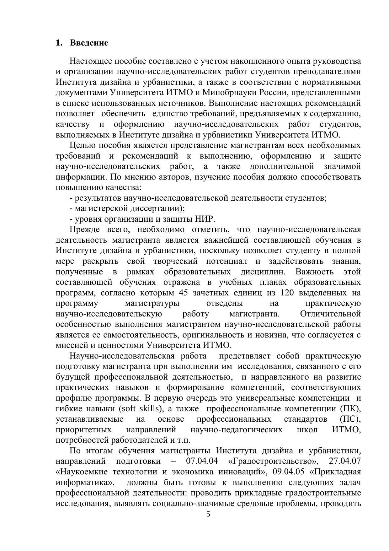 Учебно-методическое пособие составлено в соответствии с образовательным стандартом высшего образования федерального государственного автономного образовательного учреждения высшего образования «Национальный исследовательский университет ИТМО» по объединенной группе направлений подготовки магистратуры «Трансляционные информационные технологии», включающей направления подготовки 07.04.04 Градостроительство, 09.04.03 Прикладная информатика, 27.04.07 Наукоемкие технологии и экономика инноваций. Учебно-методическое пособие описывает порядок организации и выполнения научно-исследовательской работы студентов в Институте дизайна и урбанистики, требования к содержанию и оформлению отчетных документов, а также порядок и критерии оценивания. Учебно-методическое пособие предназначено студентам Института дизайна и урбанистики, обучающихся по направлениям 27.04.07 Наукоемкие технологии и экономика инноваций, 07.04.04 Градостроительство, 09.04.03 Прикладная информатика.
