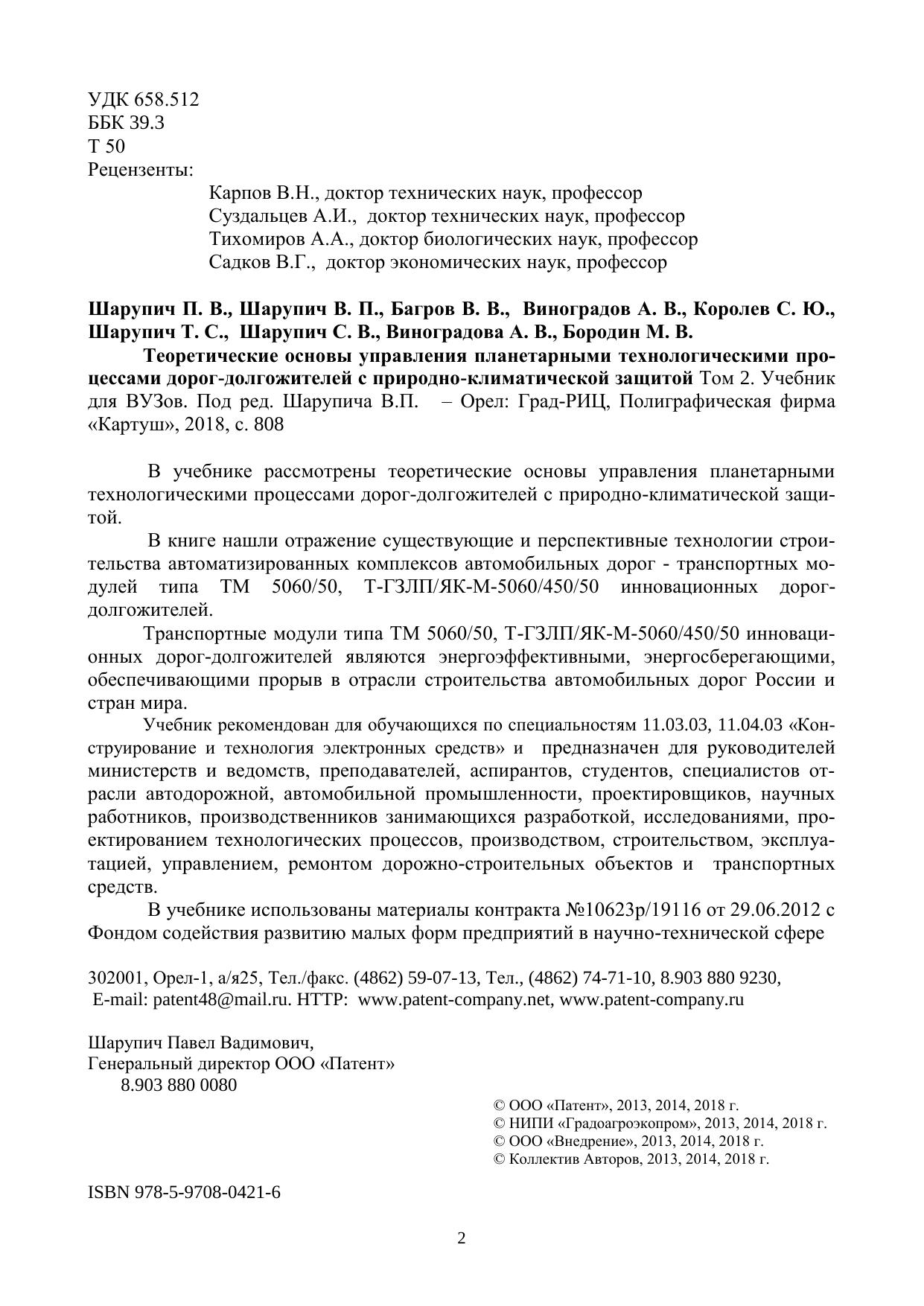 Авторы: Шарупич П.В., Шарупич В.П., Багров В.В., Виноградов А.В., Королёв С.Ю., Шарупич Т.С., Шарупич С.В., Виноградова А.В., Бородин М.В.