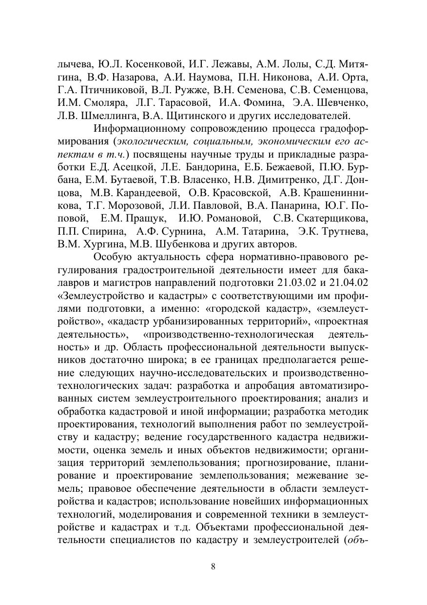 В учебном пособии изложены концептуальные основы и охарактеризованы технологии нормативно-правового регулирования градостроительной деятельности в Российской Федерации. Представлены результаты анализа и обобщения социальных, профессиональных и законосообразной трактовок понятий «градостроительство» и «градостроительная деятельность», обозначены цели, задачи и основные принципы градостроительного дела. Освещены современные методологические подходы и интерпретированы принципы законотворчества и нормотворчества в градостроительной сфере, приведены нормативно-правовые документы, регулирующие сегодня процесс градообразования. Сформирован глоссарий, использование которого в образовательном процессе позволит учащимся оперативно освоить специфическую терминологию градостроительства. В соответствии с действующим градостроительным законодательством Российской Федерации в отдельных разделах раскрыты тематика и проблематика территориального планирования, градостроительного зонирования и планировки территорий. Специальный раздел посвящен нормативам градостроительного проектирования как инструментам градообразования. Самостоятельным блоком представлены цели, задачи, принципы и технологии создания и ведения ИСОГД, проанализированы предпосылки возникновения и раскрыто содержание понятия «информационные системы обеспечения градостроительной деятельности». Учебное пособие предназначено для студентов бакалавриата и магистратуры следующих направлений подготовки: «Землеустройство и кадастры», «Градостроительство», «Строительство», а также для всех субъектов градостроительных отношений.