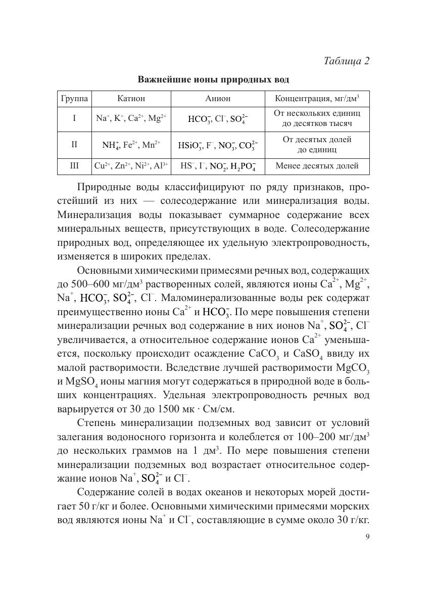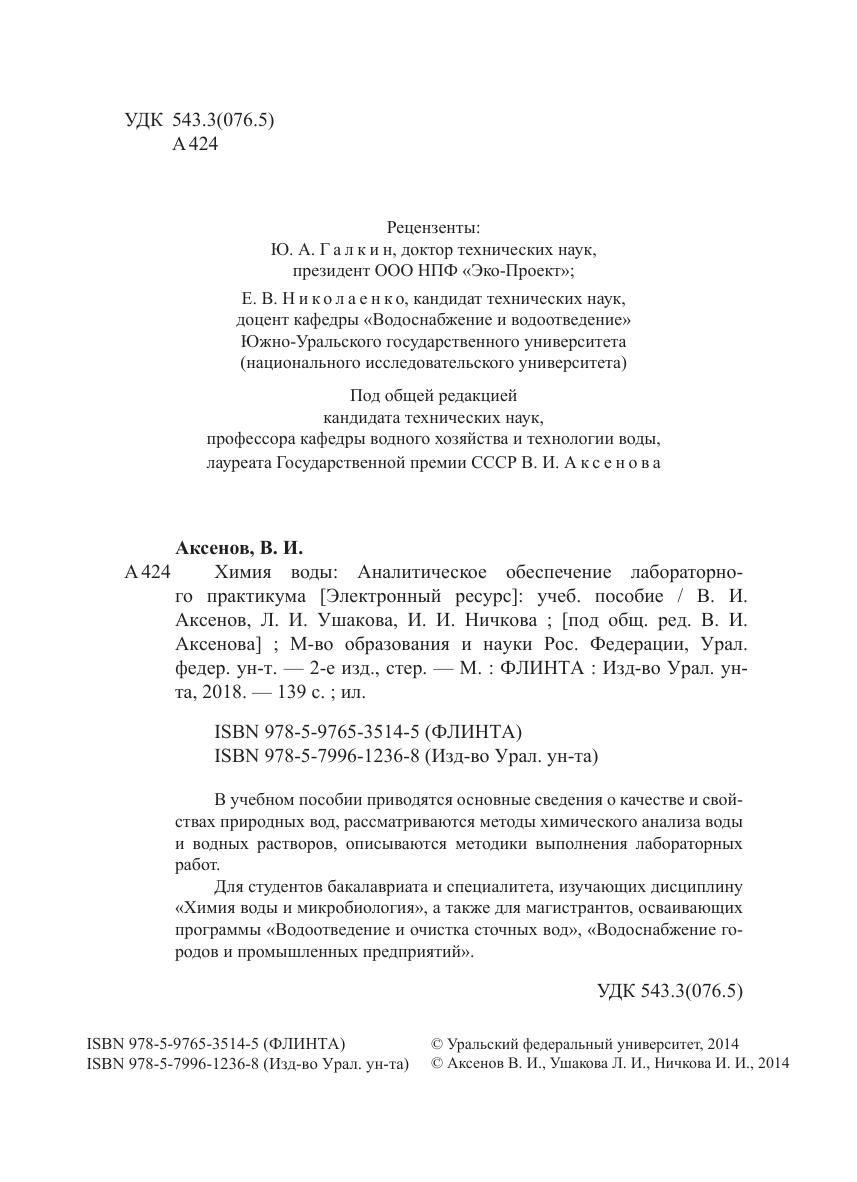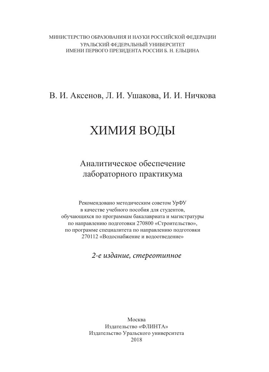 В учебном пособии приводятся основные сведения о качестве и свойствах природных вод, рассматриваются методы химического анализа воды и водных растворов, описываются методики выполнения лабораторных работ.
