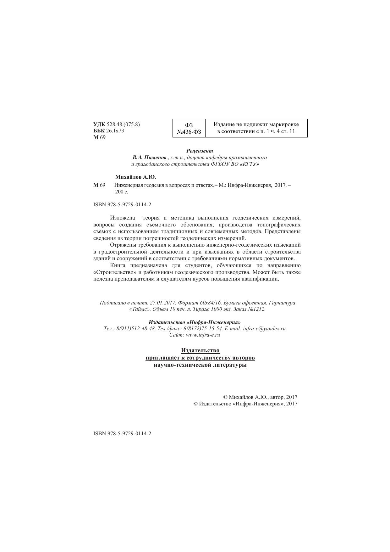 Изложена теория и методика выполнения геодезических измерений, вопросы создания съемочного обоснования, производства топографических съемок с использованием традиционных и современных методов. Представлены сведения из теории погрешностей геодезических измерений. Отражены требования к выполнению инженерно-геодезических изысканий в градостроительной деятельности и при изысканиях в области строительства зданий и сооружений в соответствии с требованиями нормативных документов. Книга предназначена для студентов, обучающихся по направлению «Строительство» и работникам геодезического производства. Может быть также полезна преподавателям и слушателям курсов повышения квалификации.