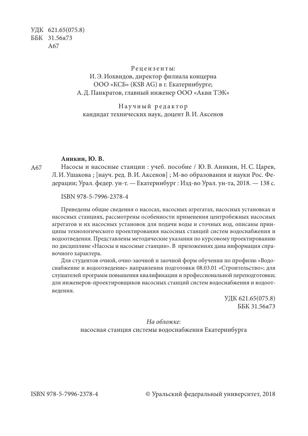 Приведены общие сведения о насосах, насосных агрегатах, насосных установках и насосных станциях, рассмотрены особенности применения центробежных насосных агрегатов и их насосных установок для подачи воды и сточных вод, описаны принципы технологического проектирования насосных станций систем водоснабжения и водоотведения. Представлены методические указания по курсовому проектированию по дисциплине «Насосы и насосные станции». В приложениях дана информация справочного характера. Для студентов очной, очно-заочной и заочной форм обучения по профилю «Водоснабжение и водоотведение» направления подготовки 08.03.01 «Строительство»; для слушателей программ повышения квалификации и профессиональной переподготовки; для инженеров-проектировщиков насосных станций систем водоснабжения и водоотведения.