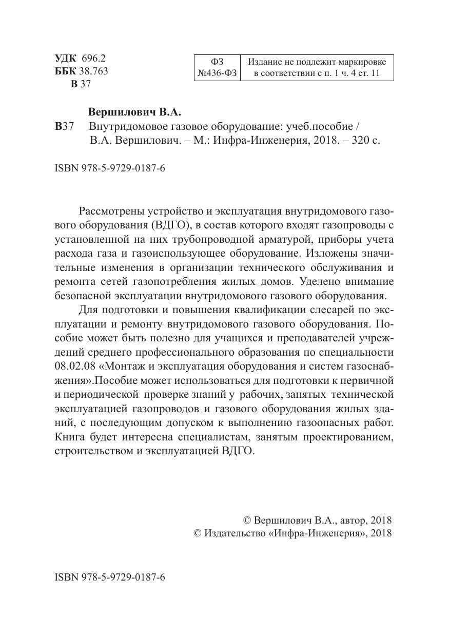Рассмотрены устройство и эксплуатация внутридомового газового оборудования (ВДГО), в состав которого входят газопроводы с установленной на них трубопроводной арматурой, приборы учета расхода газа и газоиспользующее оборудование. Изложены значительные изменения в организации технического обслуживания и ремонта сетей газопотребления жилых домов. Уделено внимание безопасной эксплуатации внутридомового газового оборудования.