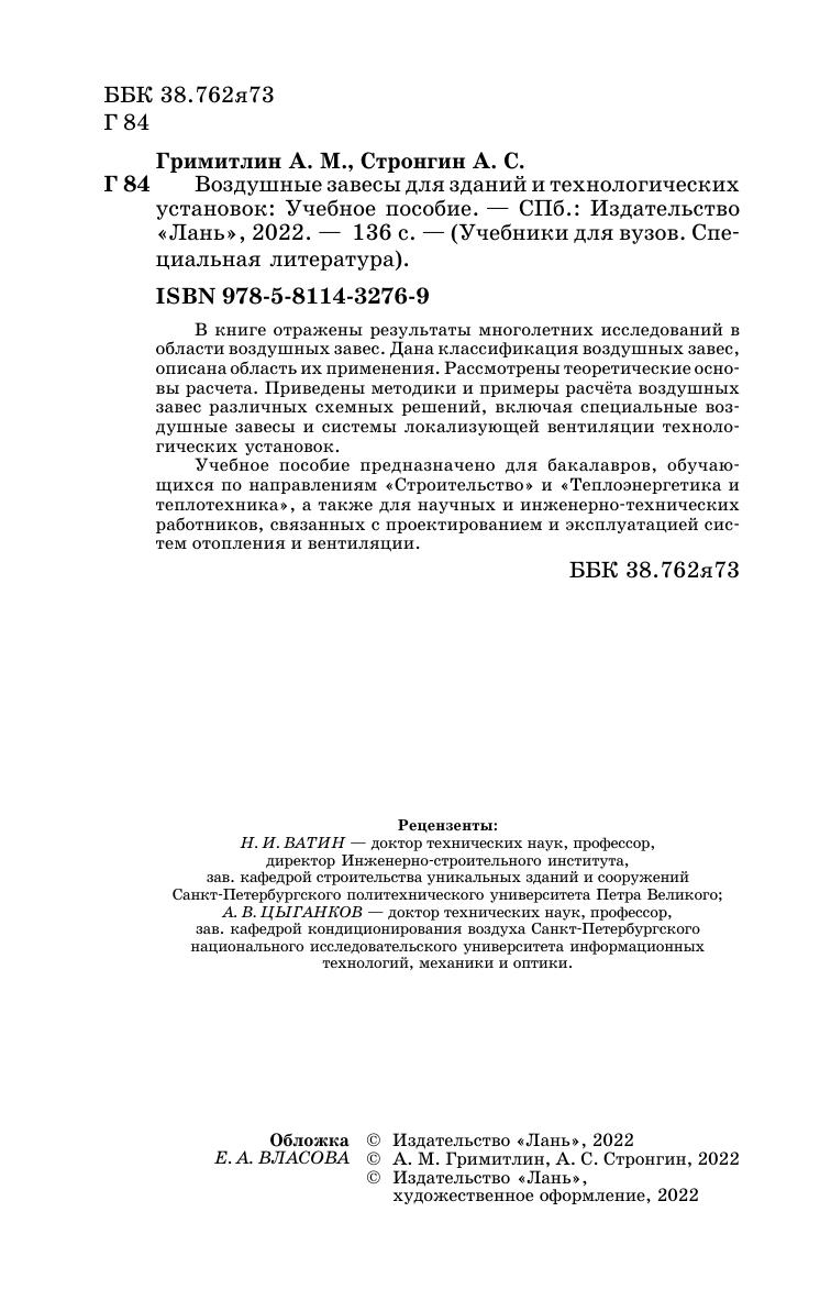 В книге отражены результаты многолетних исследований в области воздушных завес. Дана классификация воздушных завес, описана область их применения. Рассмотрены теоретические основы расчёта. Приведены методики и примеры расчёта воздушных завес различных схемных решений, включая специальные воздушные завесы и системы локализующей вентиляции технологических установок. Учебное пособие предназначено для бакалавров, обучающихся по направлениям «Строительство» и «Теплоэнергетика и теплотехника», а также для научных и инженерно-технических работников, связанных с проектированием и эксплуатацией систем отопления и вентиляции.