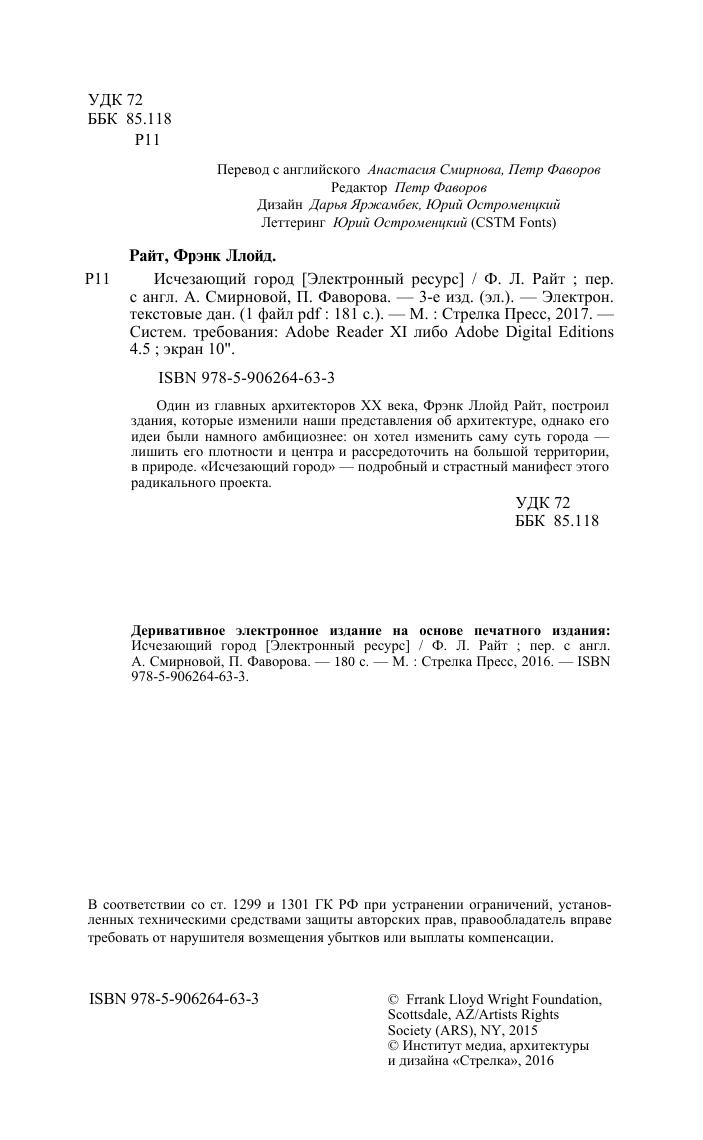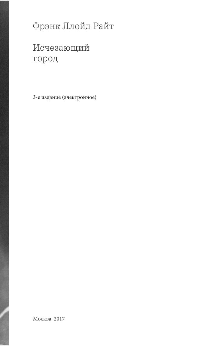 Один из главных архитекторов XX века, Фрэнк Ллойд Райт, построил здания, которые изменили наши представления об архитектуре, однако его идеи были намного амбициознее: он хотел изменить саму суть города — лишить его плотности и центра и рассредоточить на большой территории, в природе. «Исчезающий город» — подробный и страстный манифест этого радикального проекта.
