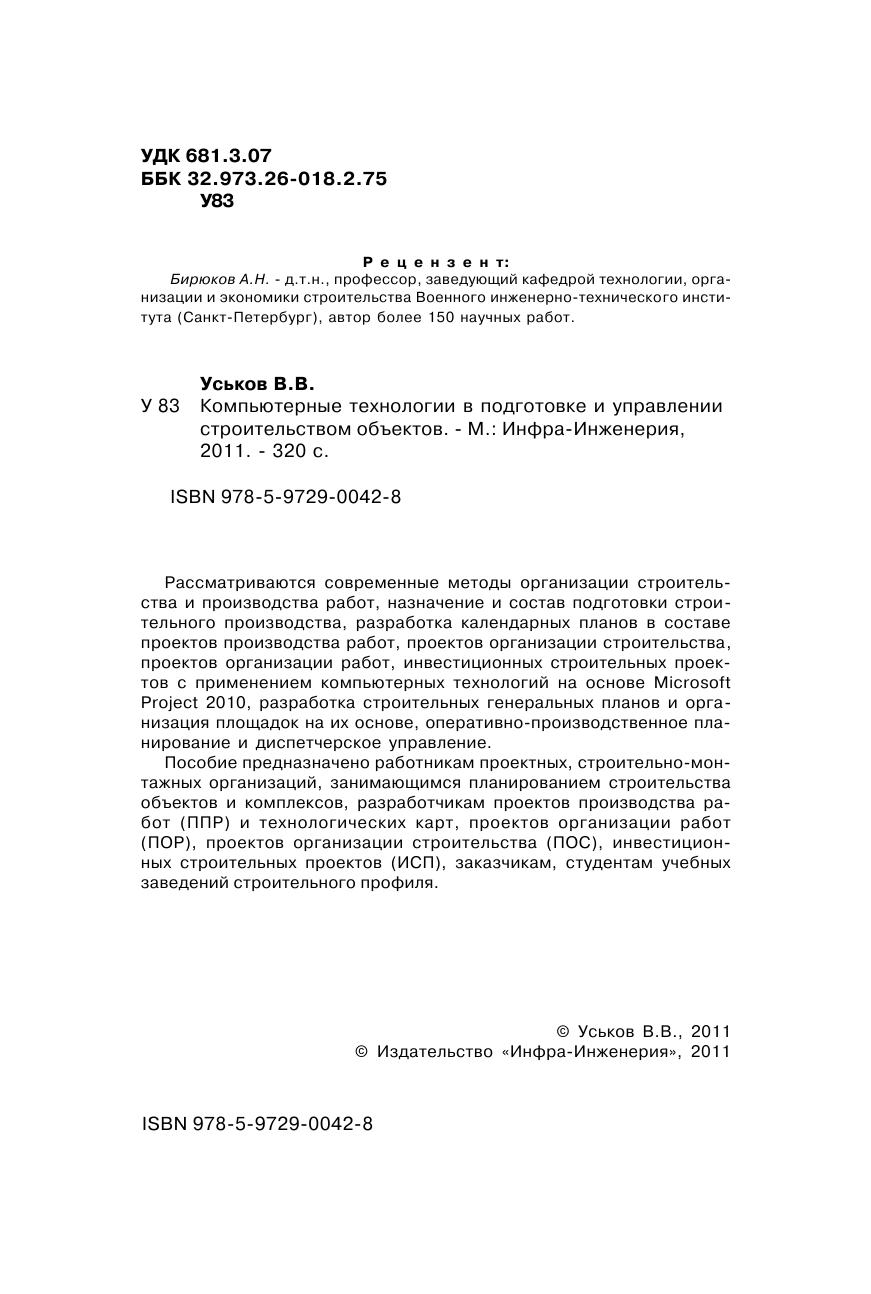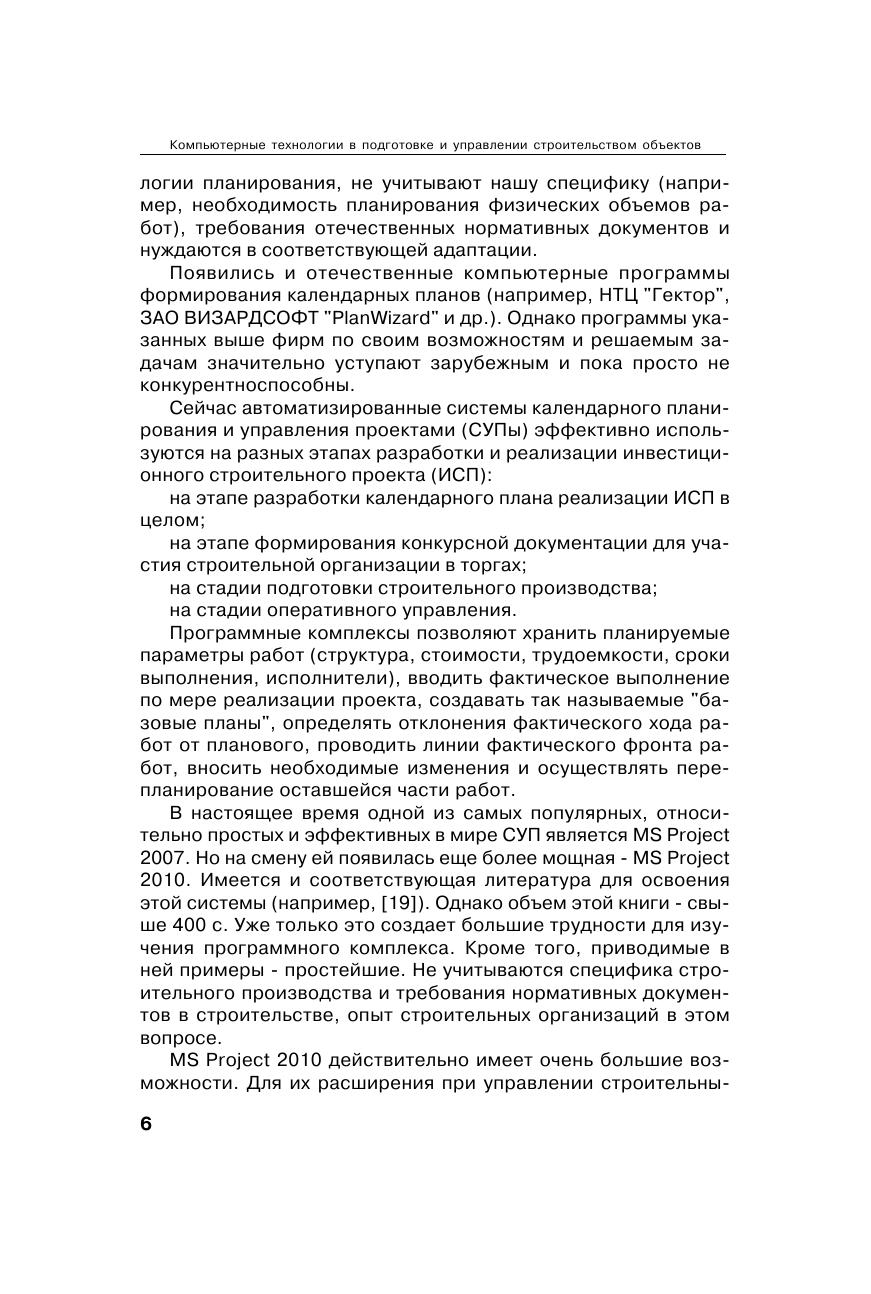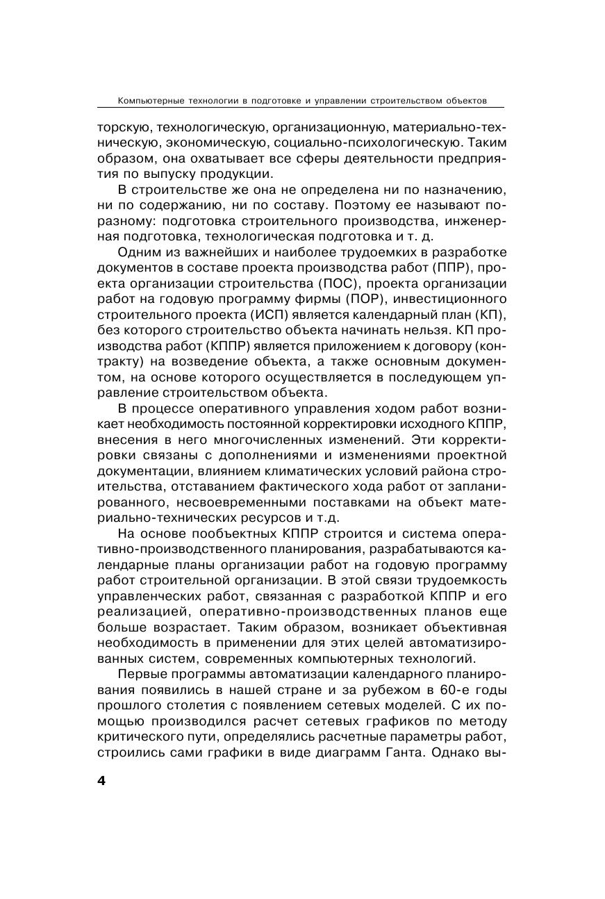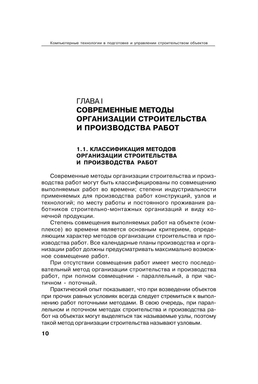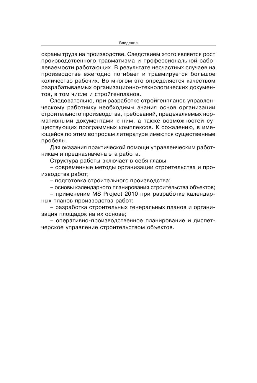 Рассматриваются современные методы организации строительства и производства работ, назначение и состав подготовки строительного производства, разработка календарных планов в составе проектов производства работ, проектов организации строительства, проектов организации работ, инвестиционных строительных проектов с применением компьютерных технологий на основе Microsoft Project 2010, разработка строительных генеральных планов и организация площадок на их основе, оперативно-производственное планирование и диспетчерское управление. Пособие предназначено работникам проектных, строительно-монтажных организаций, занимающимся планированием строительства объектов и комплексов, разработчикам проектов производства работ (ППР) и технологических карт, проектов организации работ (ПОР), проектов организации строительства (ПОС), инвестиционных строительных проектов (ИСП), заказчикам, студентам учебных заведений строительного профиля.