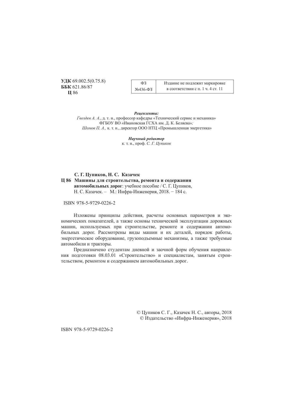 Изложены принципы действия, расчеты основных параметров и экономических показателей, а также основы технической эксплуатации дорожных машин, используемых при строительстве, ремонте и содержании автомобильных дорог. Рассмотрены виды машин и их деталей, порядок работы, энергетическое оборудование, грузоподъемные механизмы, а также требуемые автомобили и тракторы.